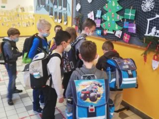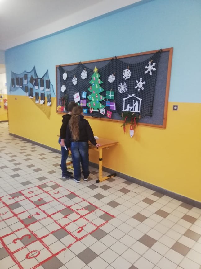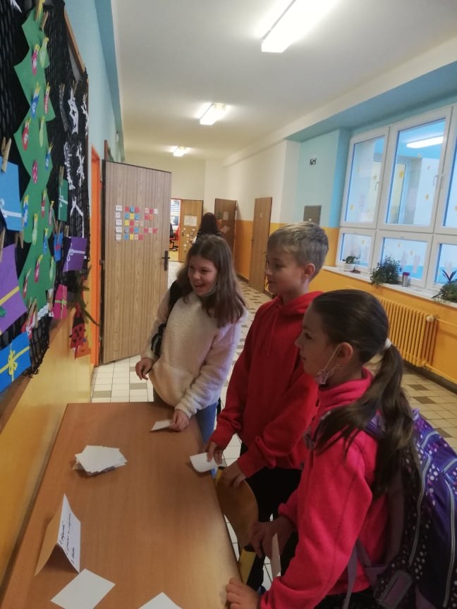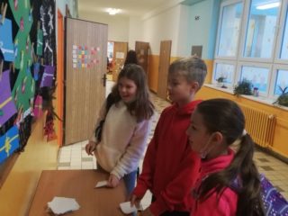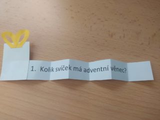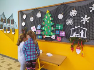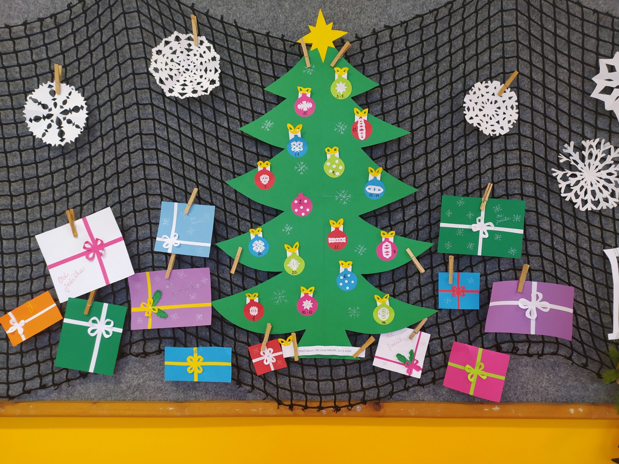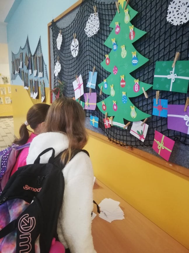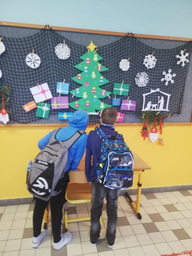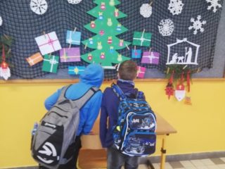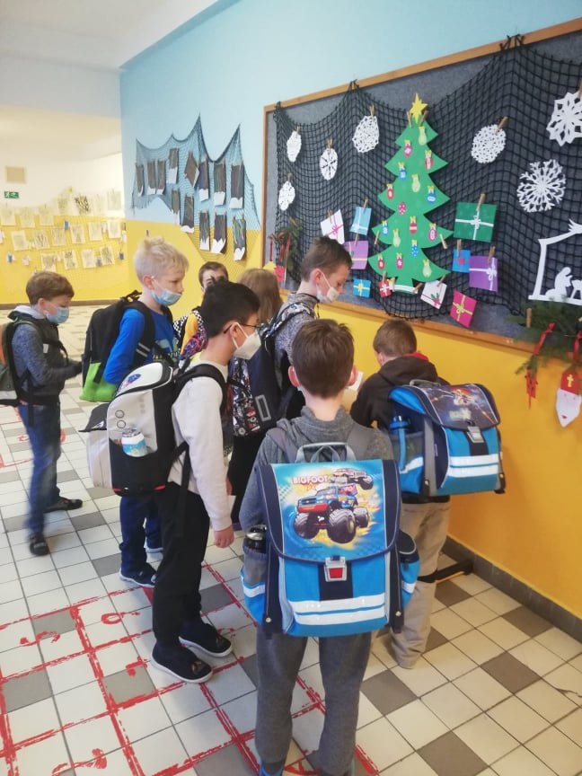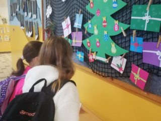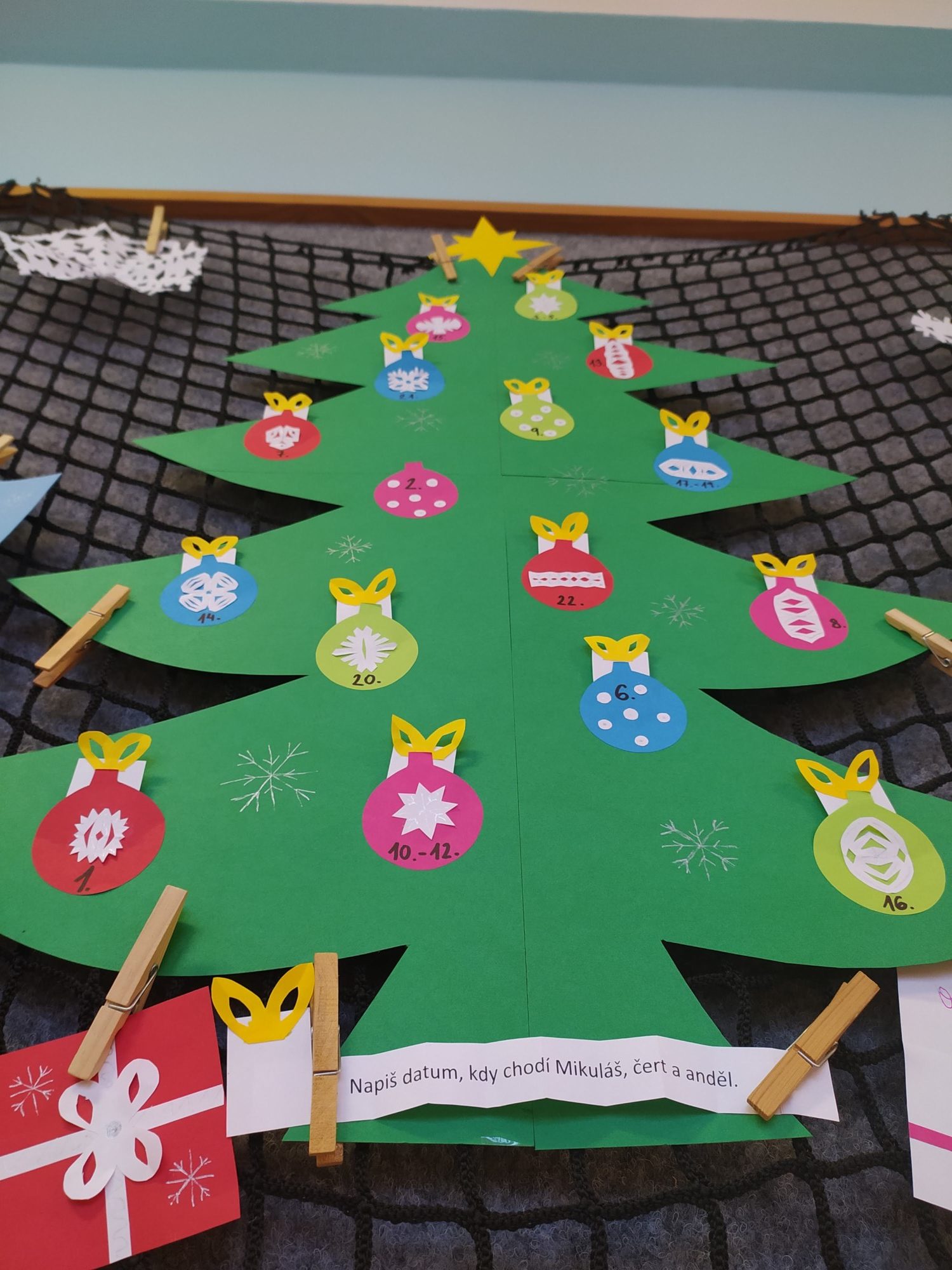 Rozhodly jsme se, že zpestříme adventní dobu našim páťákům. V tom naší paní asistentku Káju osvítilo. „Uděláme adventní kalendář pro celý první stupeň na nové budově.“ Začalo vymýšlení a tvoření úkolů. Také jsme musely přijít na to, kde děti zadání na každý den najdou. Nakonec jsme vytvořily stromeček s ozdobičkami, přičemž v každé je úloha schovaná. Na víkend mají děti větší úkol, který pak vystavíme na nástěnce. Máme velikou radost, když každé ráno vidíme, jak se děti hrnou ke stromečku, a zjišťují, co mají dnes splnit.