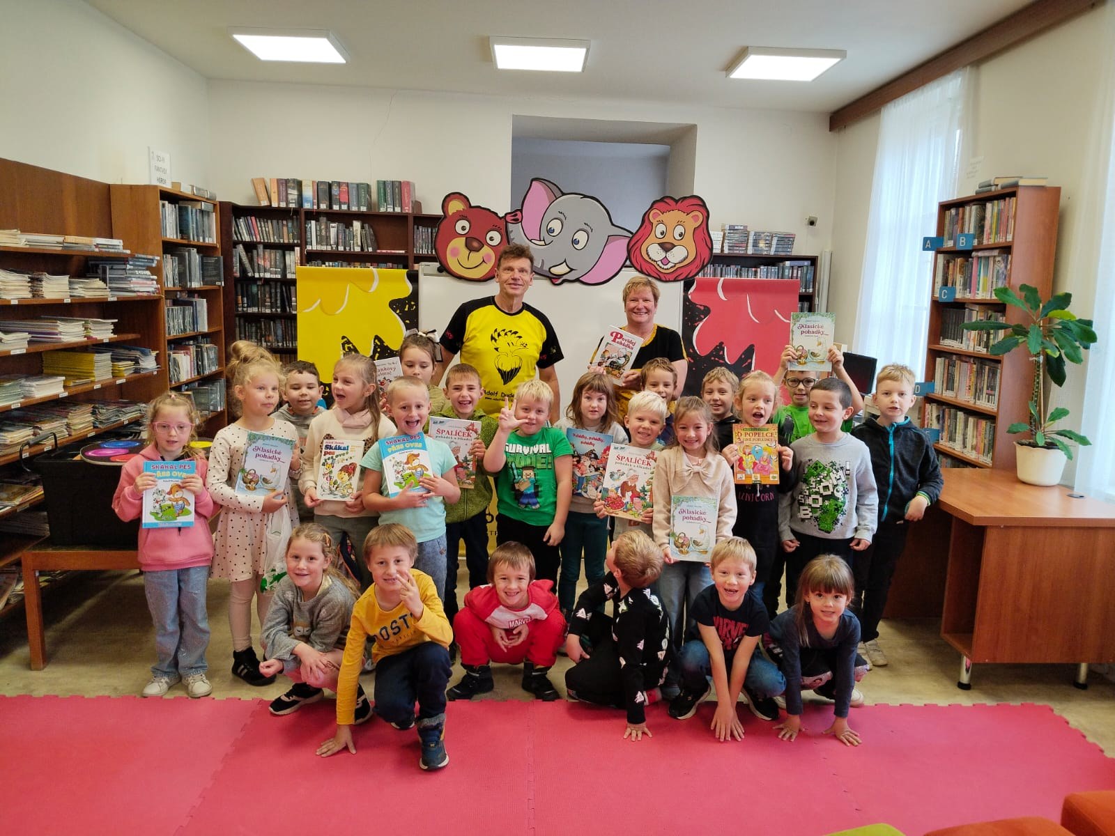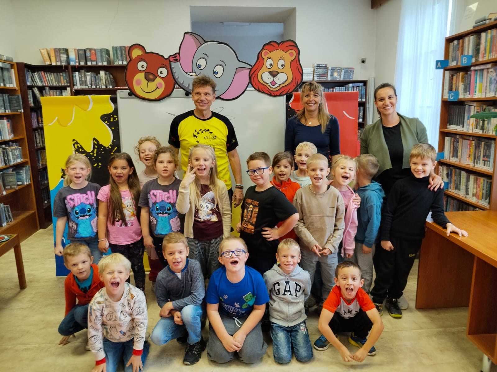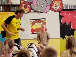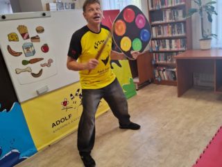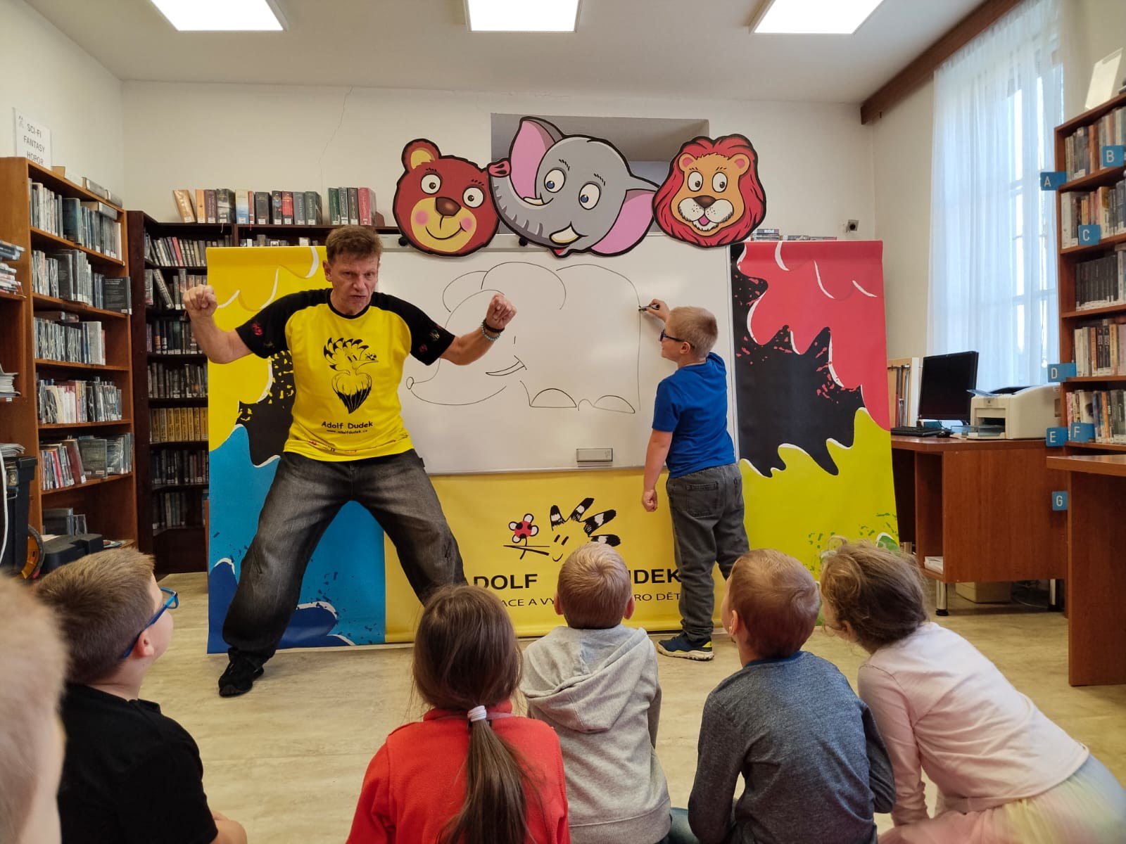 Ve středu 8. října šly děti na besedu s kreslířem Adolfem Dudkem do knihovny. Bylo s ním velice veselo, děti kreslily, říkaly legrační říkanky, zpívaly, cvičily. Někteří prvňáci si také přinesli knížky, které pan Dudek ilustroval, k podpisu. Jak veselá tato akce byla, uvidíte na fotkách.
