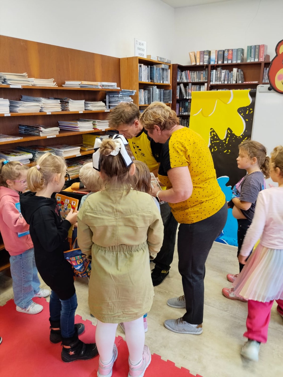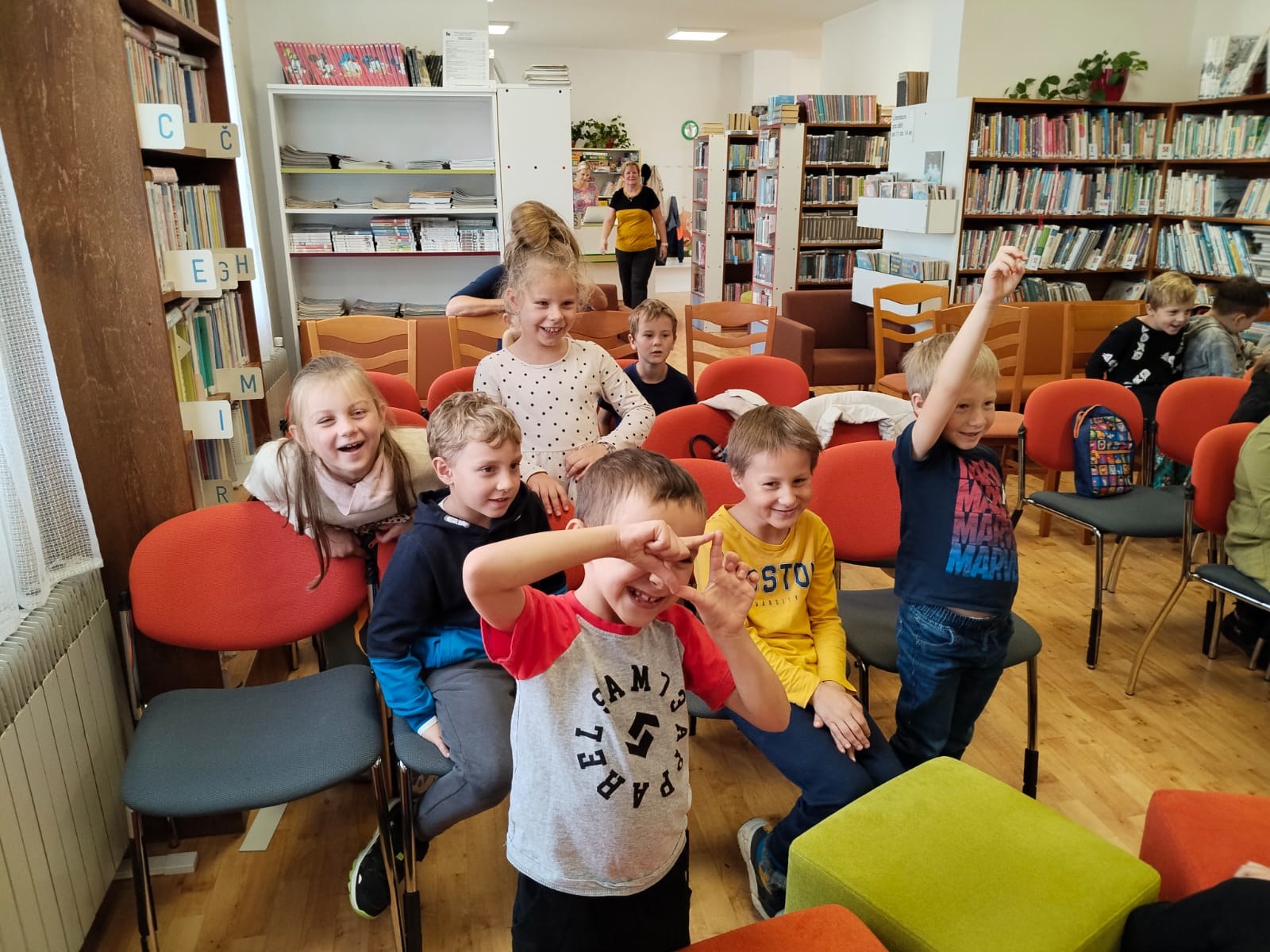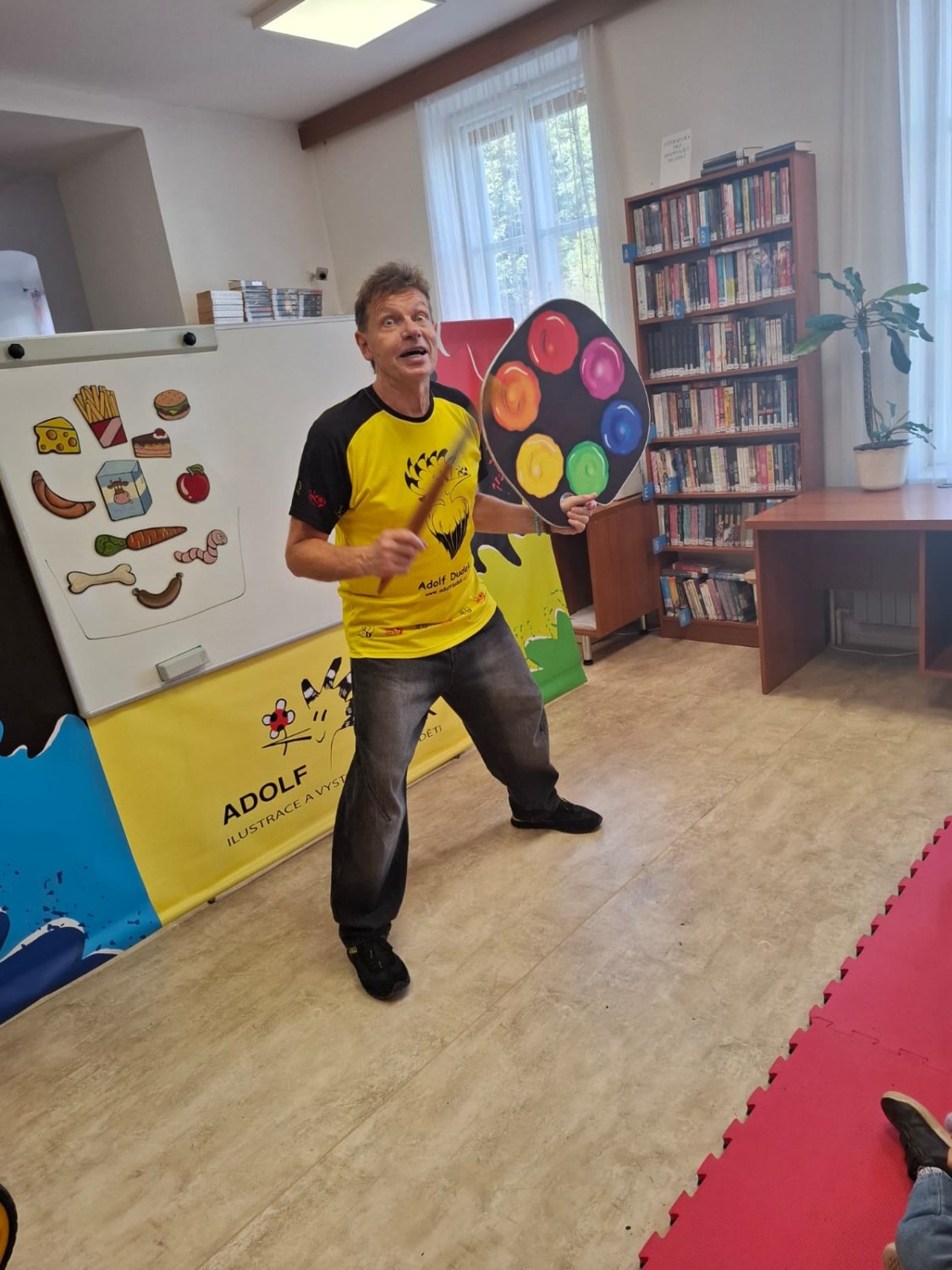 Ve středu 8. října šly děti na besedu s kreslířem Adolfem Dudkem do knihovny. Bylo s ním velice veselo, děti kreslily, říkaly legrační říkanky, zpívaly, cvičily. Někteří prvňáci si také přinesli knížky, které pan Dudek ilustroval, k podpisu. Jak veselá tato akce byla, uvidíte na fotkách.