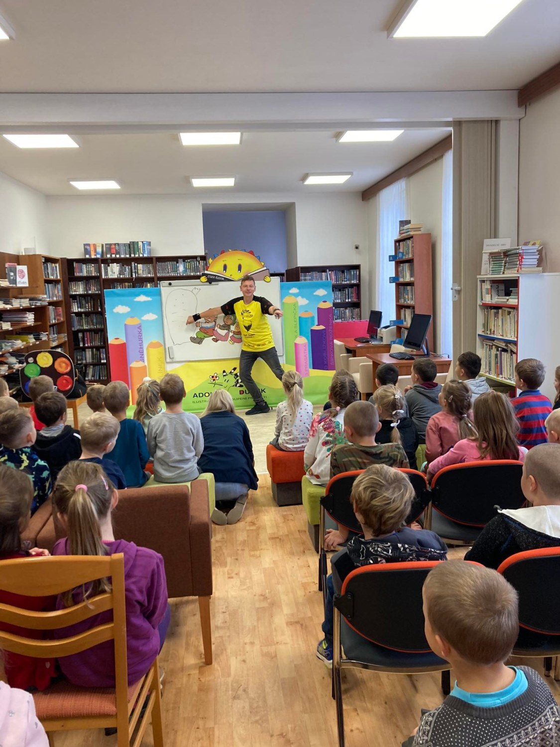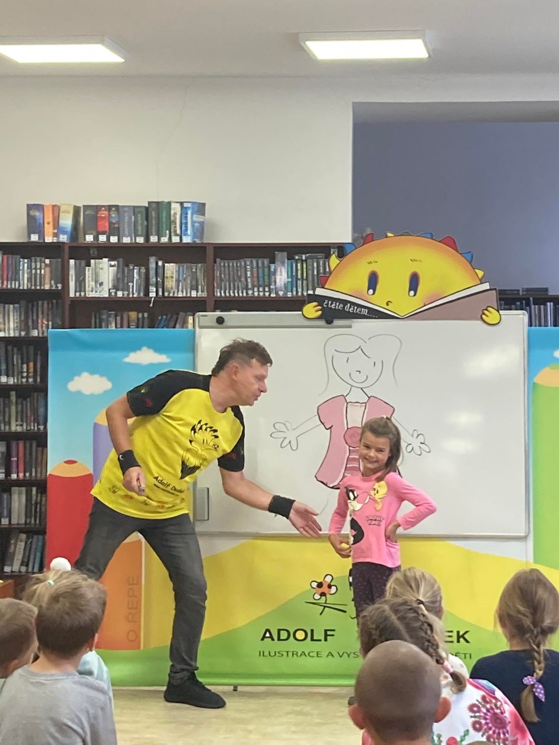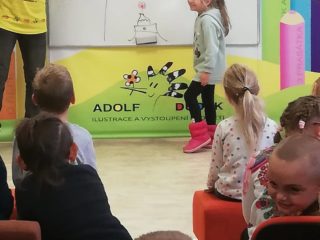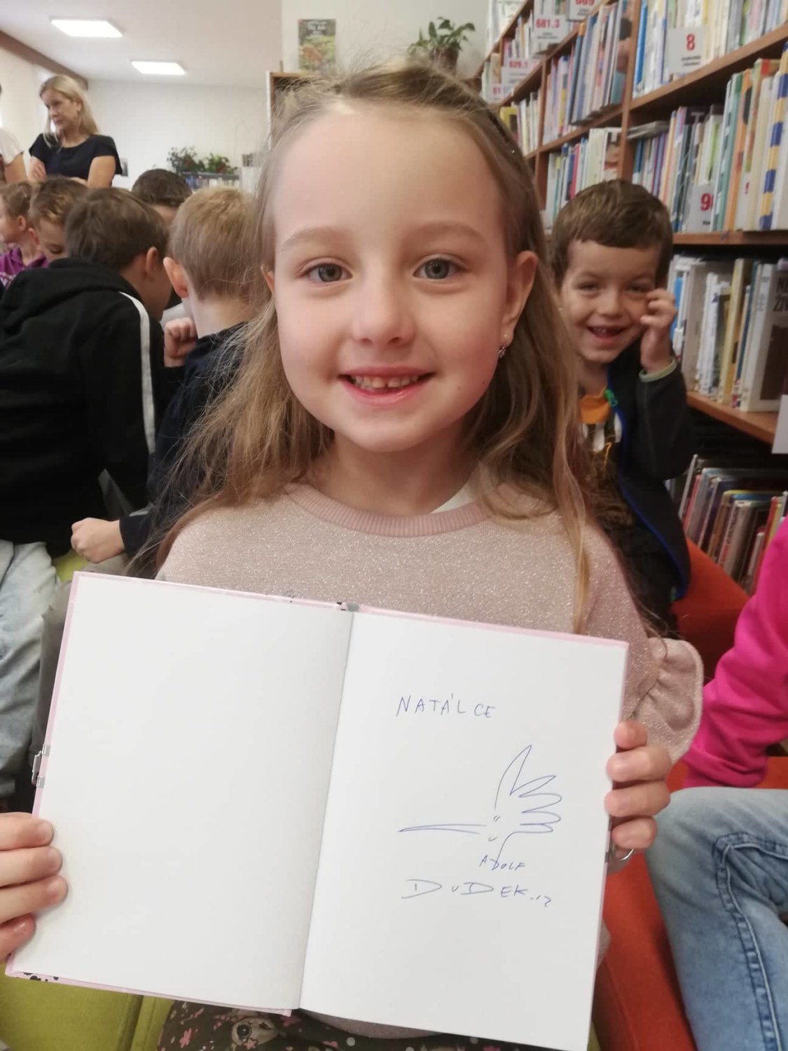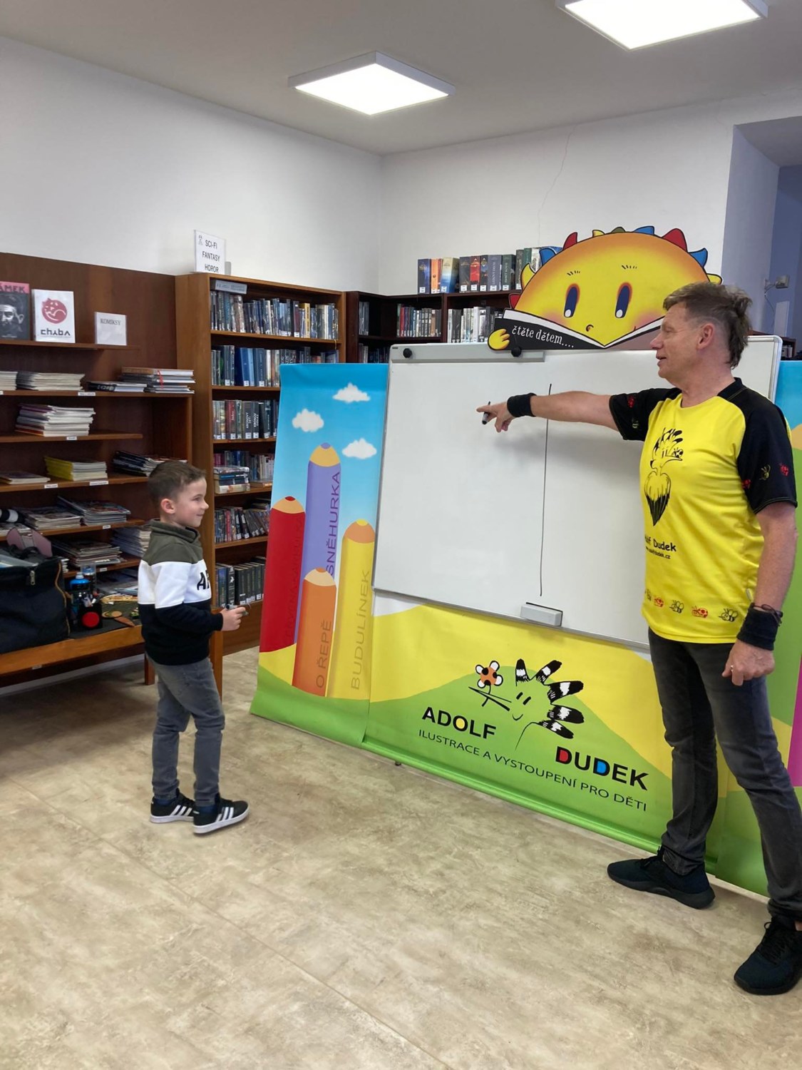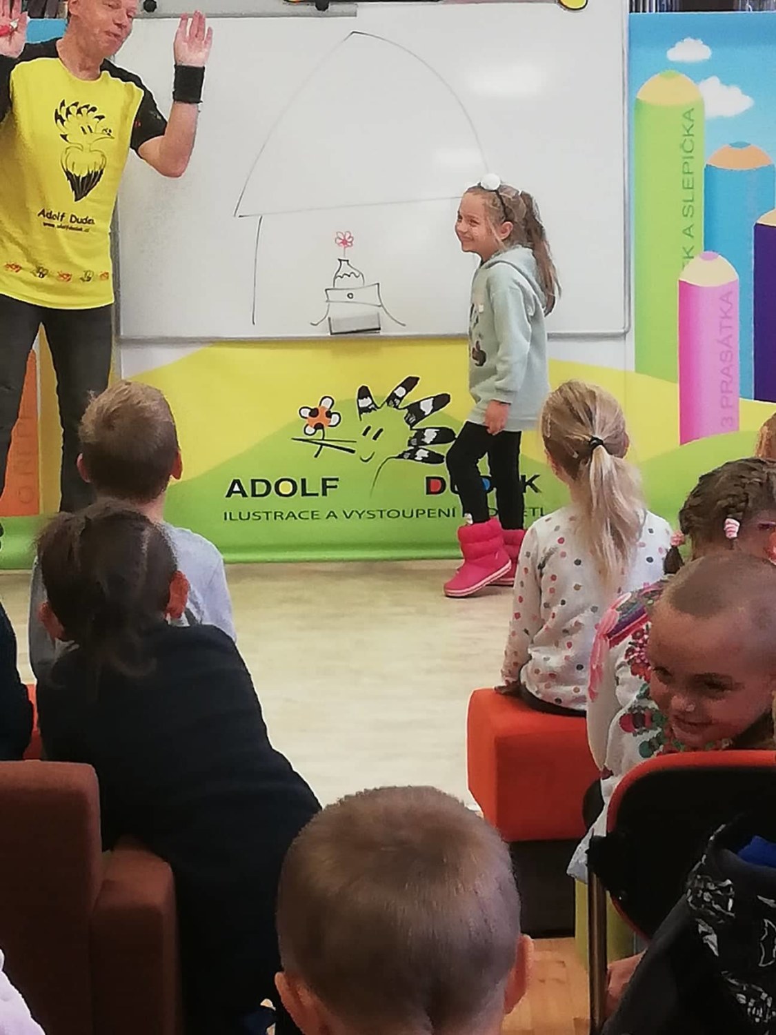 Knihovna v Lanškrouně nám nabídla, abychom přišli na besedu s ilustrátorem Adolfem Dudkem. To je nabídka, která se neodmítá. Pan Dudek je neskutečný šoumen, který rozdává hodně radosti. Děti prožily hodinu plnou aktivit, pohybu a především smíchu. Na závěr pan Dudek udělal dětem autogramiádu, kdy se jim podepsal a namaloval svojí“ podobu“ – ptáka dudka.