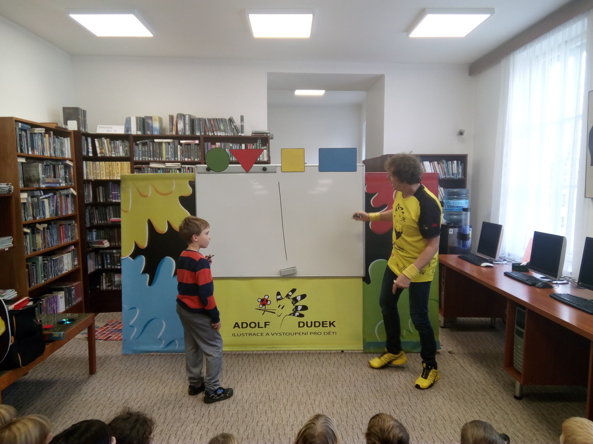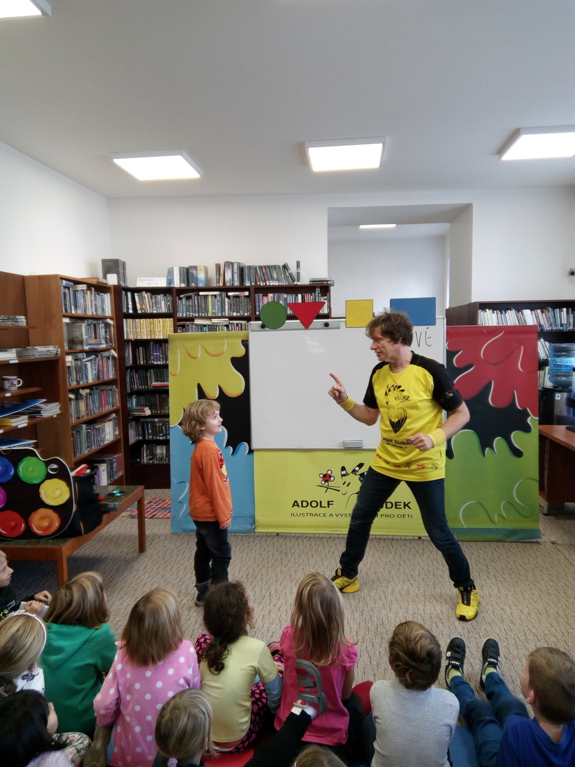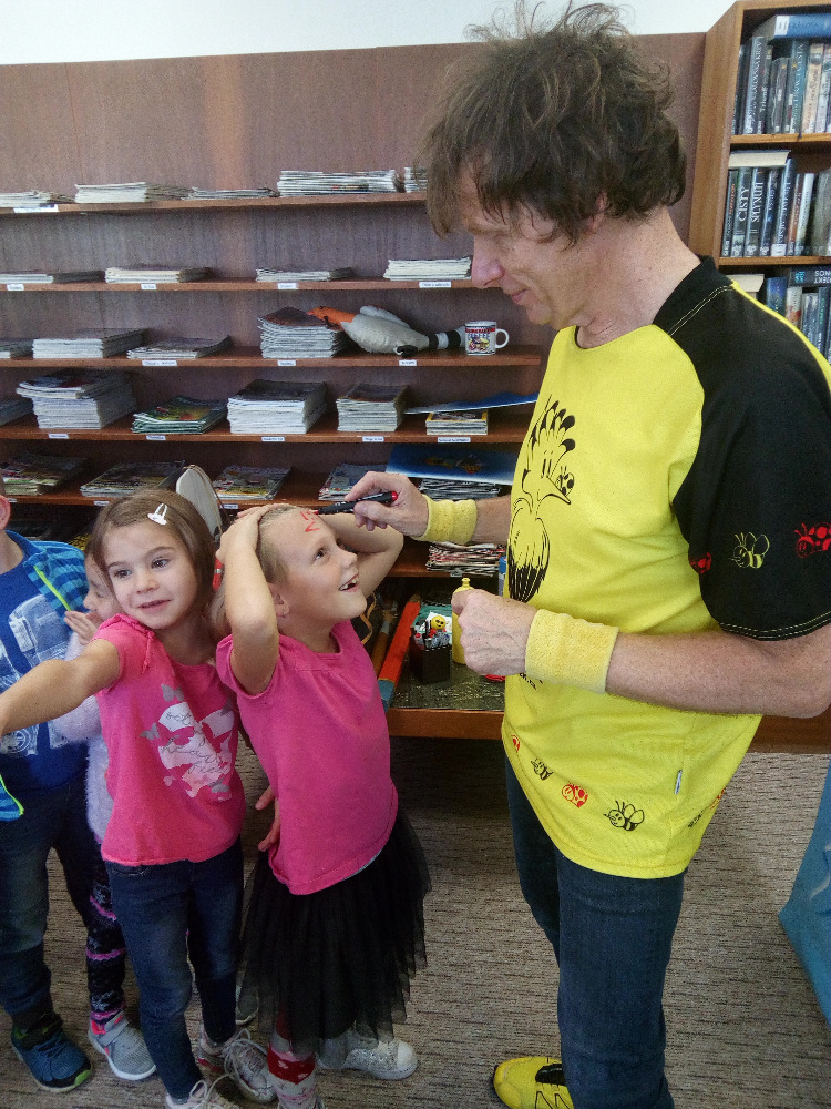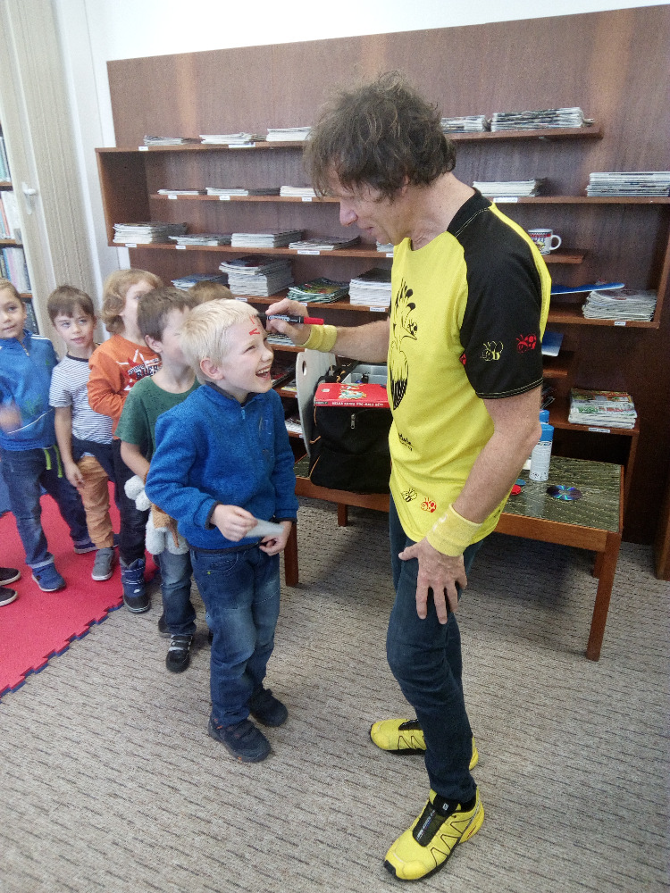 s výtvarnými technikami, a také nám poradil, jak si namalovat obrázek pomocí základních geometrických tvarů. Užili jsme si spoustu zábavy, získali nové informace a na závěr jsme dostali autogram.