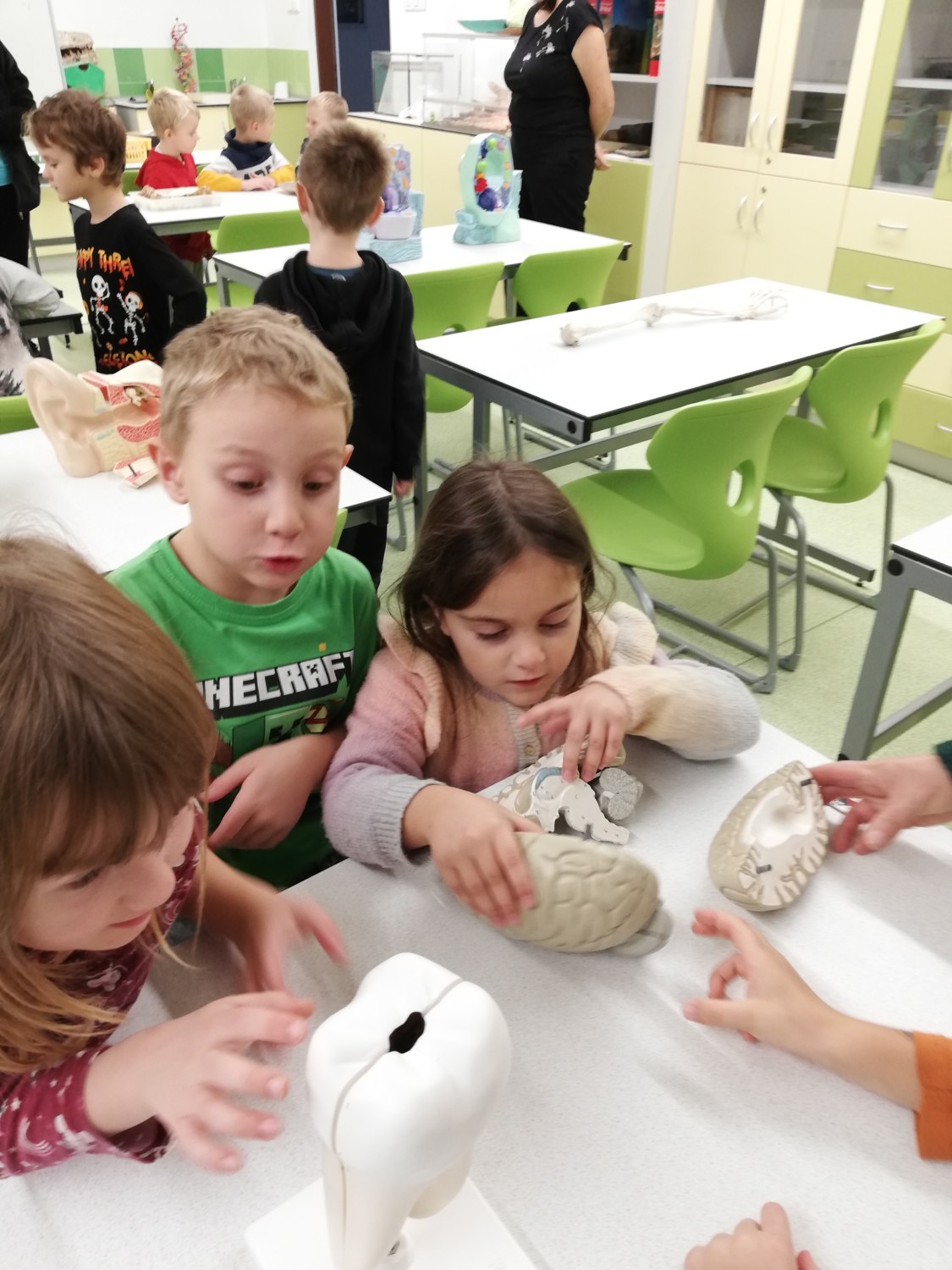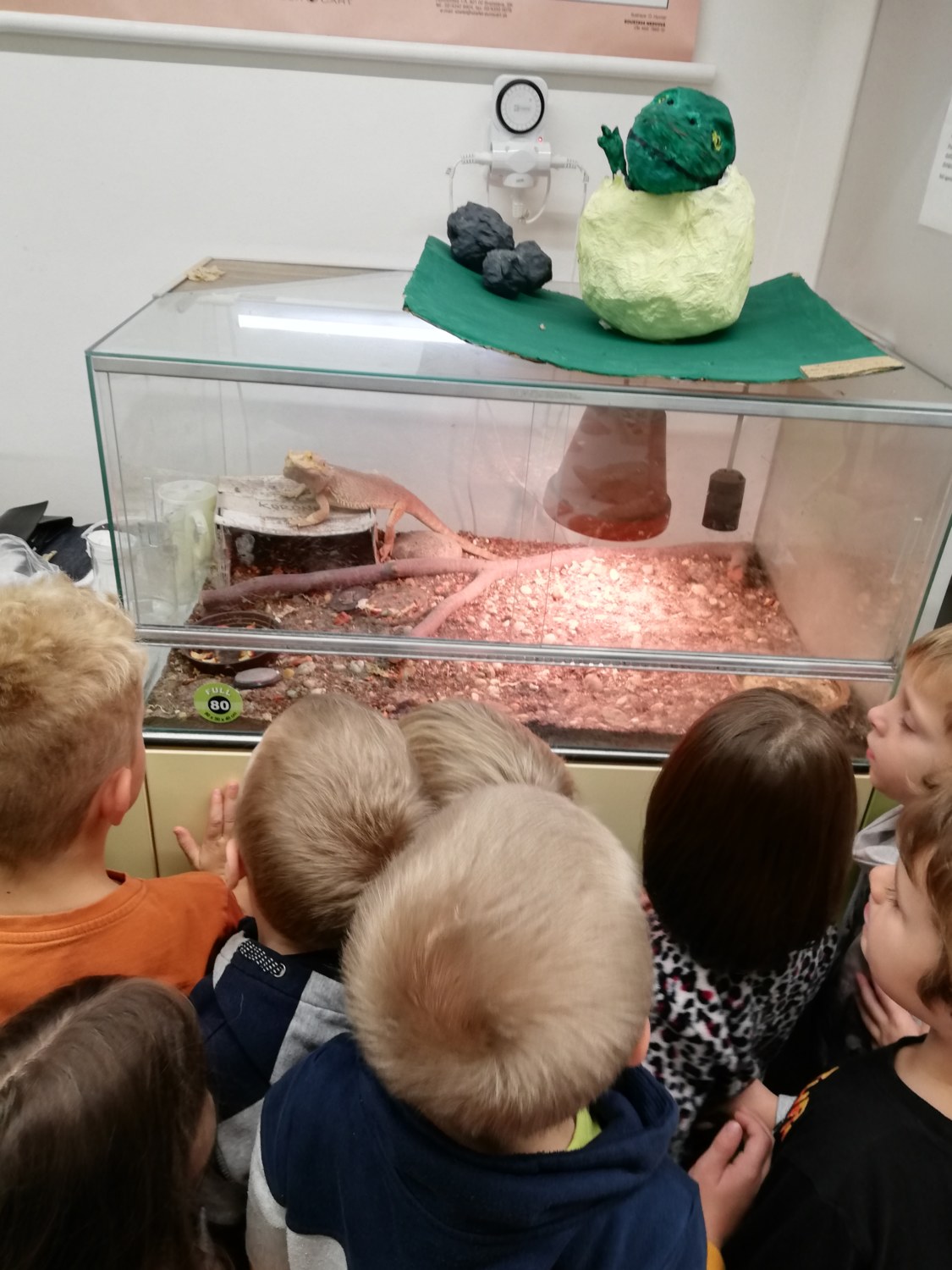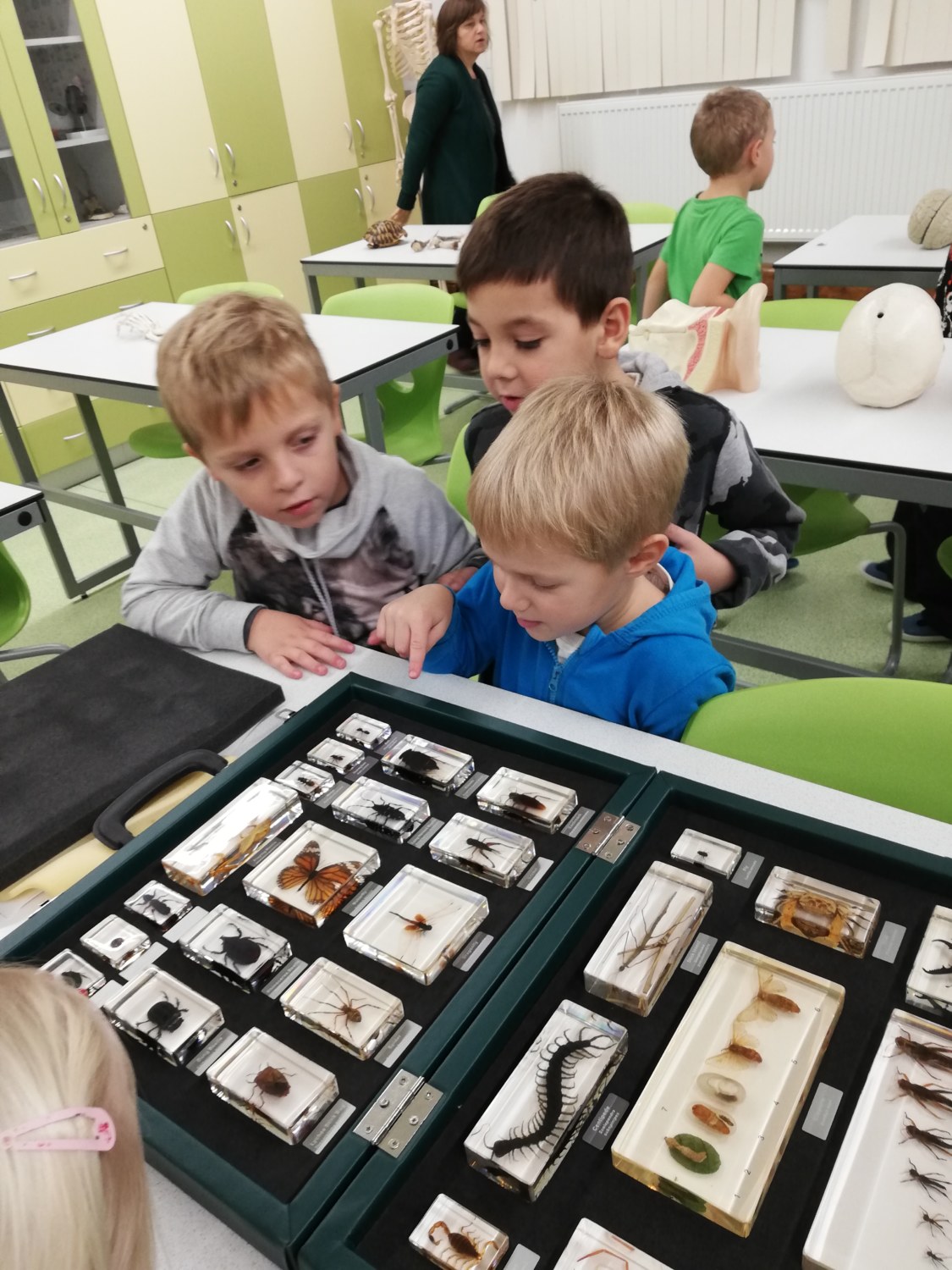 Dále jsme se společně přesunuli do podkroví a po prohlídce moderních tříd pro výuku jazyků a pracovních činností nás čekalo překvapení v přírodovědné učebně. Paní učitelka Holubcová zde na lavice nachystala spoustu moderních učebních pomůcek. Předškoláci si prohlédli a ohmatali model ucha, zubu a mozku, dále zkameněliny nebo si prohlédli ukázky hmyzu. Velmi je upoutala živá agama vousatá v teráriu.