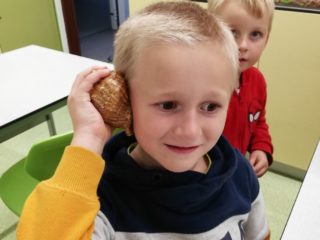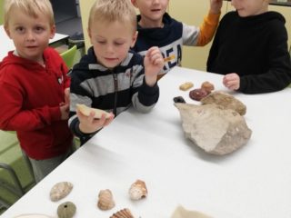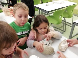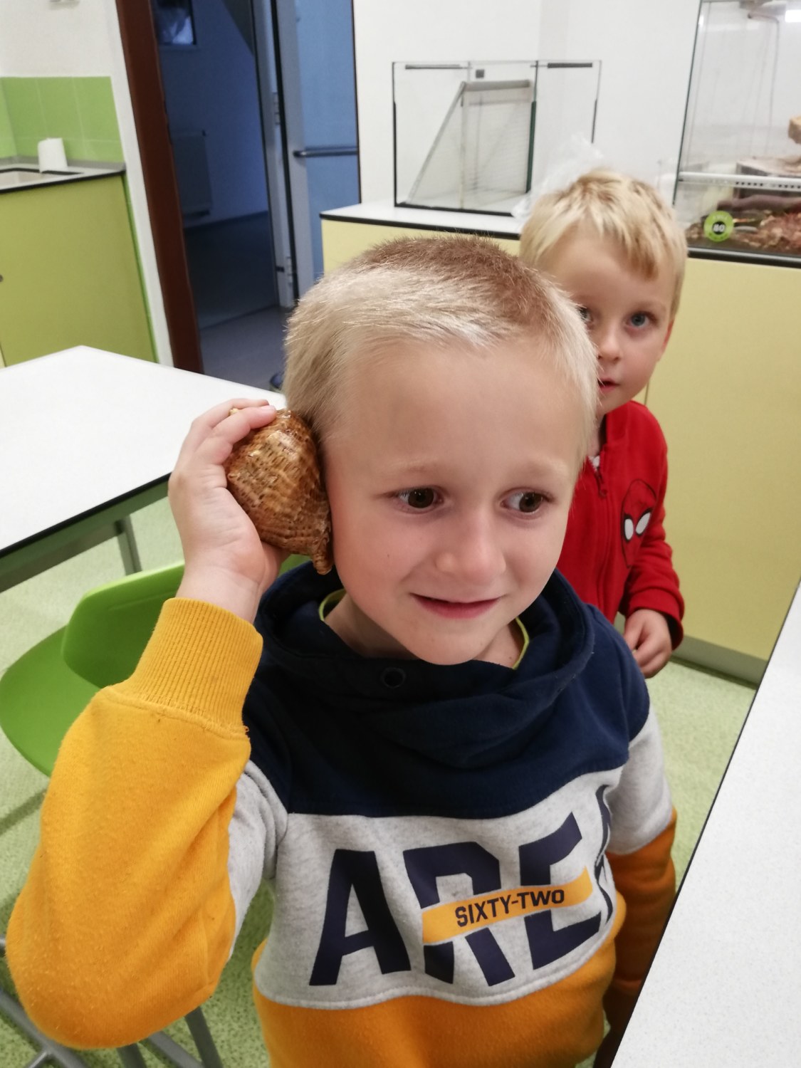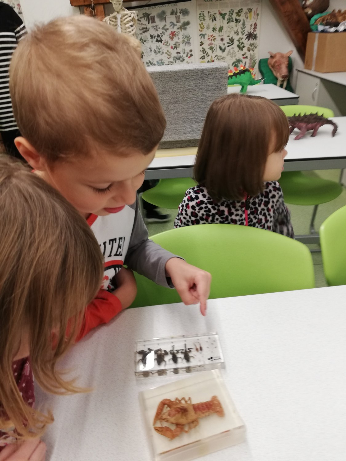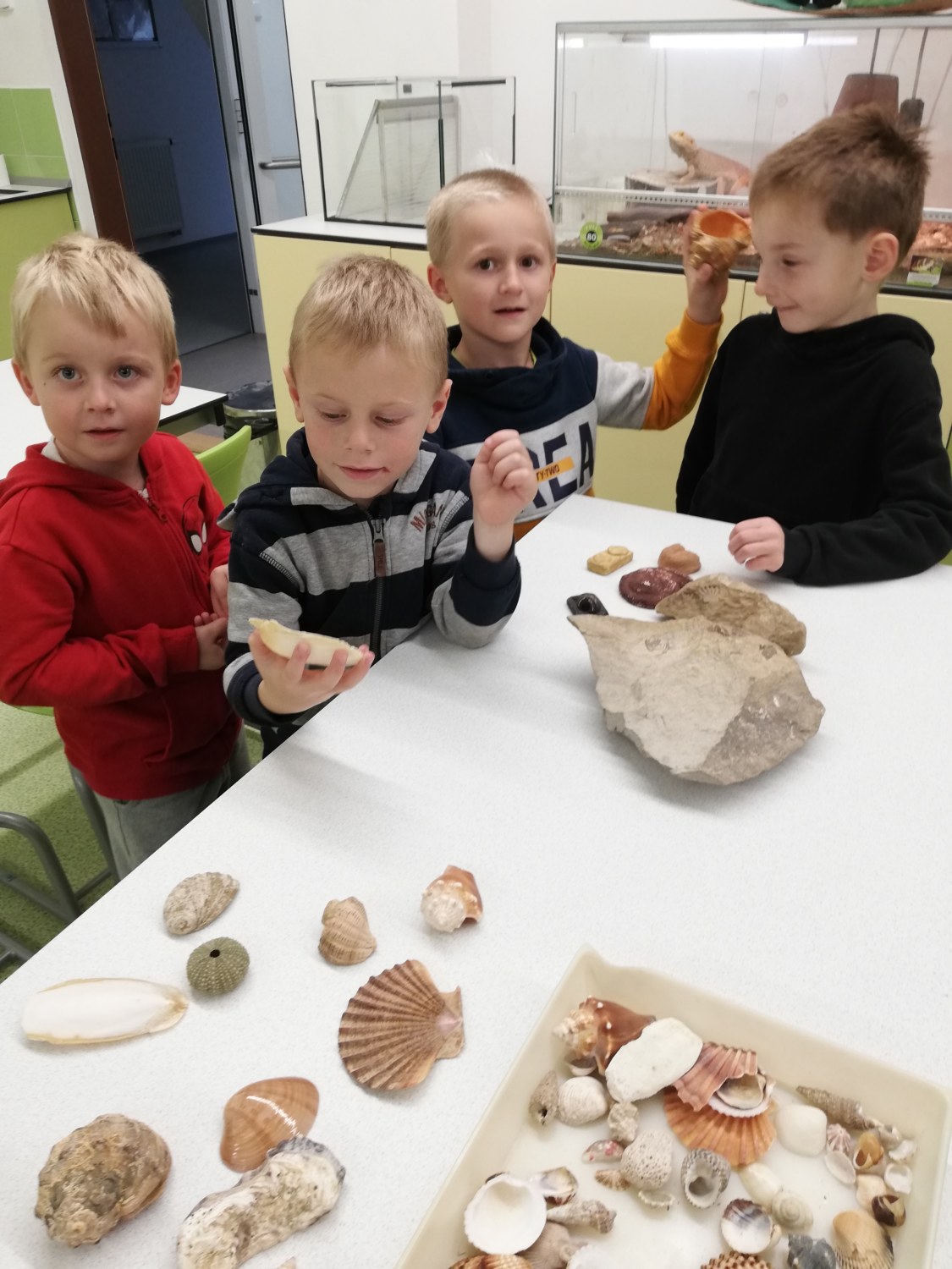 Dále jsme se společně přesunuli do podkroví a po prohlídce moderních tříd pro výuku jazyků a pracovních činností nás čekalo překvapení v přírodovědné učebně. Paní učitelka Holubcová zde na lavice nachystala spoustu moderních učebních pomůcek. Předškoláci si prohlédli a ohmatali model ucha, zubu a mozku, dále zkameněliny nebo si prohlédli ukázky hmyzu. Velmi je upoutala živá agama vousatá v teráriu.