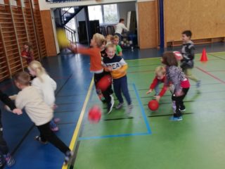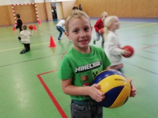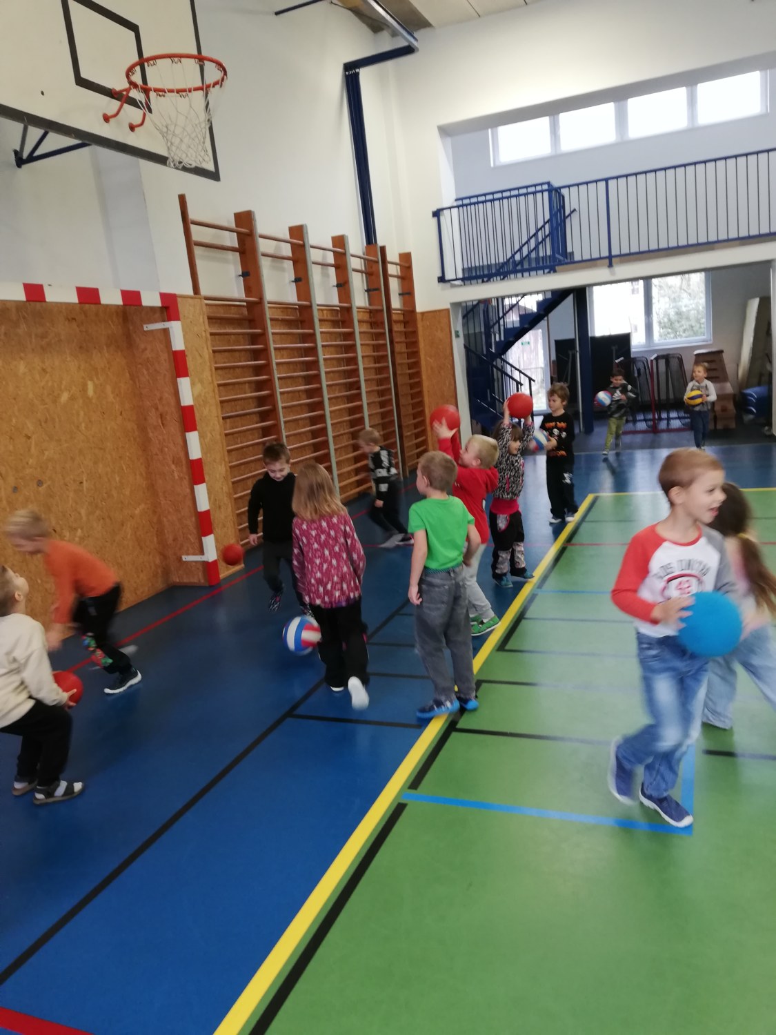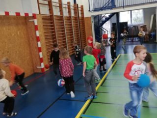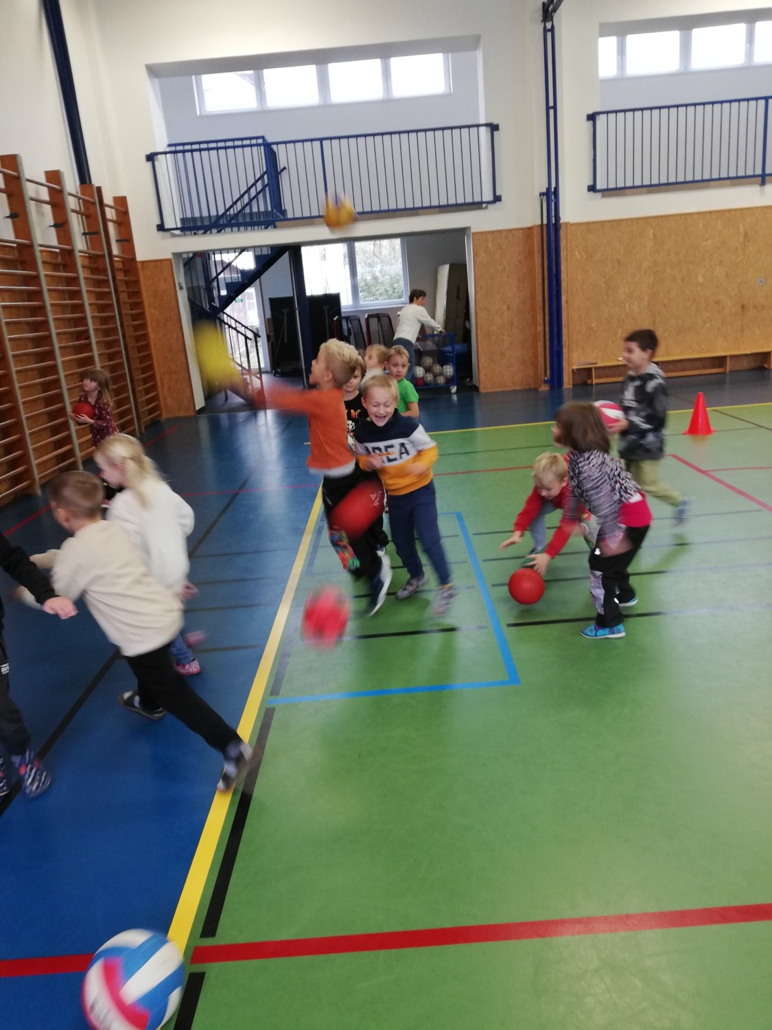 Nejdříve se pozdravili s panem ředitelem Valúškem v ředitelně. Potom využili přestávky a proběhli se v naší velké tělocvičně a zahráli si s míčem.