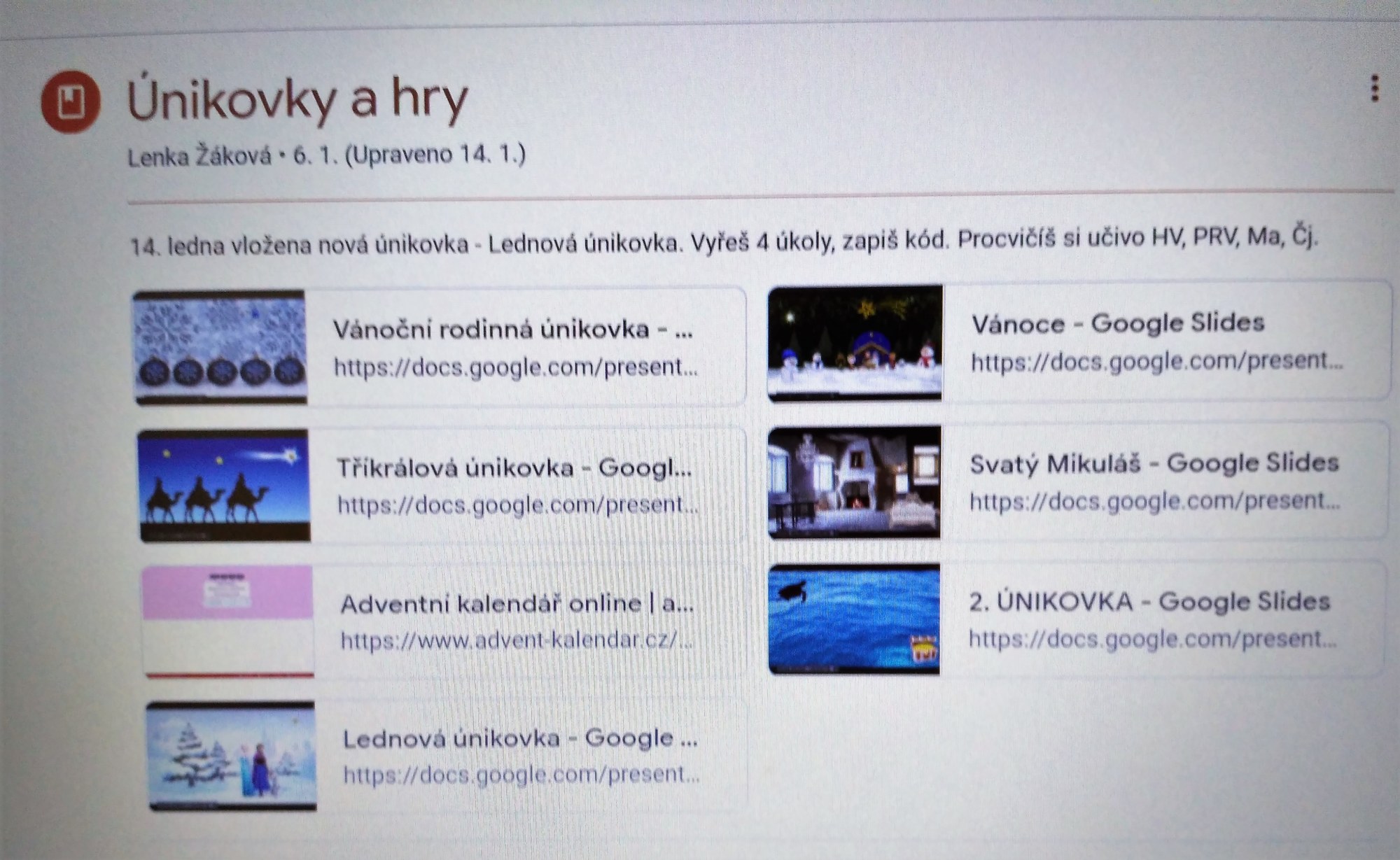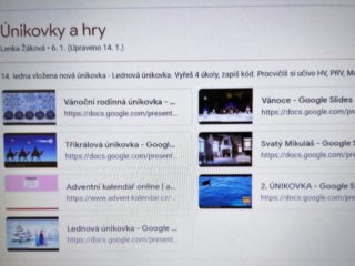 - Online výuka mě baví. Když je nějaký problém, paní učitelka to nevzdává a snaží se vše vyřešit. Úkoly dělám sama. Hry a únikovky jsou zábavné. Při učení mi pomáhají videa, která paní učitelka natáčí.