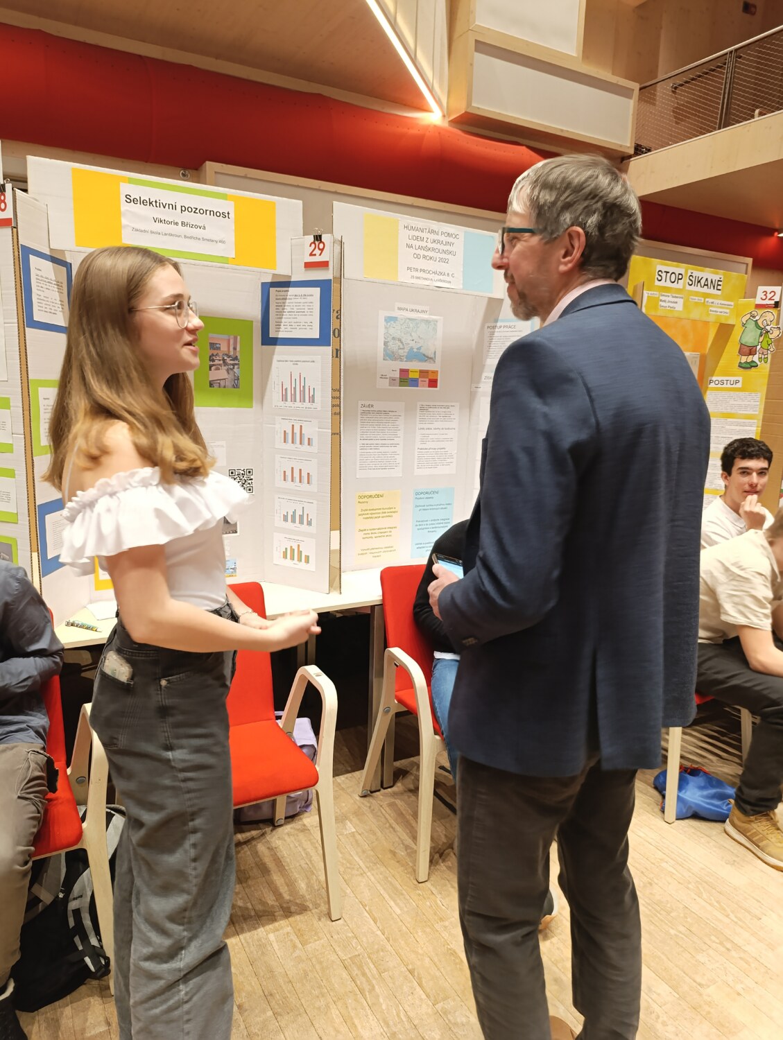 - Viktorie Břízová (9. B) zpracovala téma Selektivní pozornost. V práci zpracovala data ze svého výzkumu a zjistila, že selektivní pozornost se u žáků do 18 let zlepšuje. Na naší škole se do výzkumu zapojilo 153 žáků 2. stupně.