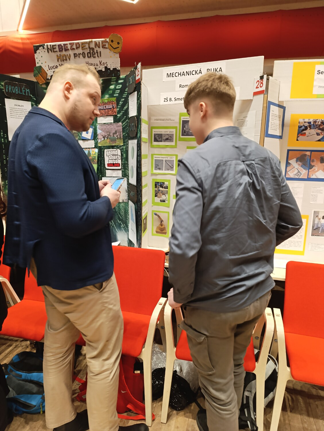 - Roman Kinch (9. B) představil projekt Mechanická ruka. Jeho záměrem bylo vytvořit prototyp pohyblivé robotické ruky. Stanovil si, že finanční náklady budou co nejmenší a bude k opakovanému použití, např. ve výuce informatiky.