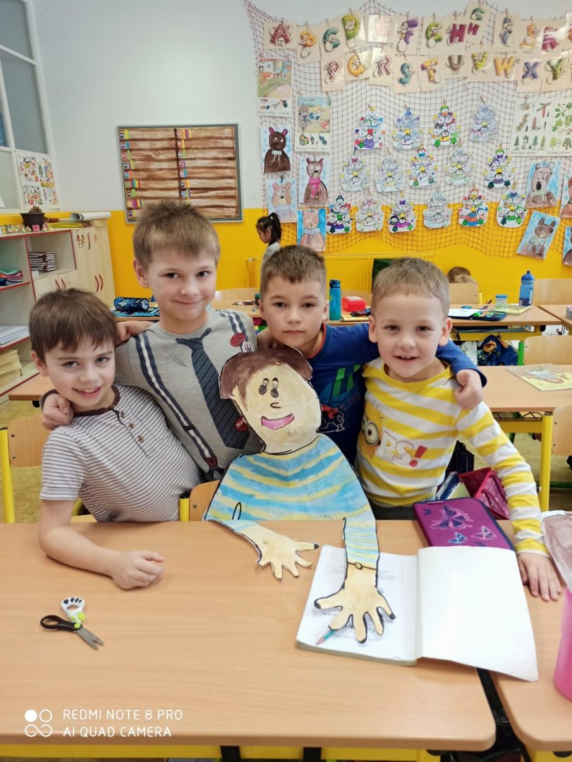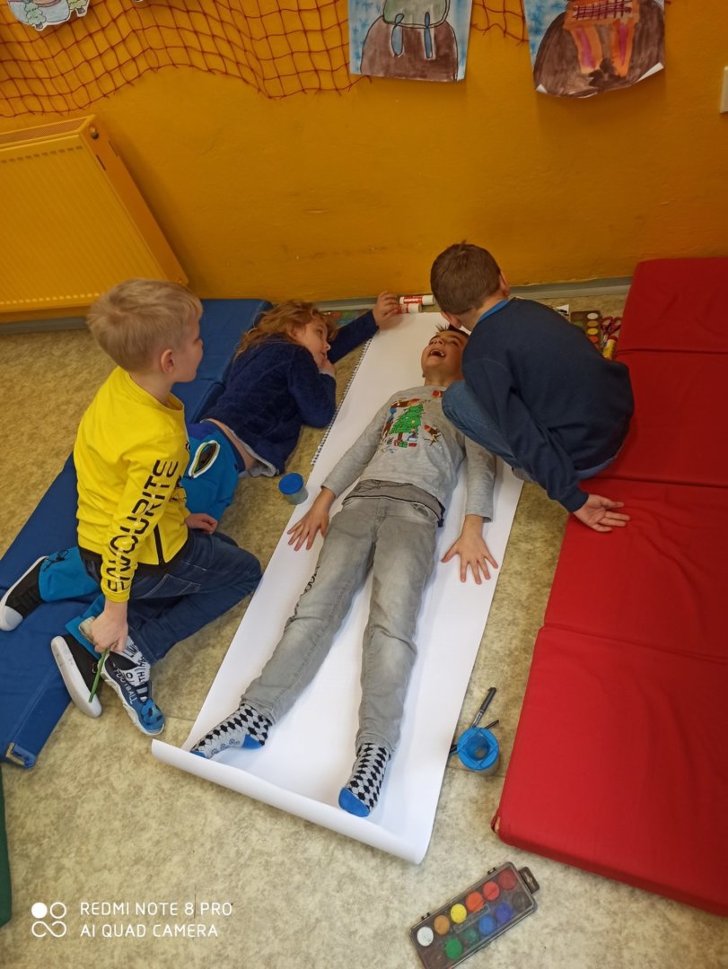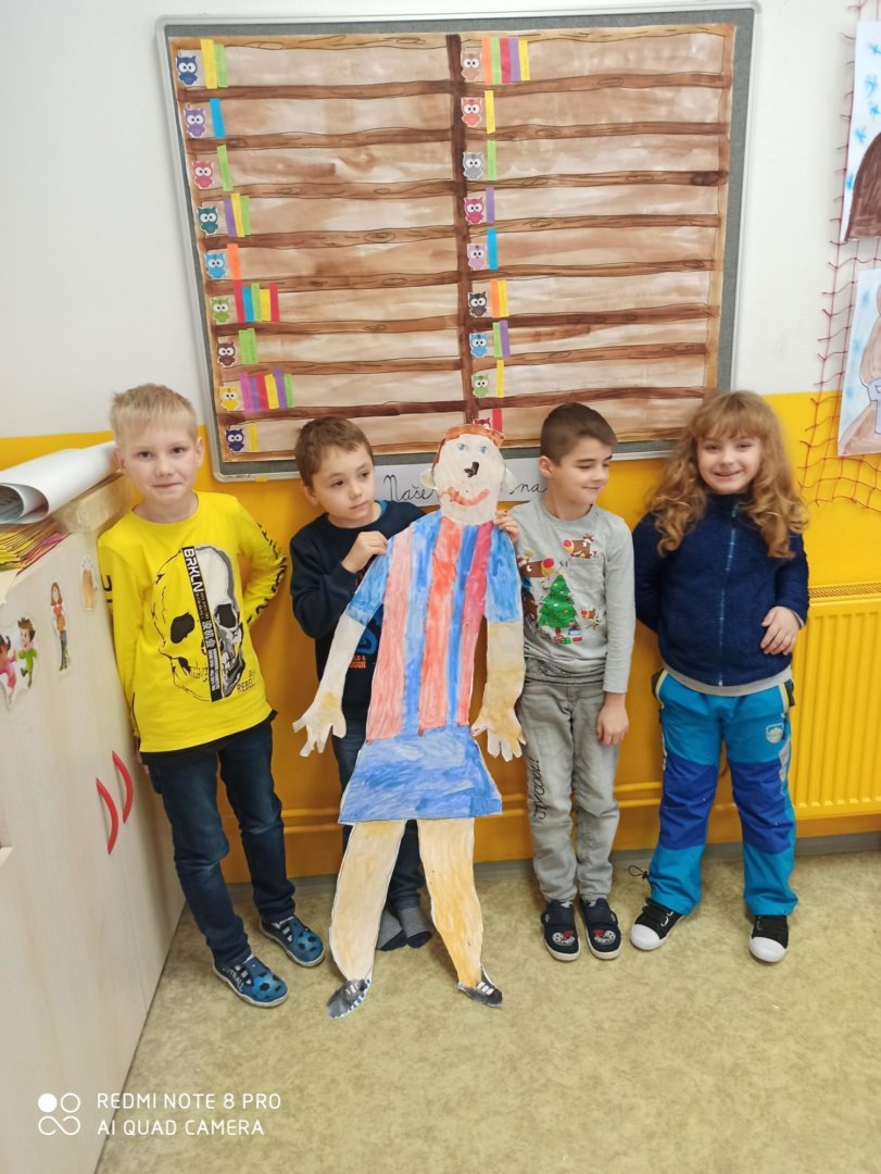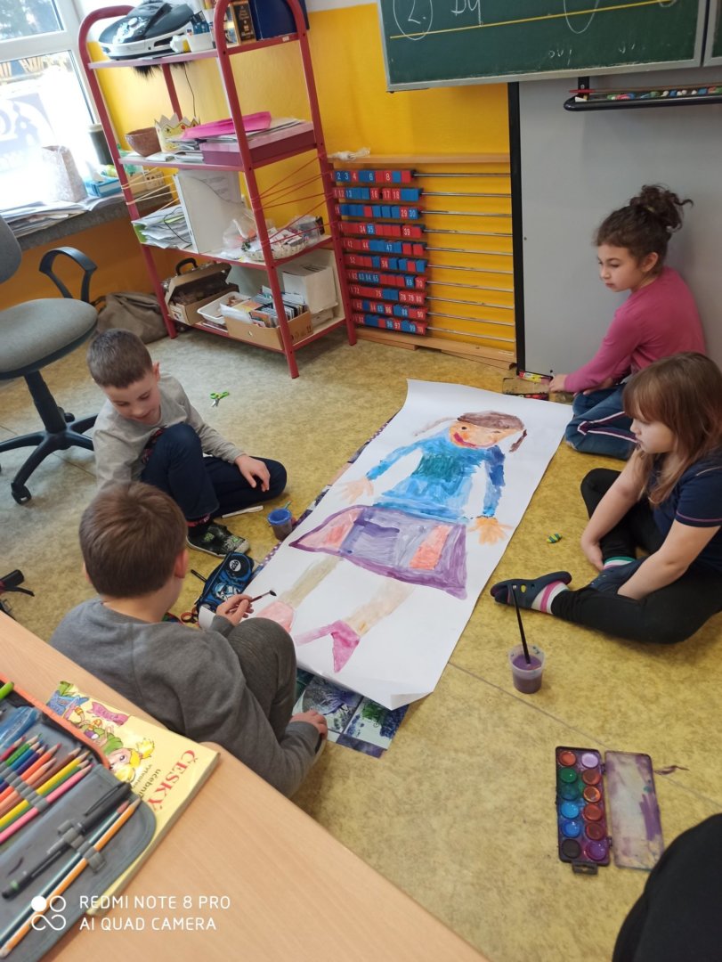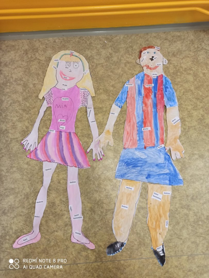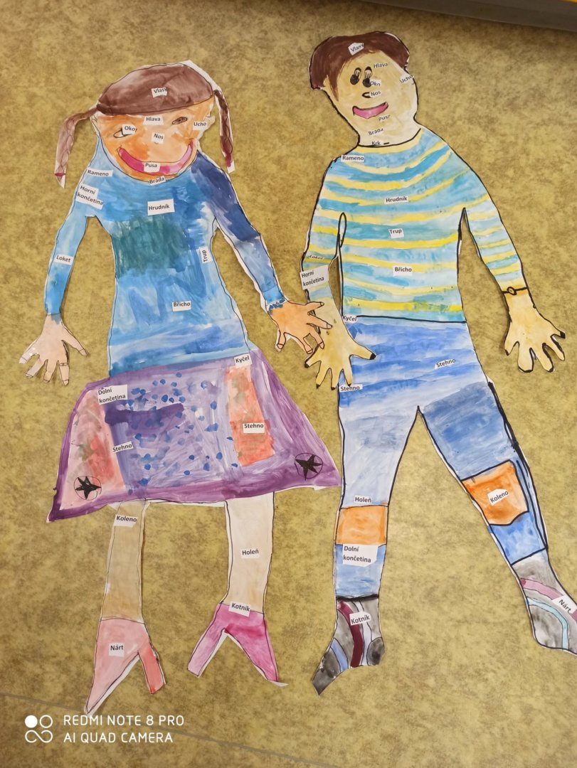 Je známo, že předměty se mezi sebou vzájemně prolínají. Toho jsme využili při prvouce, kde probíráme lidské tělo- jeho části, smysly, vnitřní orgány ( zatím okrajově) i poskytování první pomoci. Své vědomosti potom děti uplatnily i při VV a PČ, kde ve skupinkách namalovaly postavu a následně ji doplnily o jednotlivé části těla. Práce děti bavila a získaly další nové poznatky.
