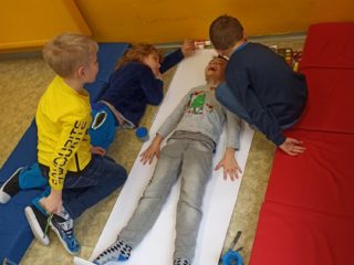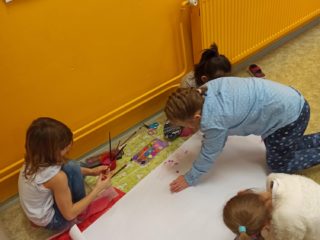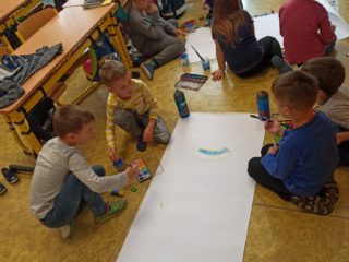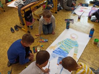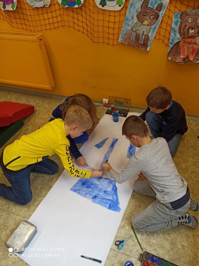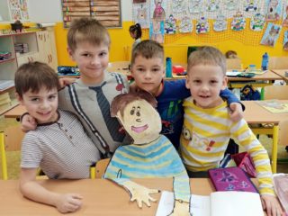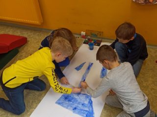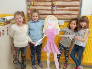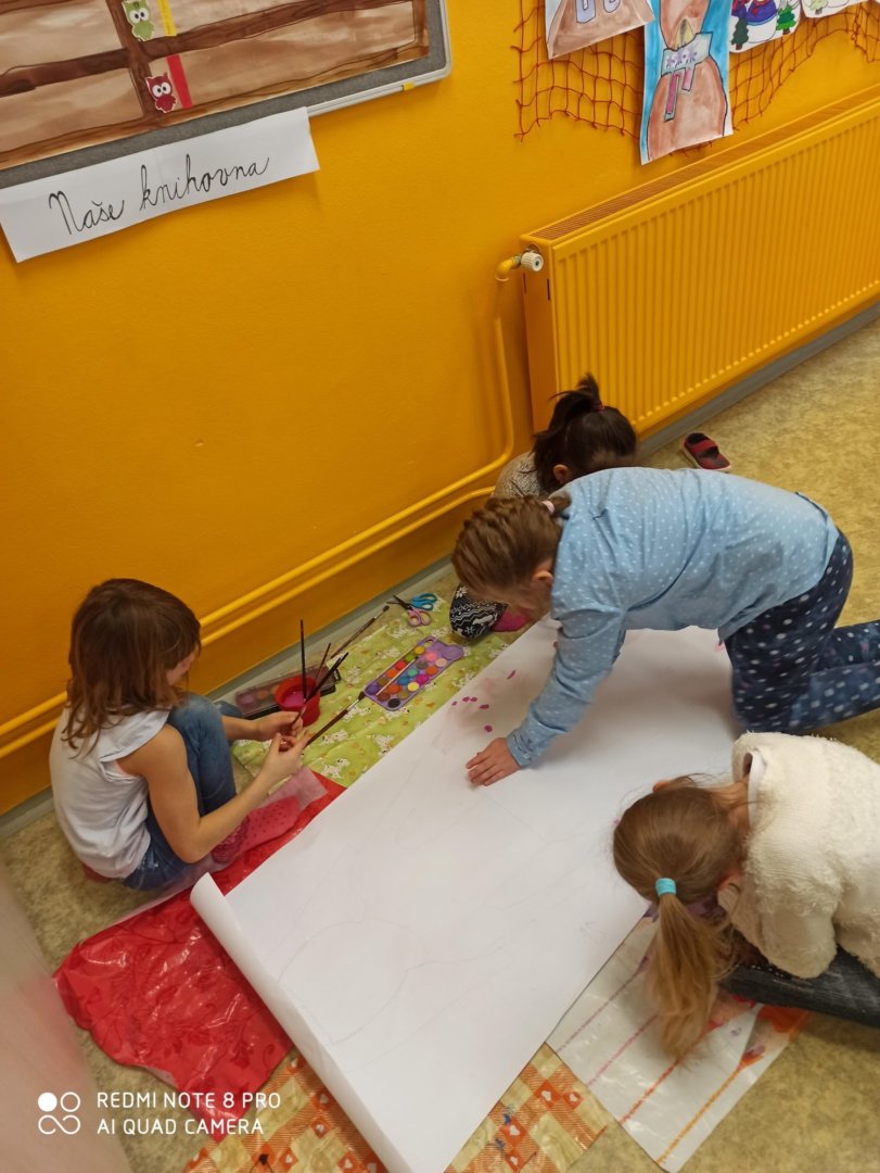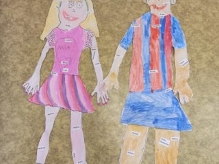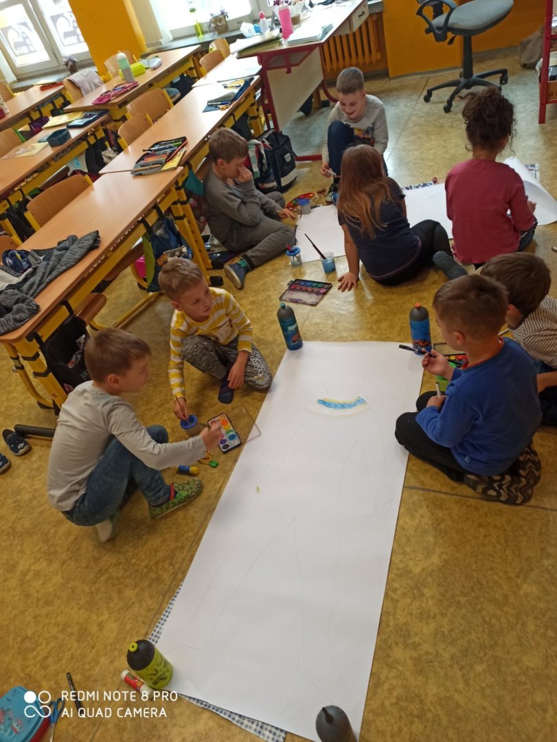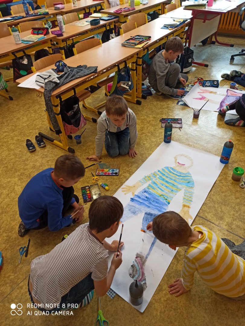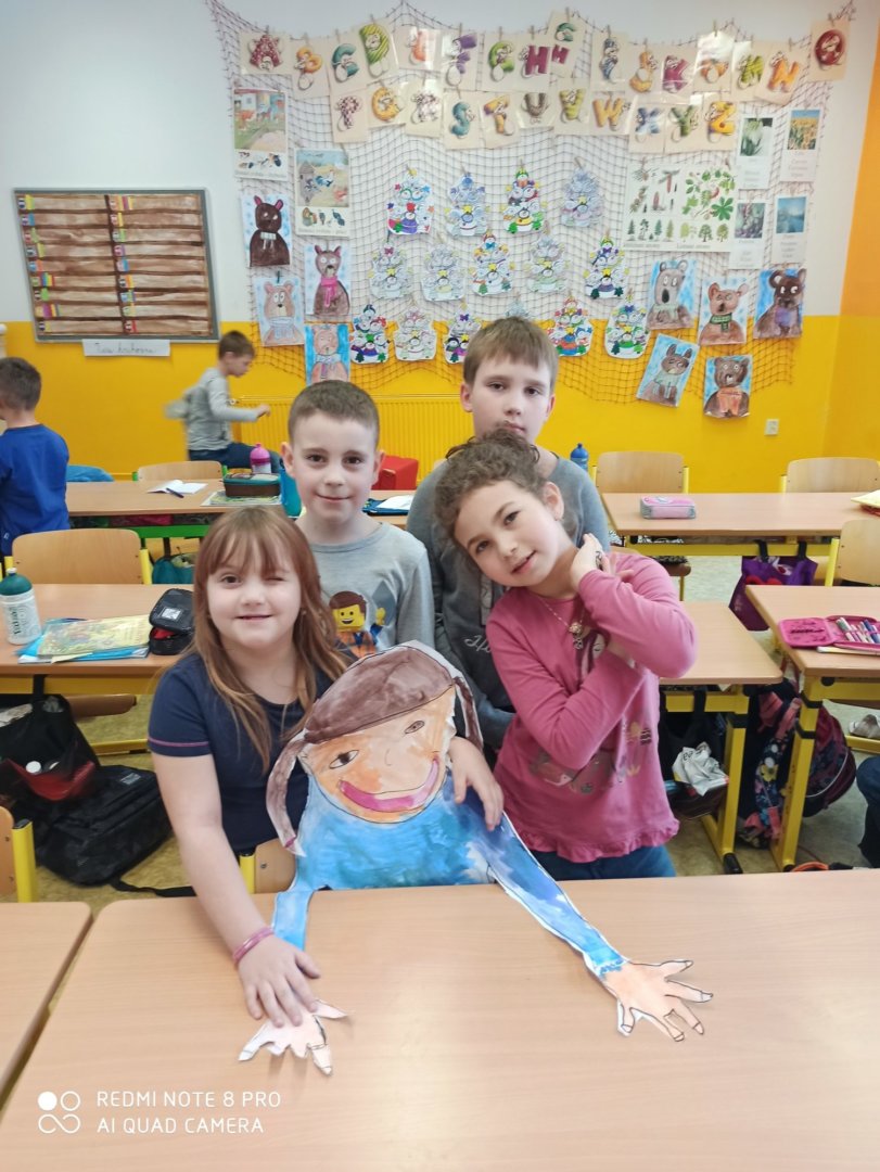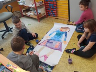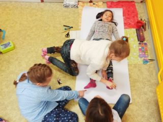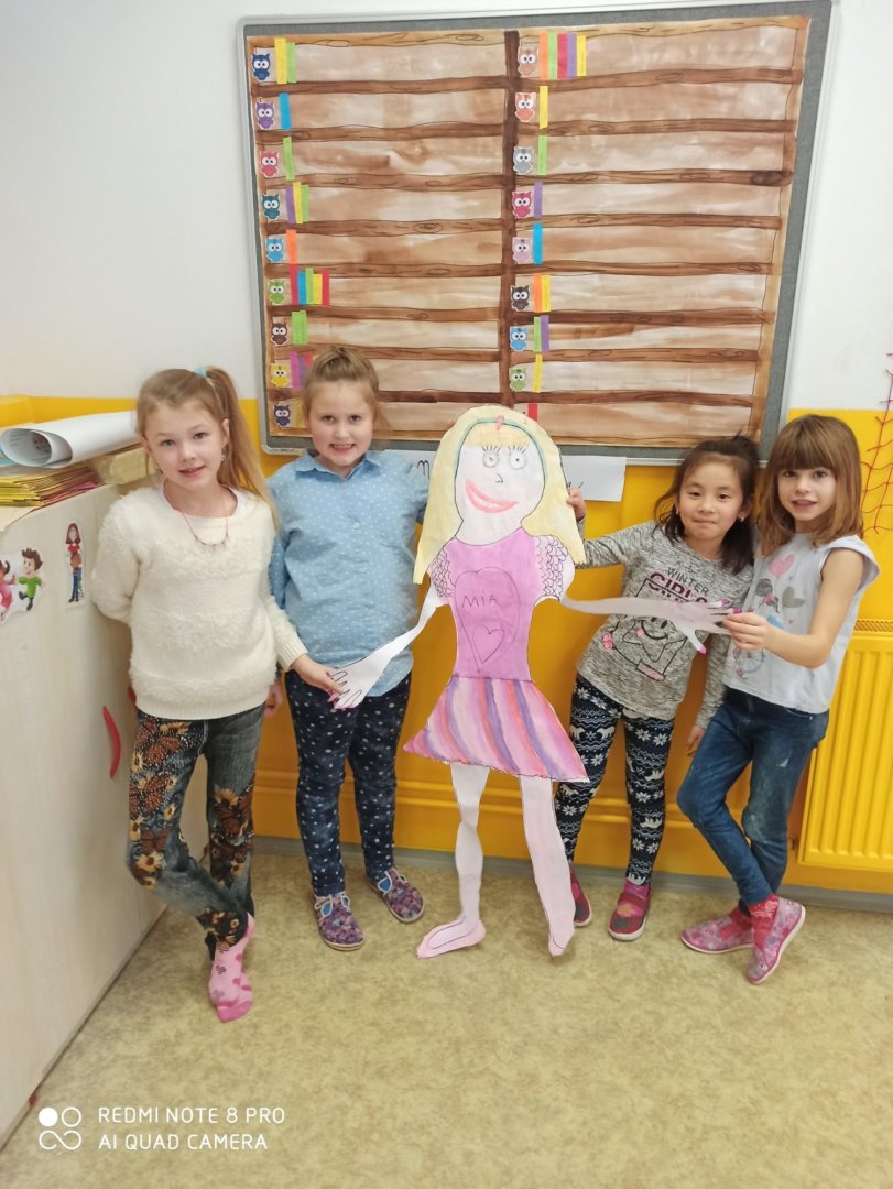 Je známo, že předměty se mezi sebou vzájemně prolínají. Toho jsme využili při prvouce, kde probíráme lidské tělo- jeho části, smysly, vnitřní orgány ( zatím okrajově) i poskytování první pomoci. Své vědomosti potom děti uplatnily i při VV a PČ, kde ve skupinkách namalovaly postavu a následně ji doplnily o jednotlivé části těla. Práce děti bavila a získaly další nové poznatky.