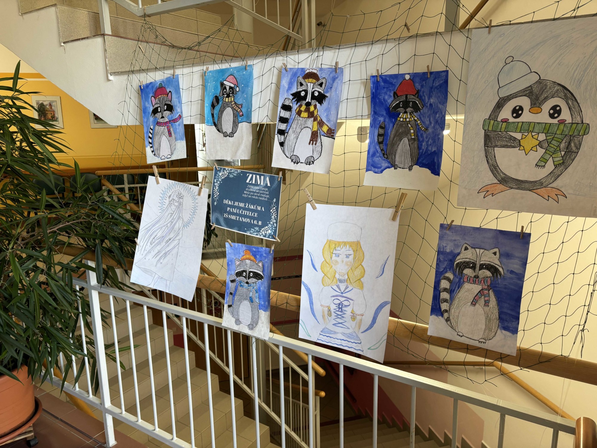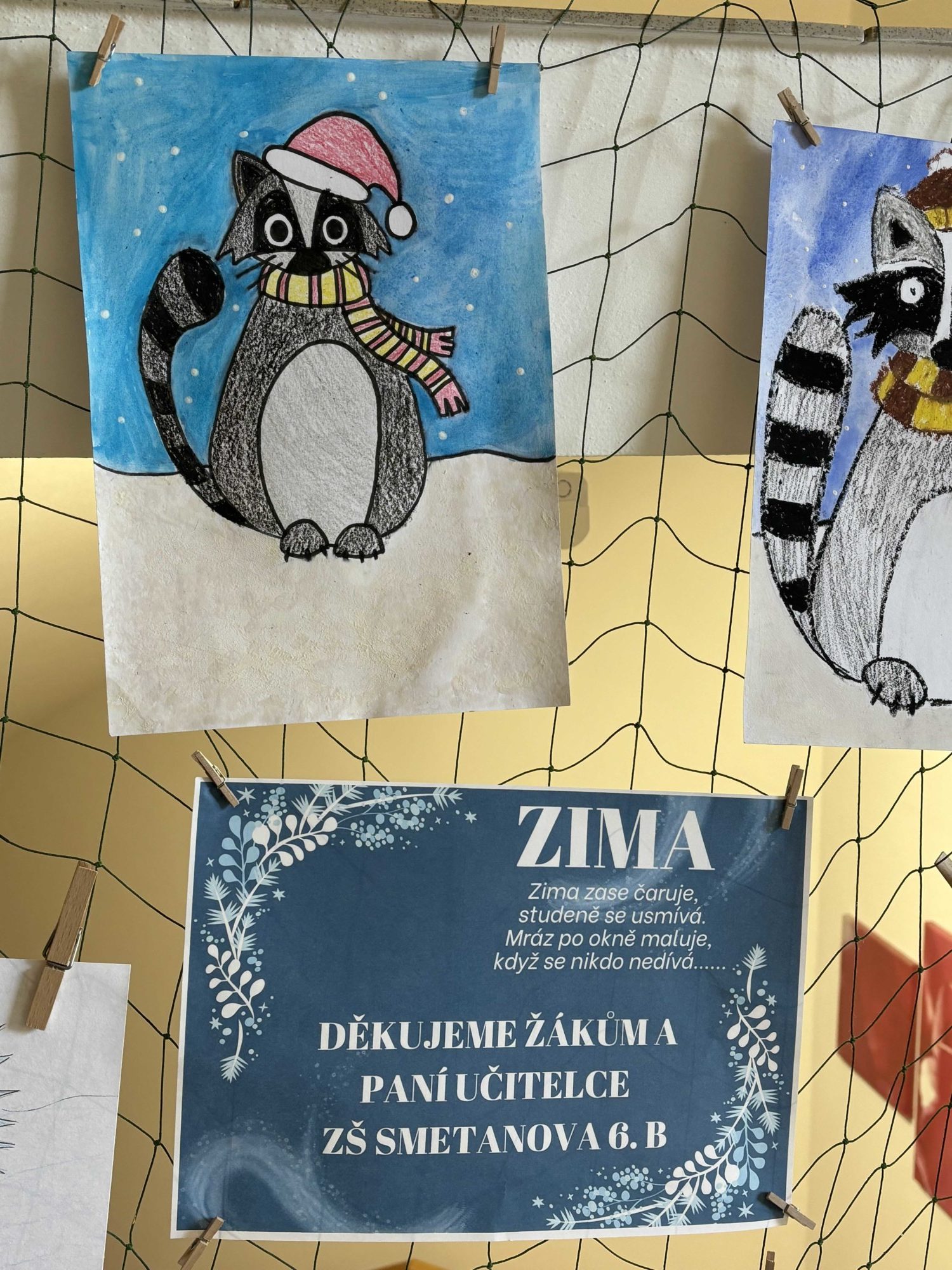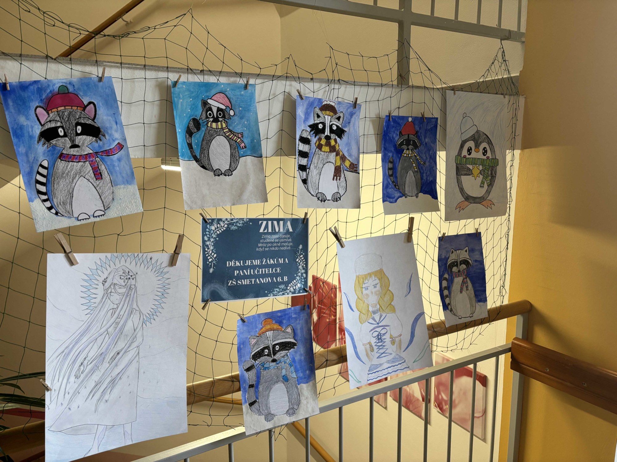 Naše třída 6. B předala do místního Domova pro seniory obrázky, které jsme vytvořili v hodinách výtvarné výchovy. Zaměstnankyně domova p. Severová je poté vyvěsila pro radost a potěšení obyvatel. Téma bylo „Mýval a Vládce/kyně zimy,“ což přineslo zimní kouzlo a trochu roztomilosti do života seniorů.