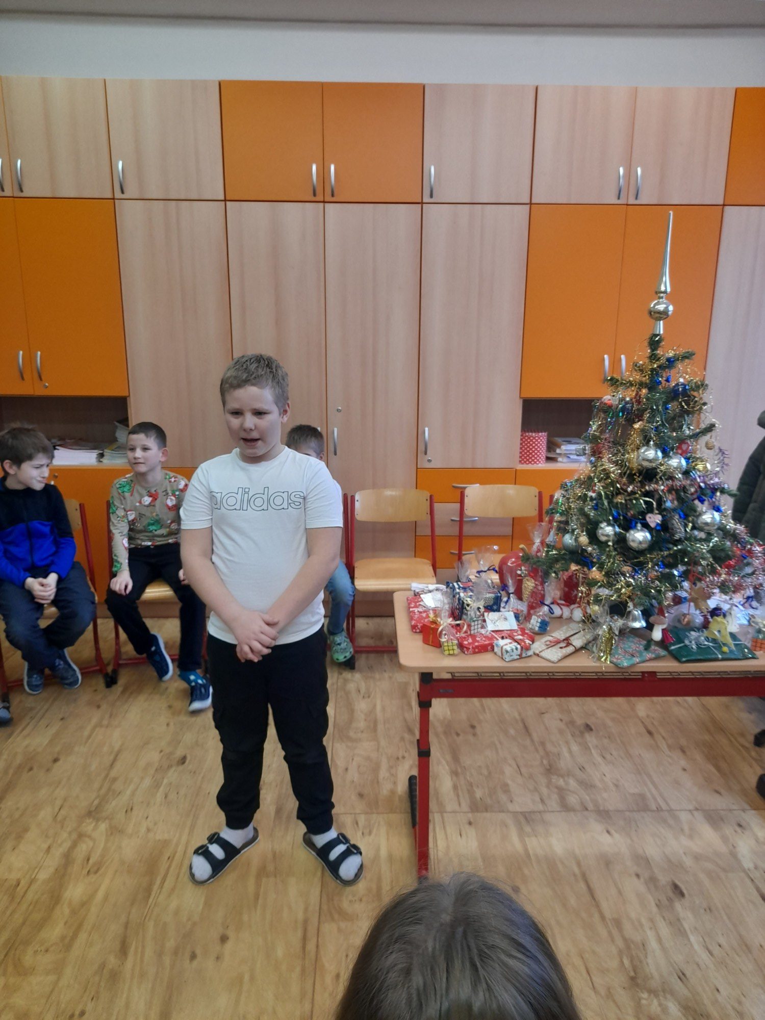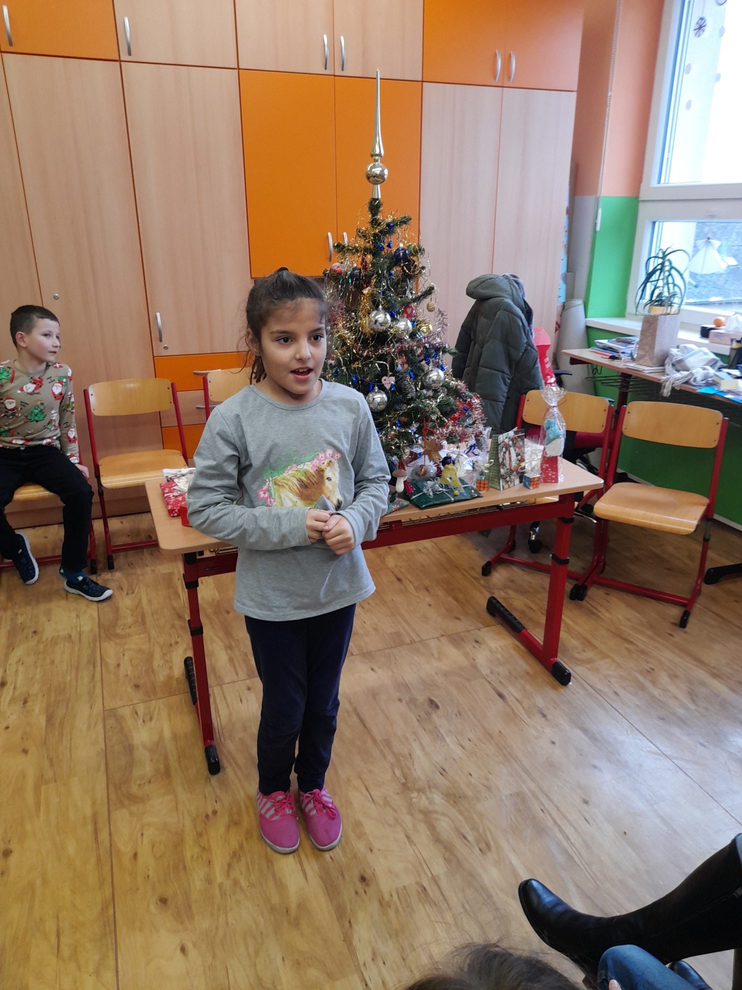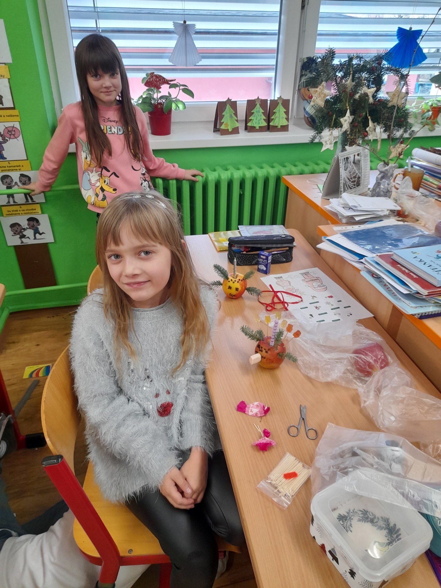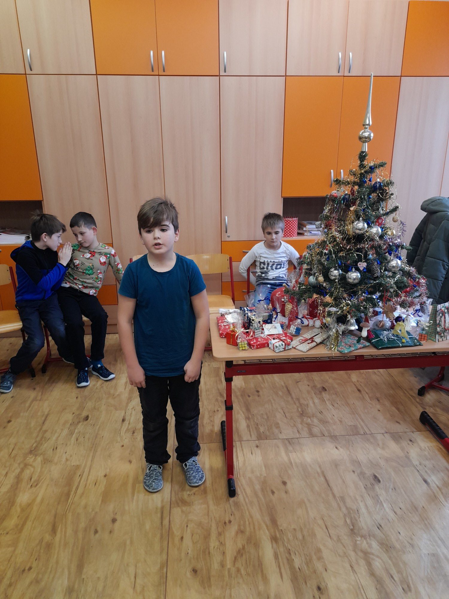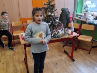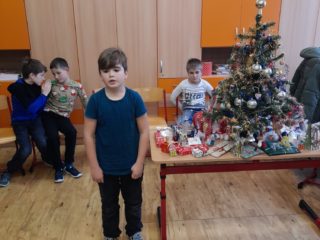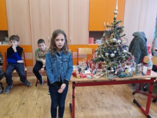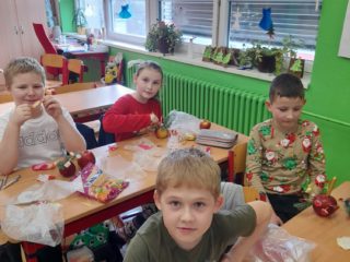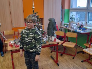 První hodinu pracovaly děti ve skupinkách na zimním obrázku a trénovaly počítání a vyjmenovaná slova, druhou hodinu v angličtině hrály hry i na chodbě. Třetí hodinu vyráběly z jablíček svícínek. Na závěr byla besídka s přednášením básniček, ochutnávkou cukroví od maminek a rozbalováním dárků. Dětem dopoledne uběhlo jako voda. Pak už jsme si jen popřáli krásné Vánoce.