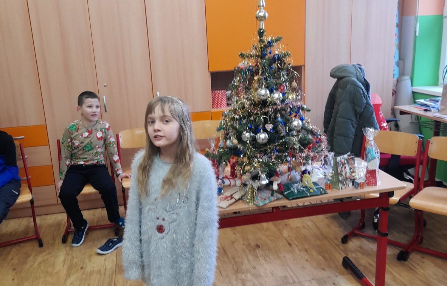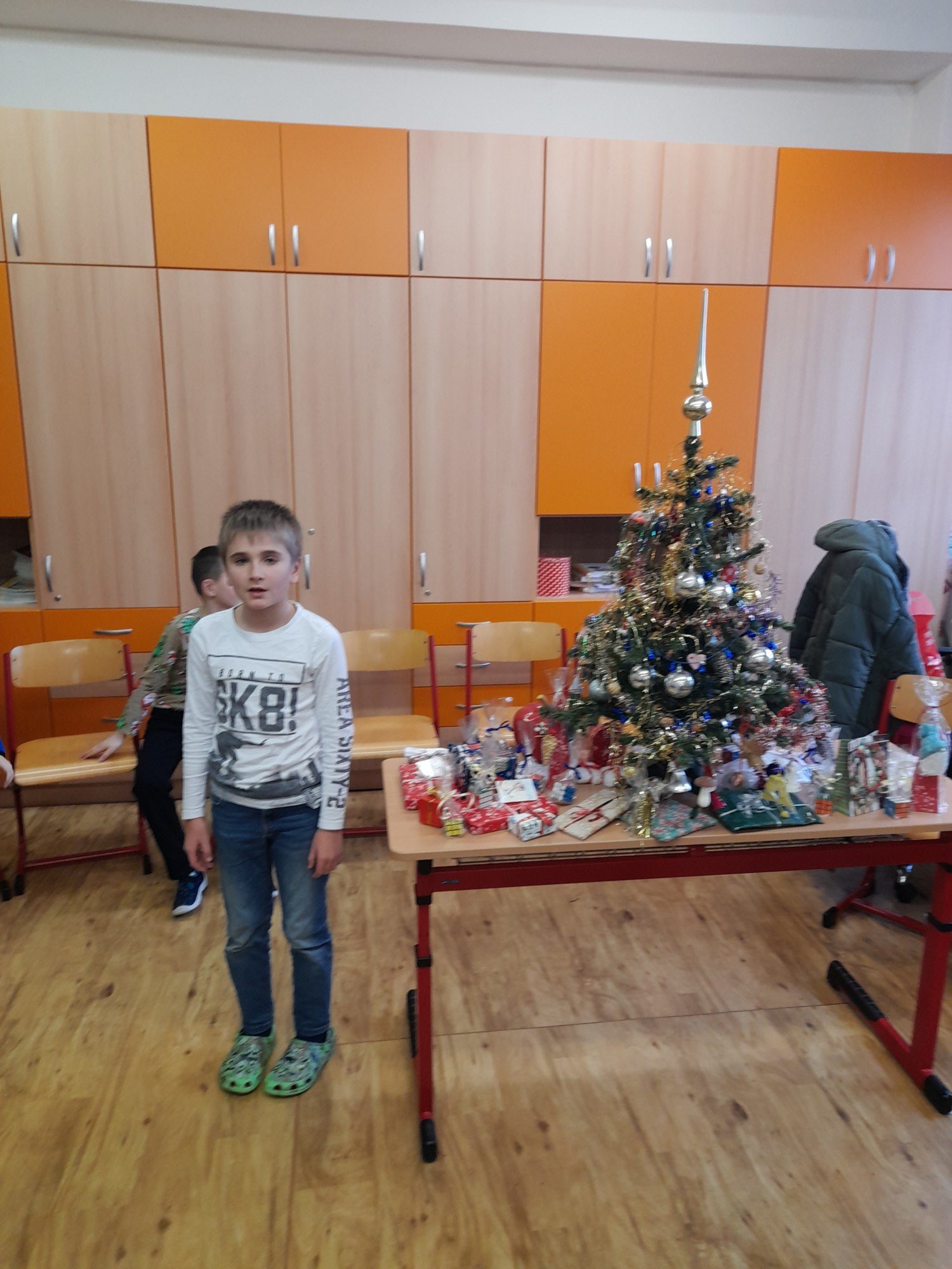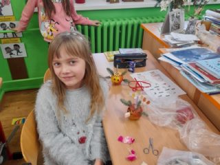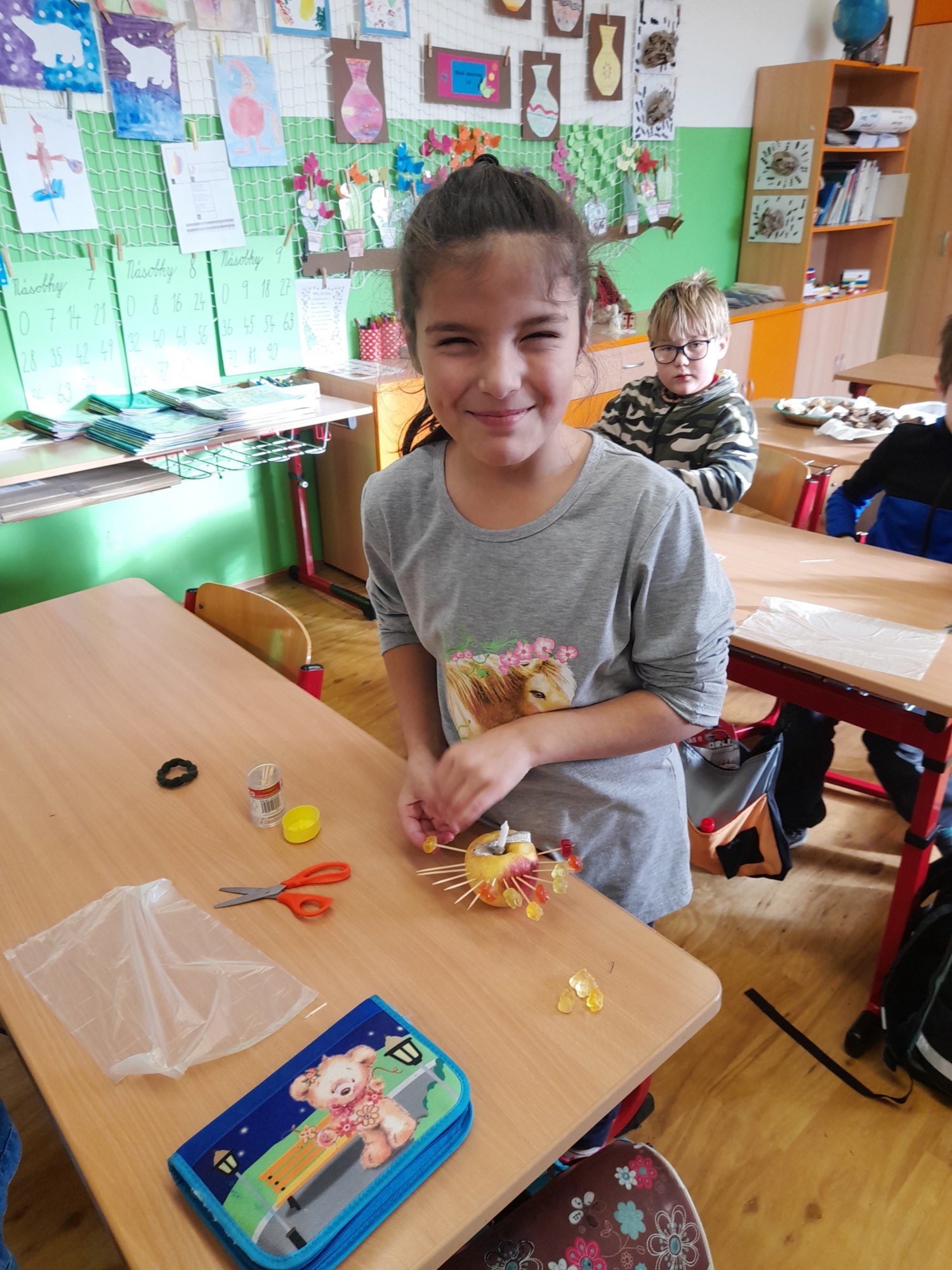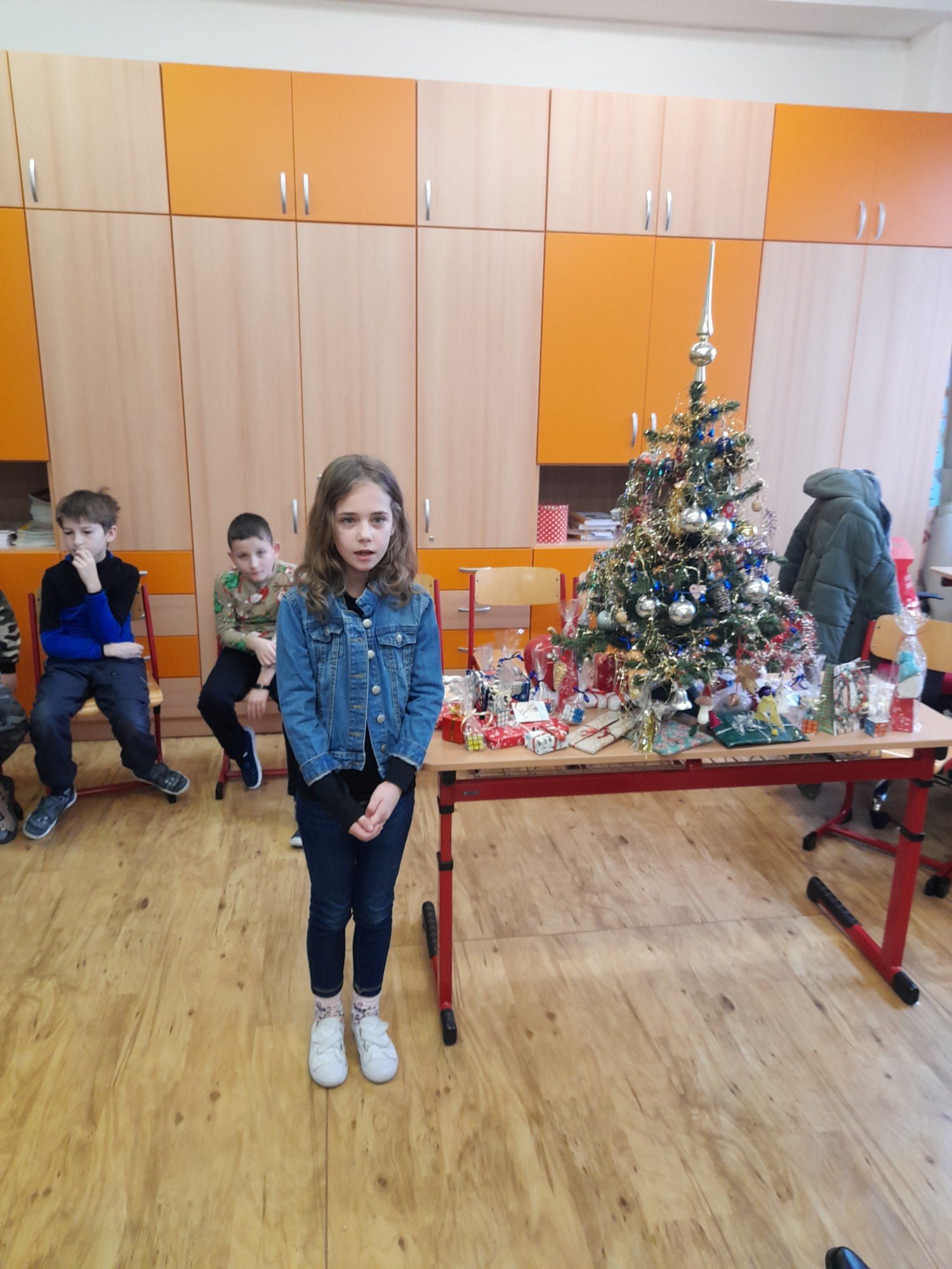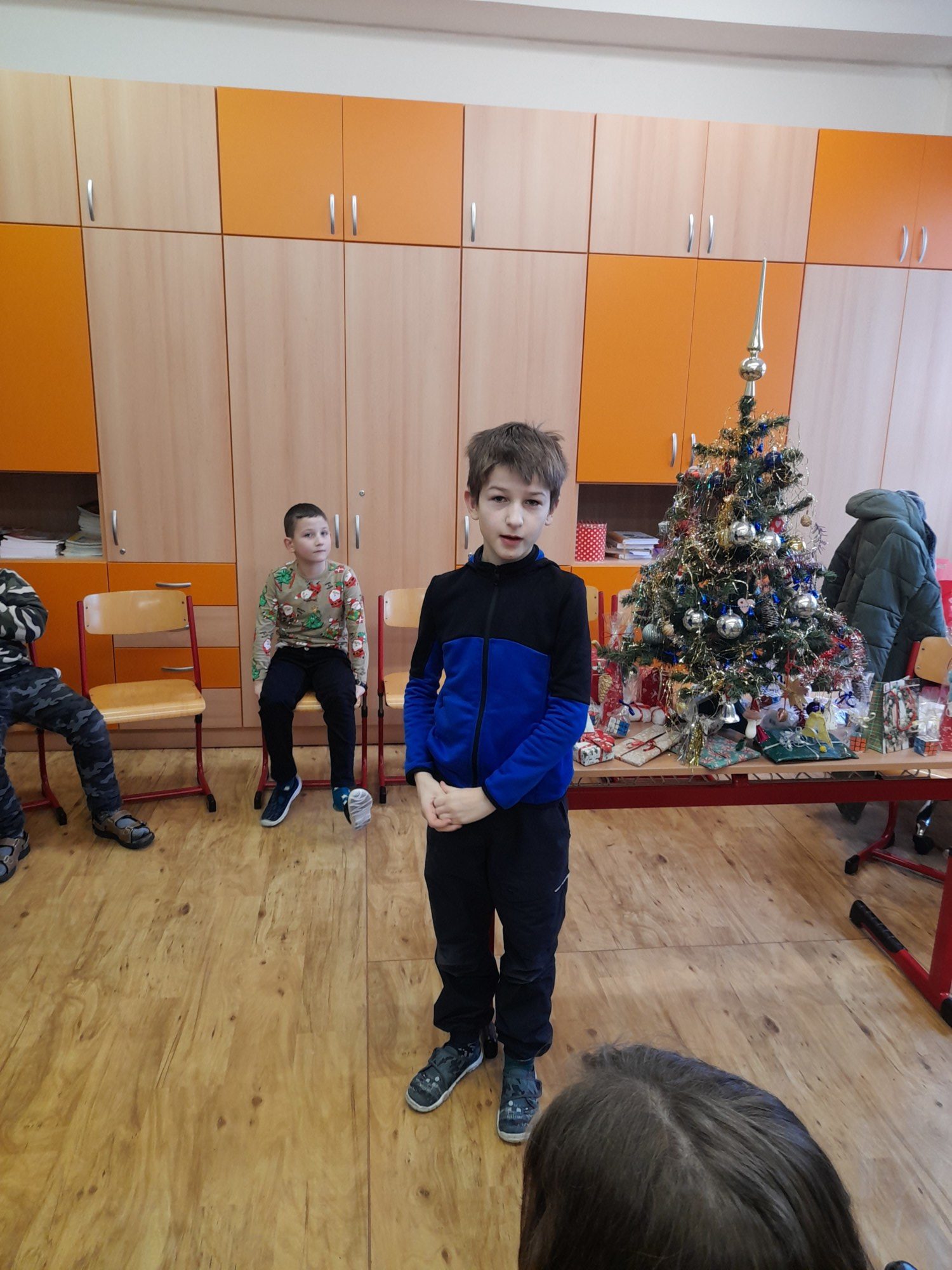 První hodinu pracovaly děti ve skupinkách na zimním obrázku a trénovaly počítání a vyjmenovaná slova, druhou hodinu v angličtině hrály hry i na chodbě. Třetí hodinu vyráběly z jablíček svícínek. Na závěr byla besídka s přednášením básniček, ochutnávkou cukroví od maminek a rozbalováním dárků. Dětem dopoledne uběhlo jako voda. Pak už jsme si jen popřáli krásné Vánoce.