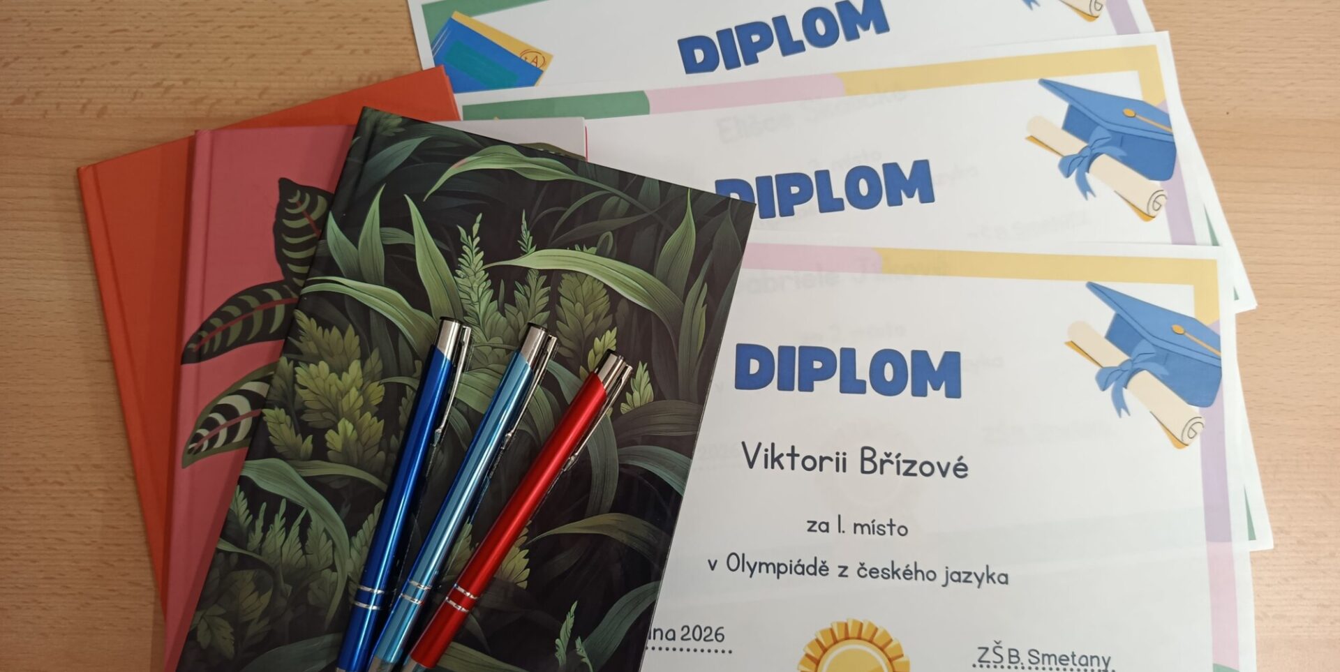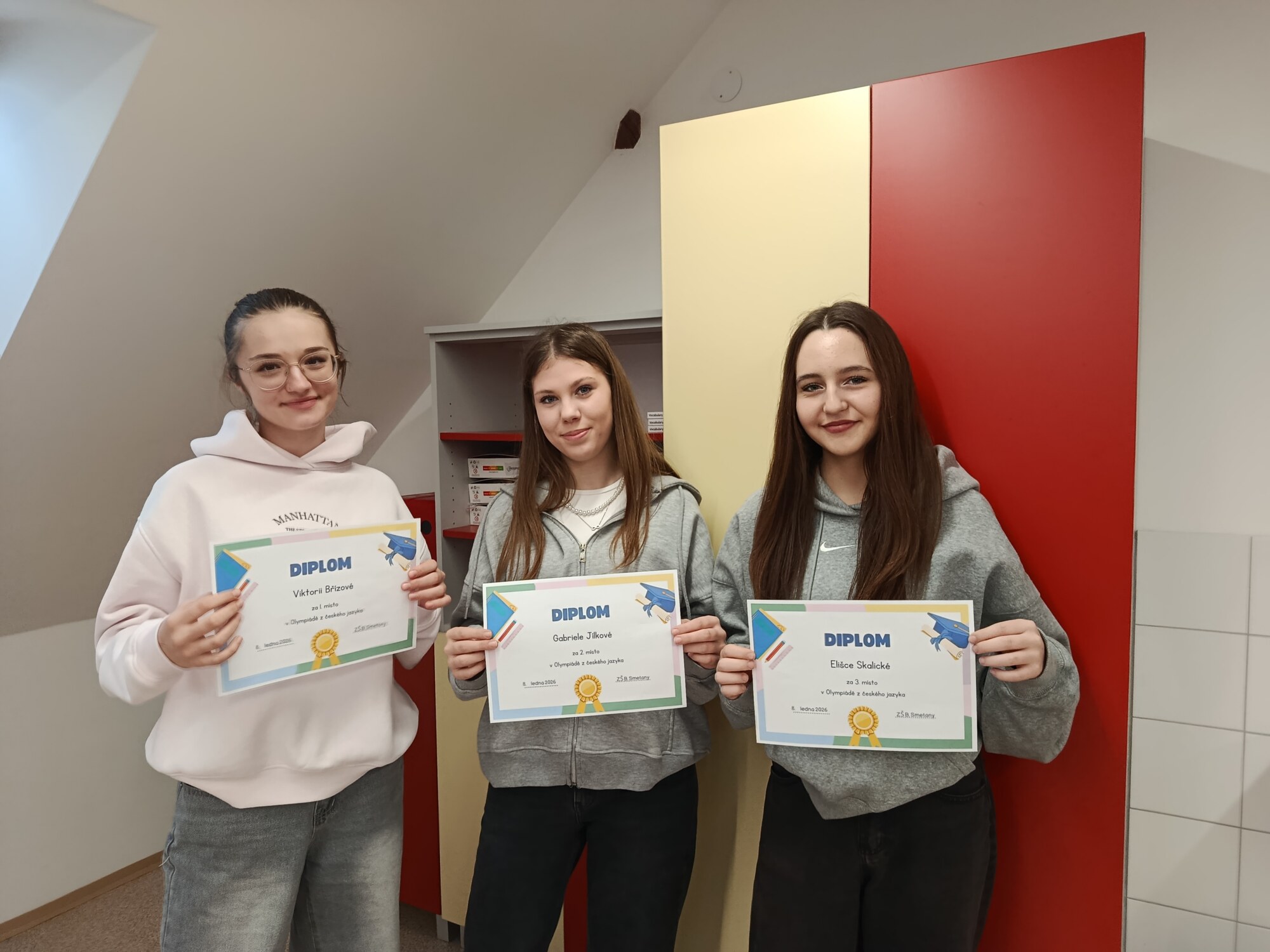 Do nového roku jsme vstoupili Olympiádou z českého jazyka, které se účastnili žáci 9. ročníků. V gramatické části žáci řešili netradiční jazykové úlohy. Zabývali se například nejrůznějšími významy slova „došel“, pravopisem či skloňováním cizích slov nebo textem písně Kaštany od Zdeňka Svěráka. Ve slohové části žáci psali prózu na téma O ztraceném předmětu. Ve svých povídkách žáci ztratili klíče, náramek nebo třeba brýle. Všichni účastníci zaslouží za své výkony na poli mateřského jazyka pochvalu. Největší gratulace putují k děvčatům z 9.B. Na 1. místě se umístila Viktorie Břízová, 2. skončila Gabriela Jílková a těsně za ní na 3. místě Eliška Skalická.