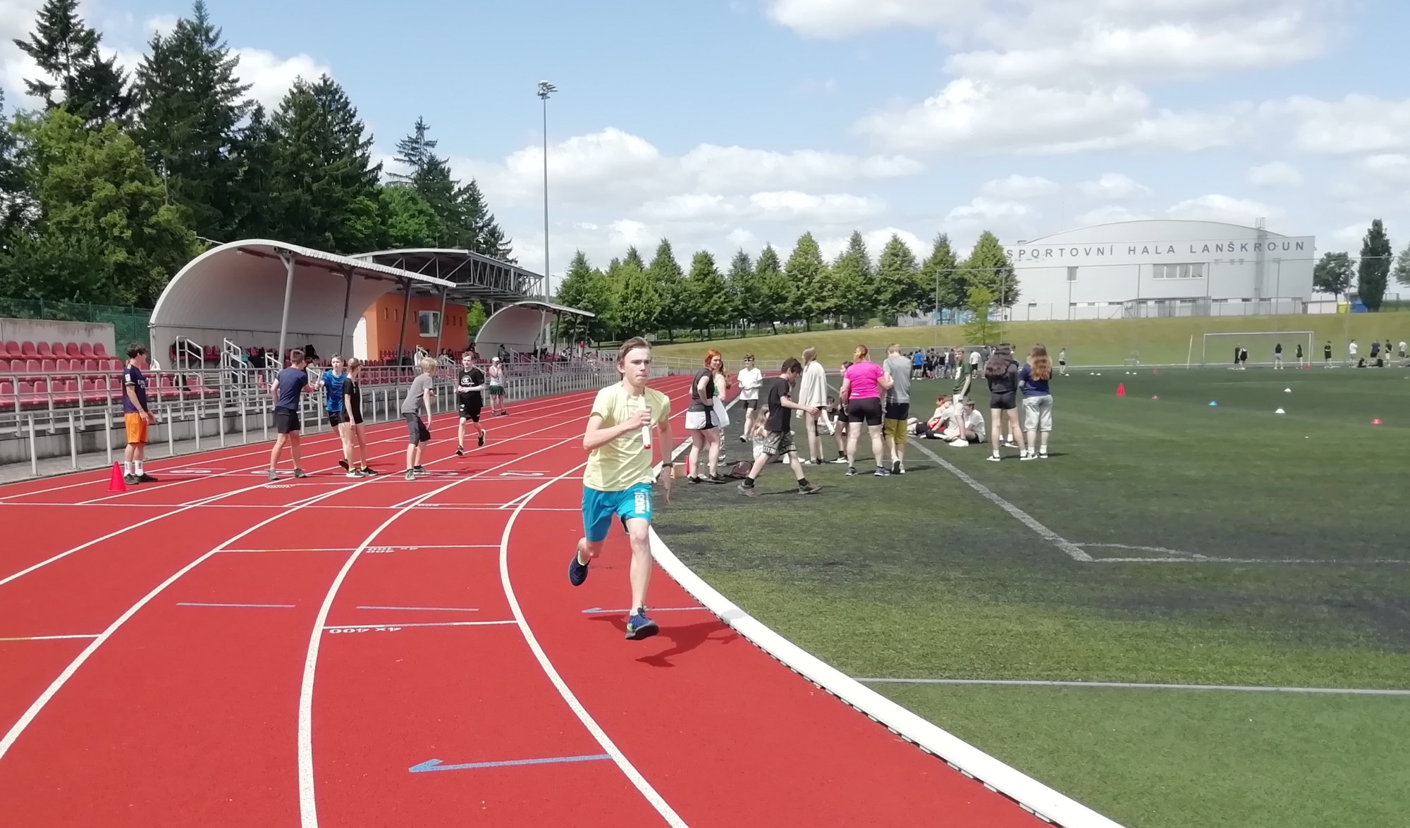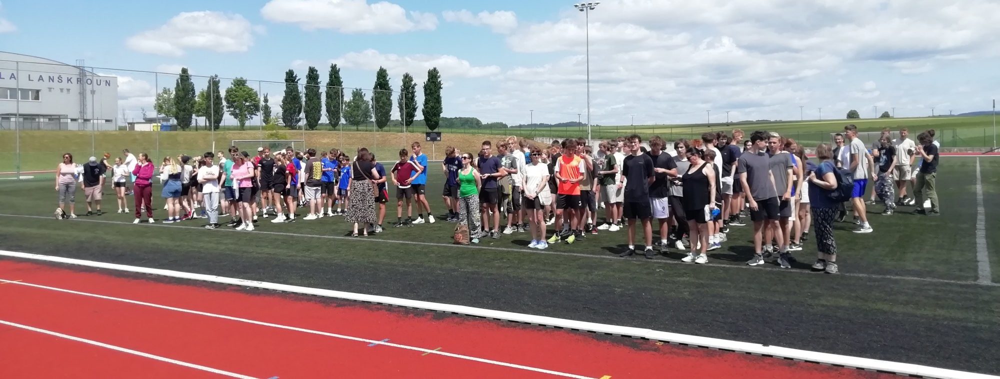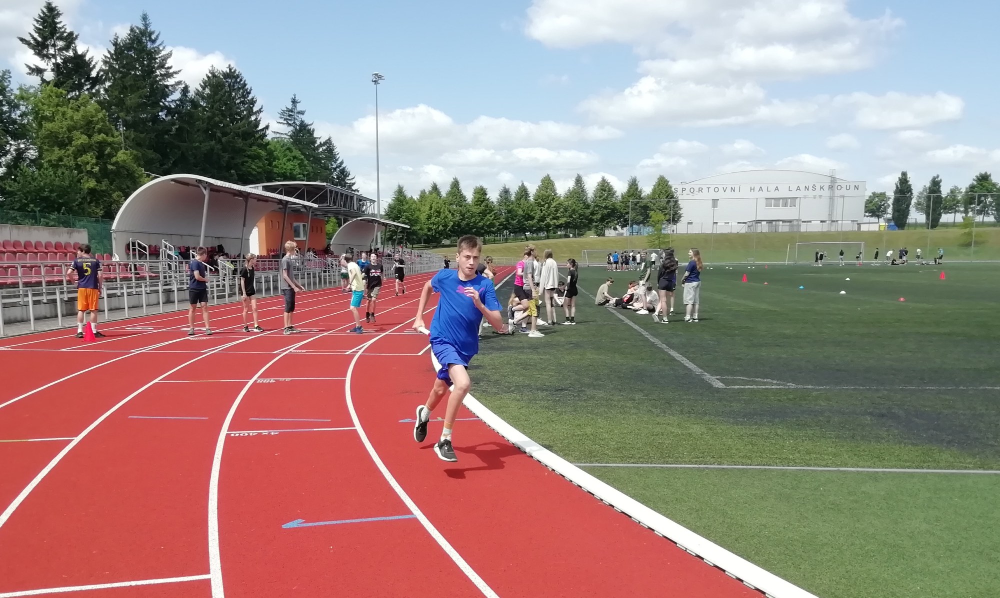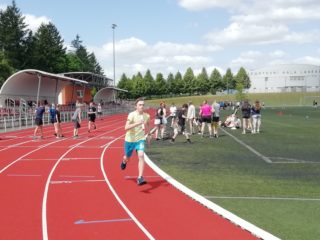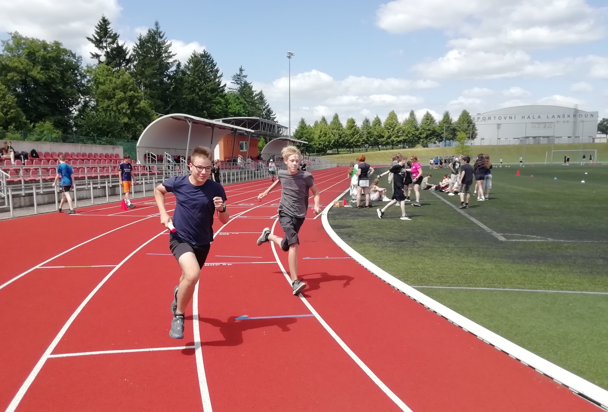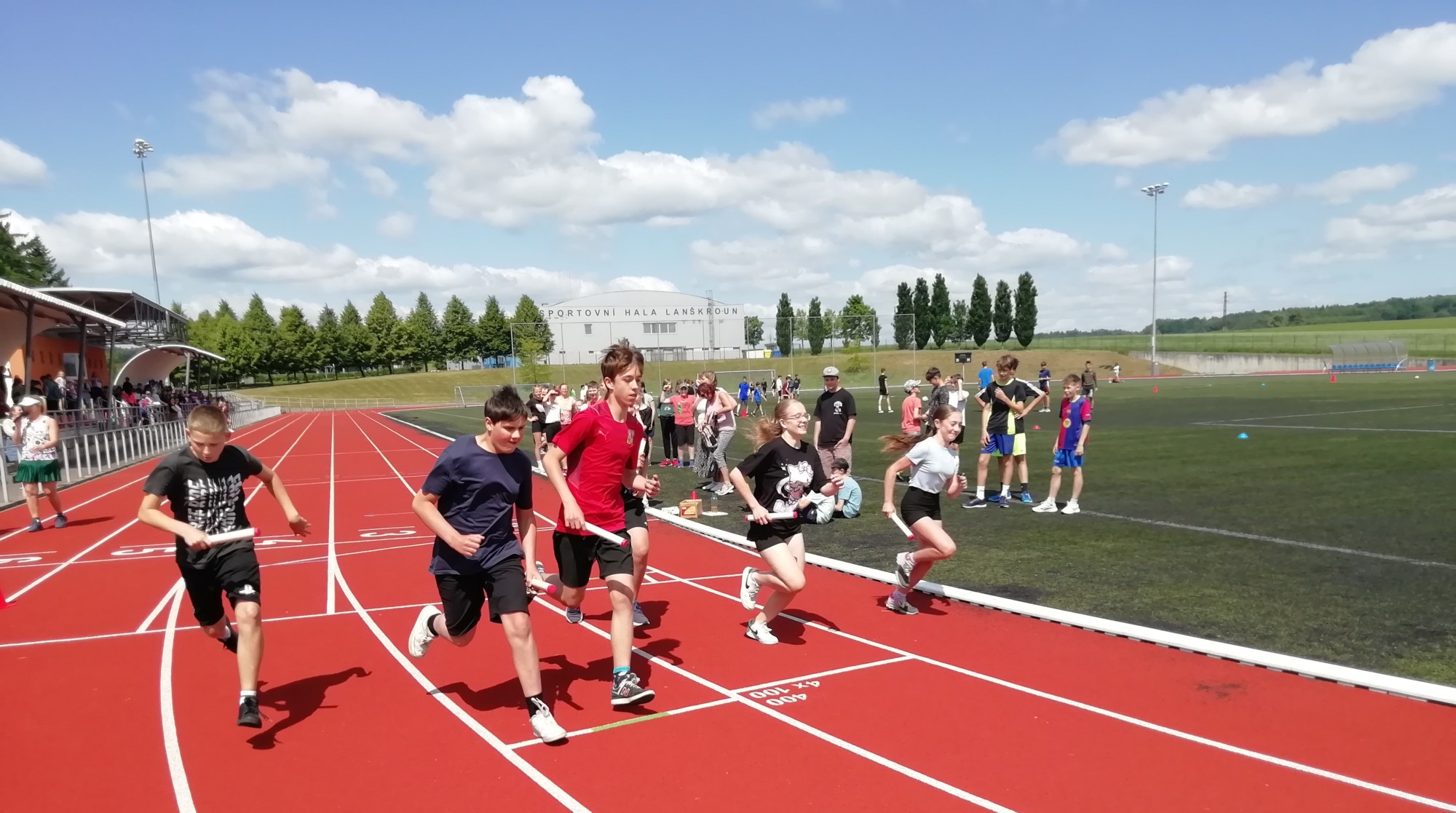 V deset hodin se jednotlivé třídy přesunuly na atletický stadion, kde v 10:30 celou akci slavnostně zahájili učitelé štafetovým během. Poté se do štafet pustili i žáci, kteří za bouřlivého fandění spolužáků předváděli obdivuhodné výkony na hranici svých možností – každý z nich uběhl 400 metrů.