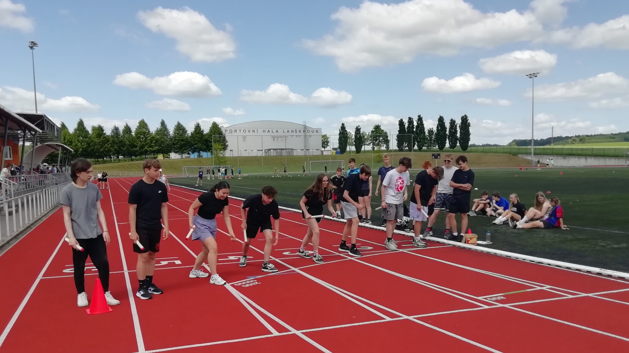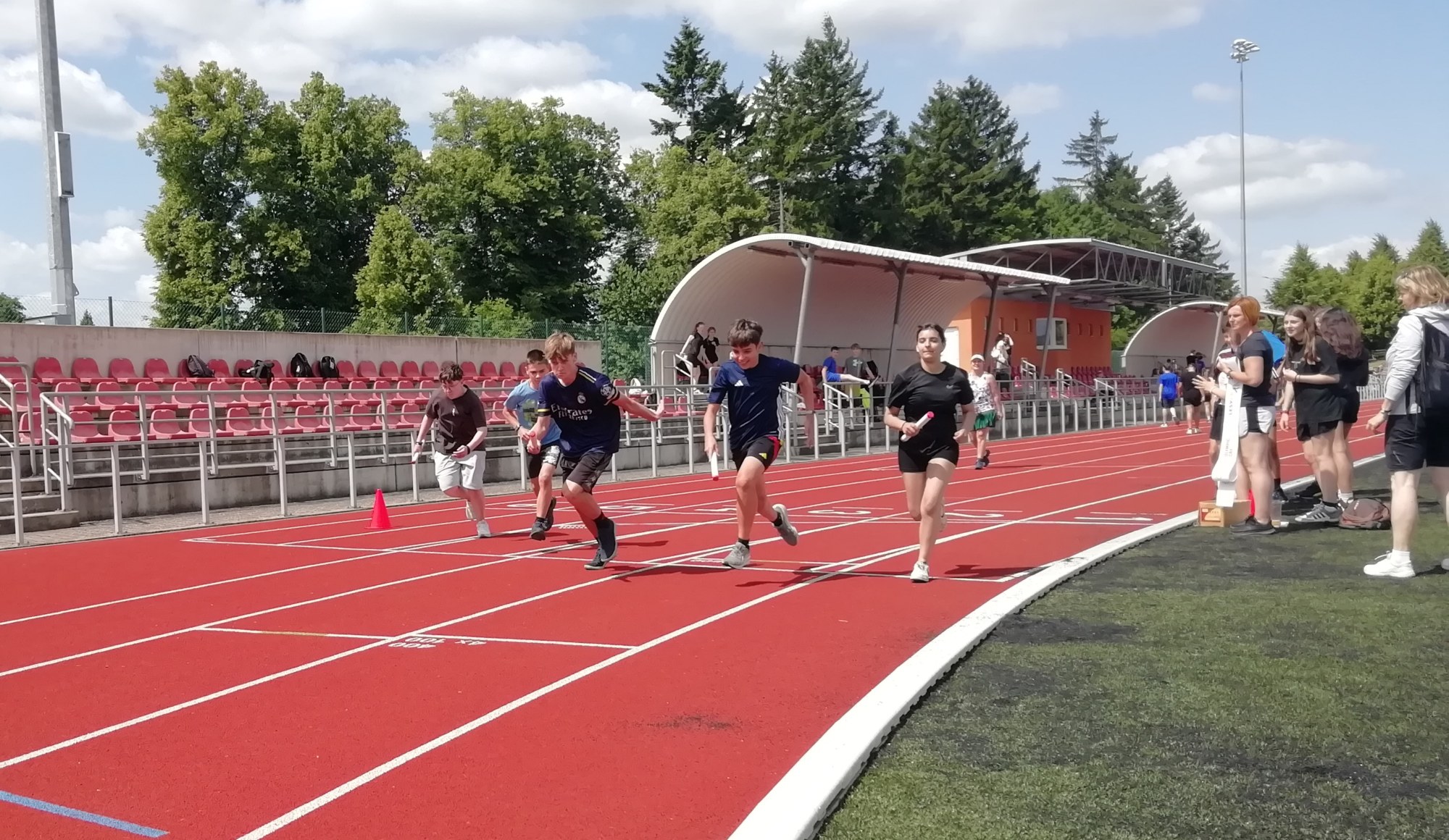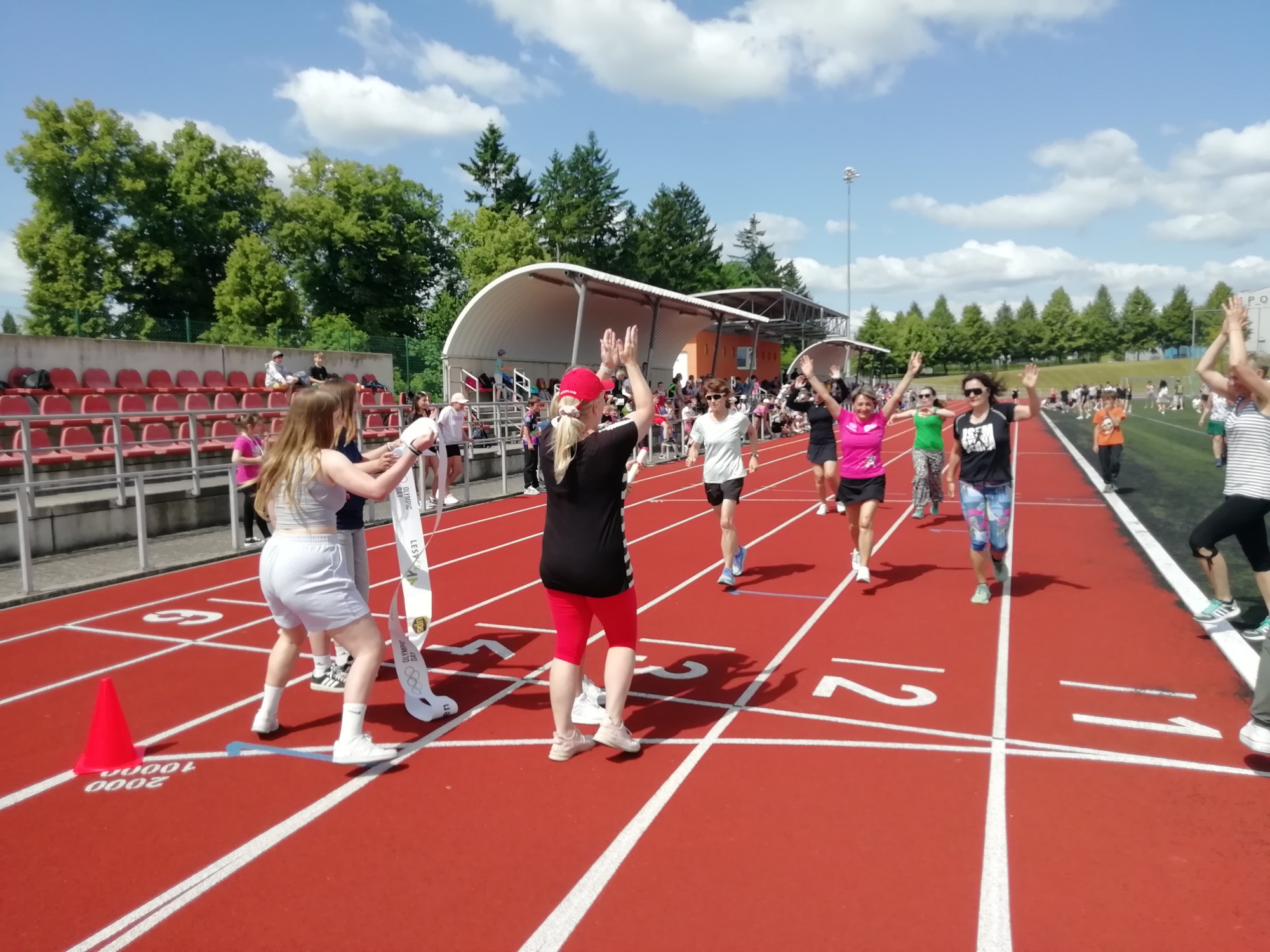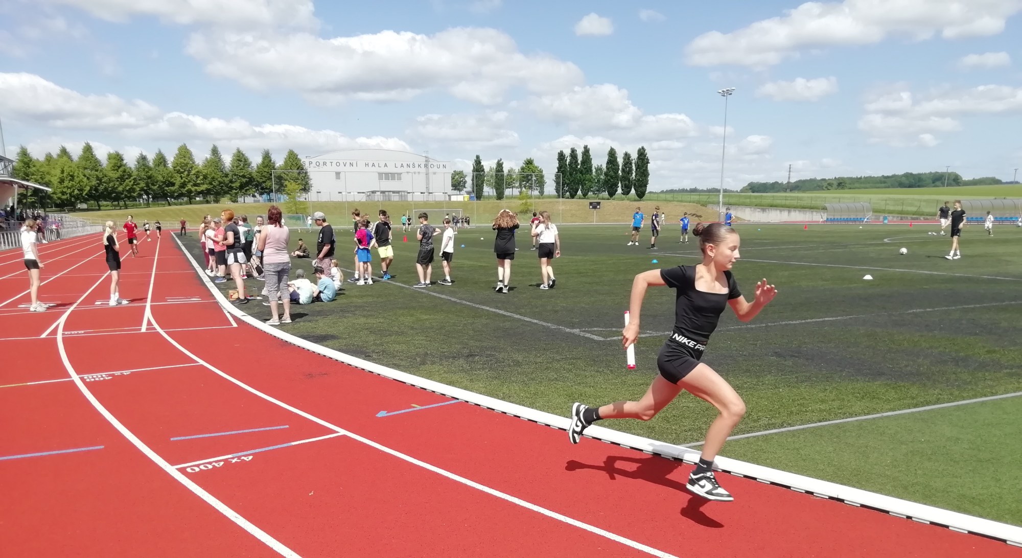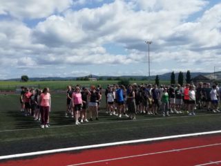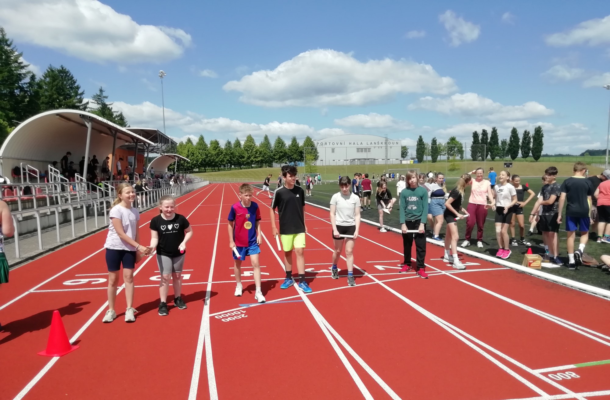 V deset hodin se jednotlivé třídy přesunuly na atletický stadion, kde v 10:30 celou akci slavnostně zahájili učitelé štafetovým během. Poté se do štafet pustili i žáci, kteří za bouřlivého fandění spolužáků předváděli obdivuhodné výkony na hranici svých možností – každý z nich uběhl 400 metrů.