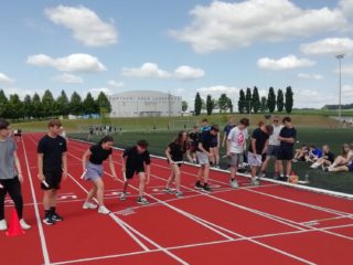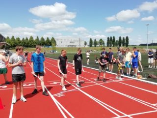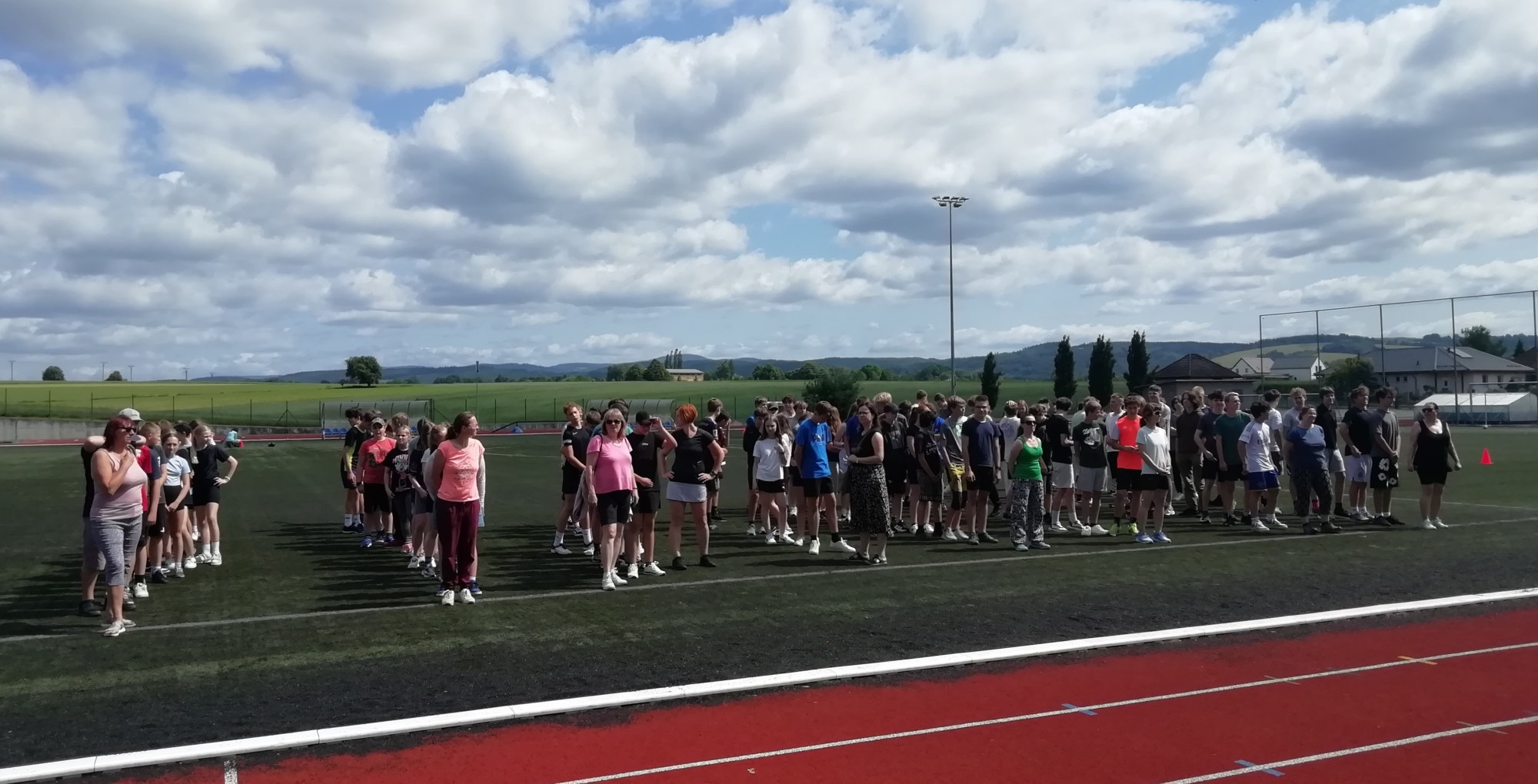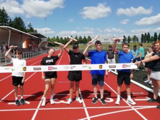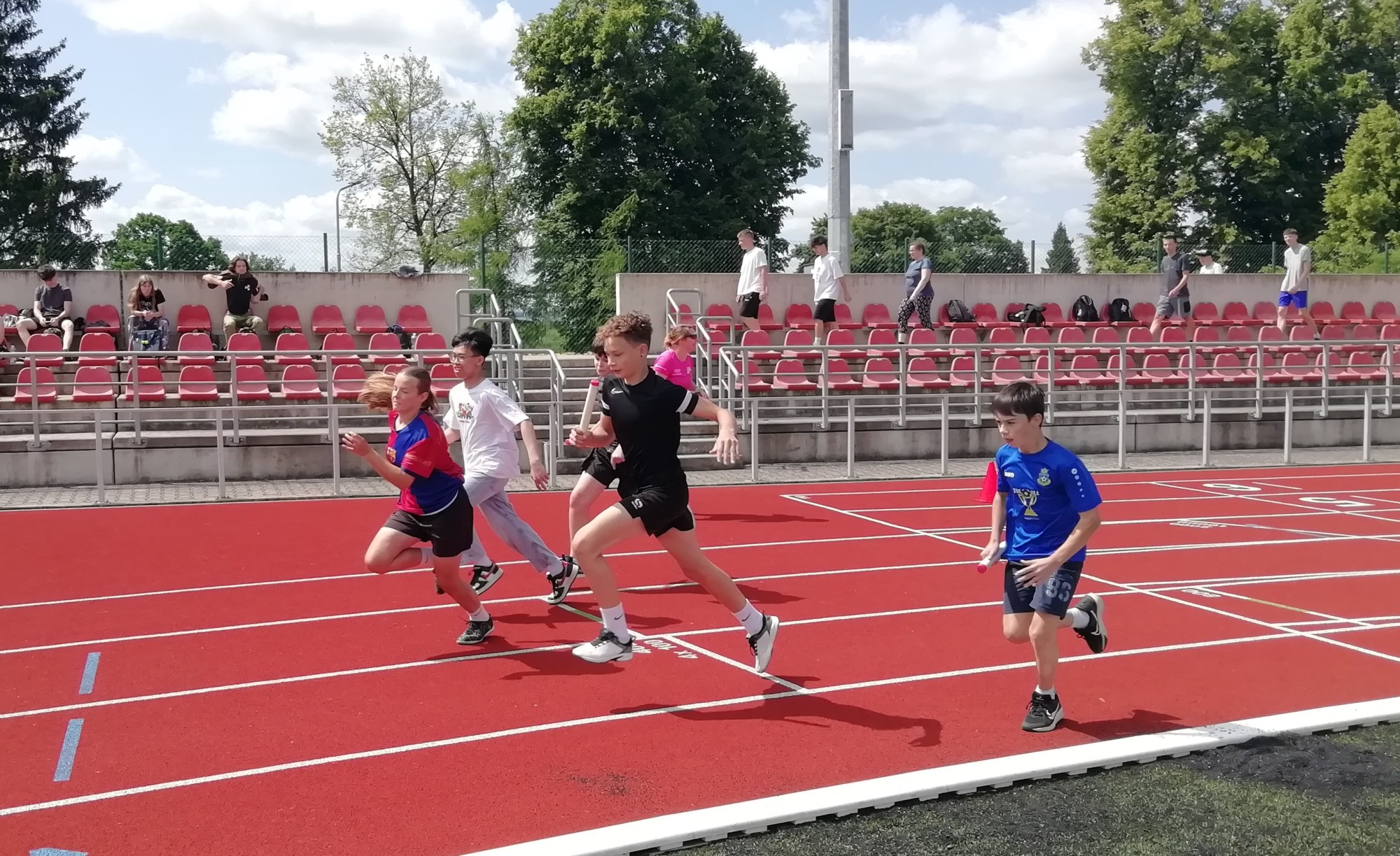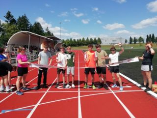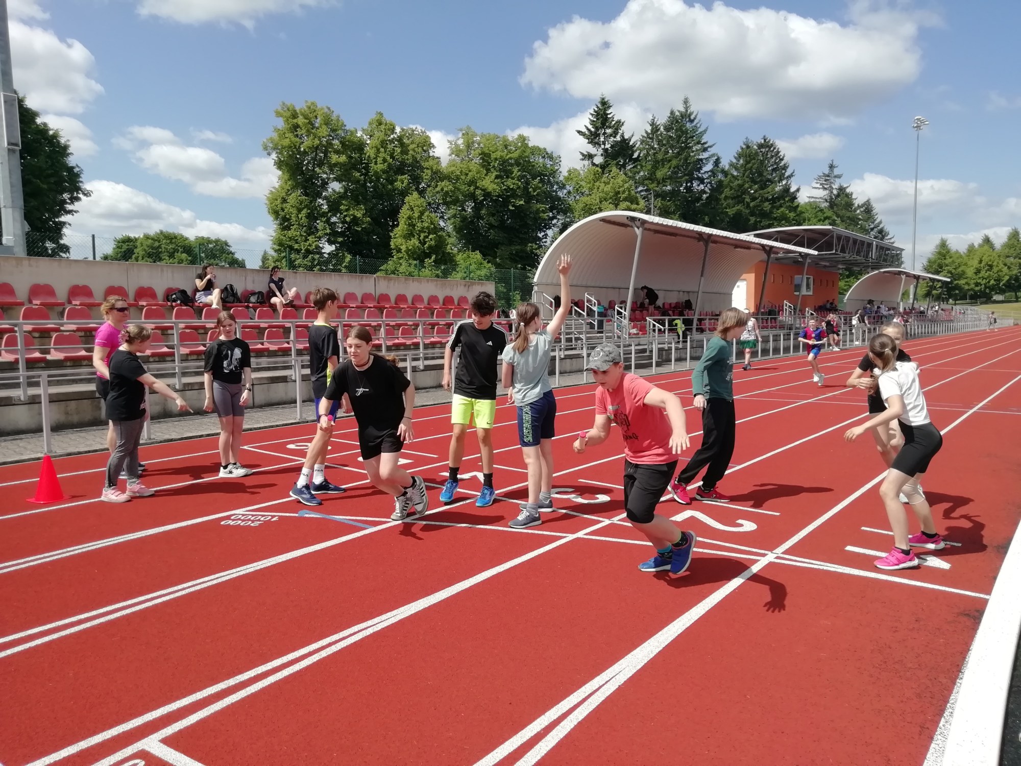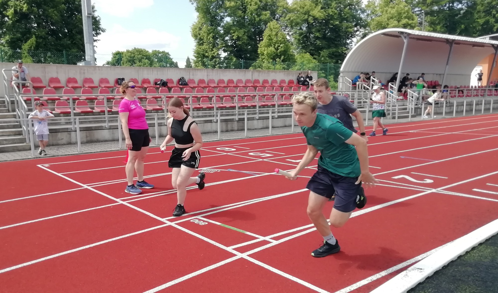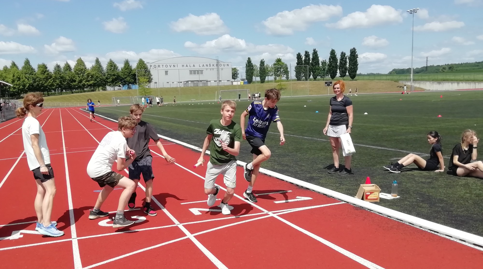 V deset hodin se jednotlivé třídy přesunuly na atletický stadion, kde v 10:30 celou akci slavnostně zahájili učitelé štafetovým během. Poté se do štafet pustili i žáci, kteří za bouřlivého fandění spolužáků předváděli obdivuhodné výkony na hranici svých možností – každý z nich uběhl 400 metrů.