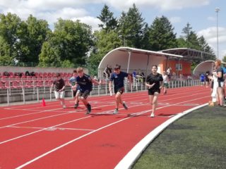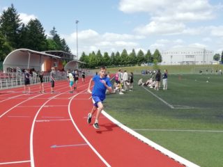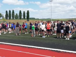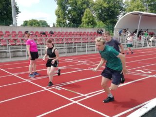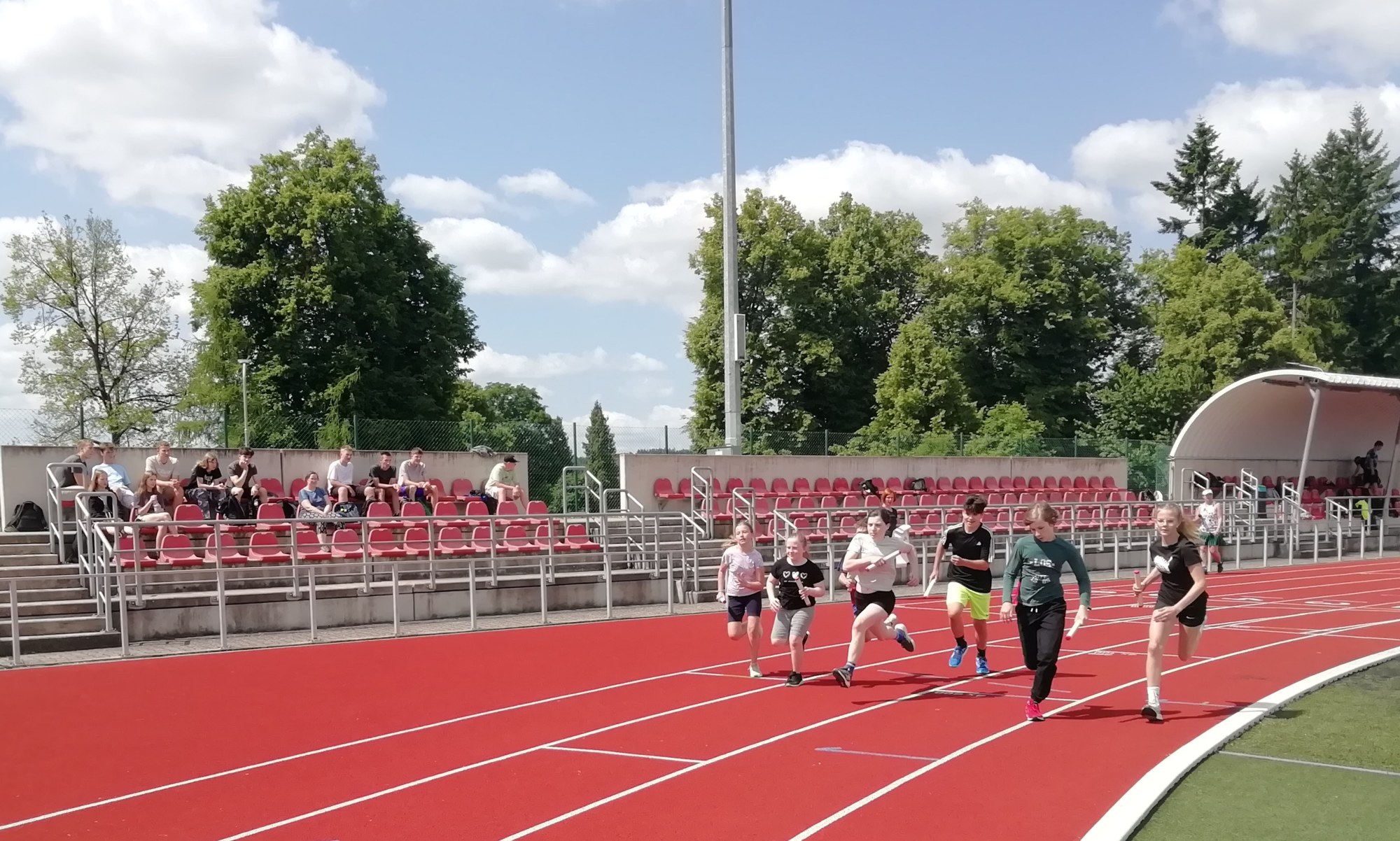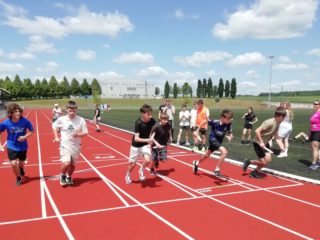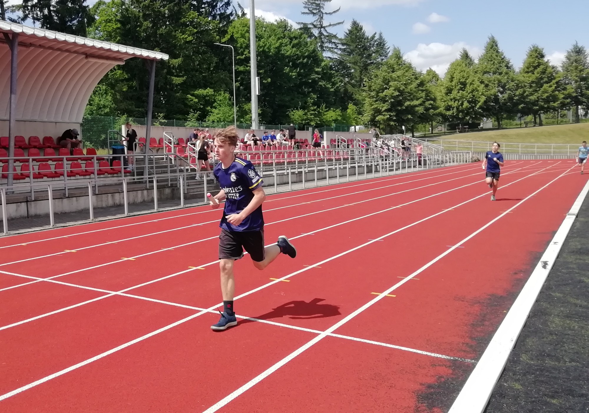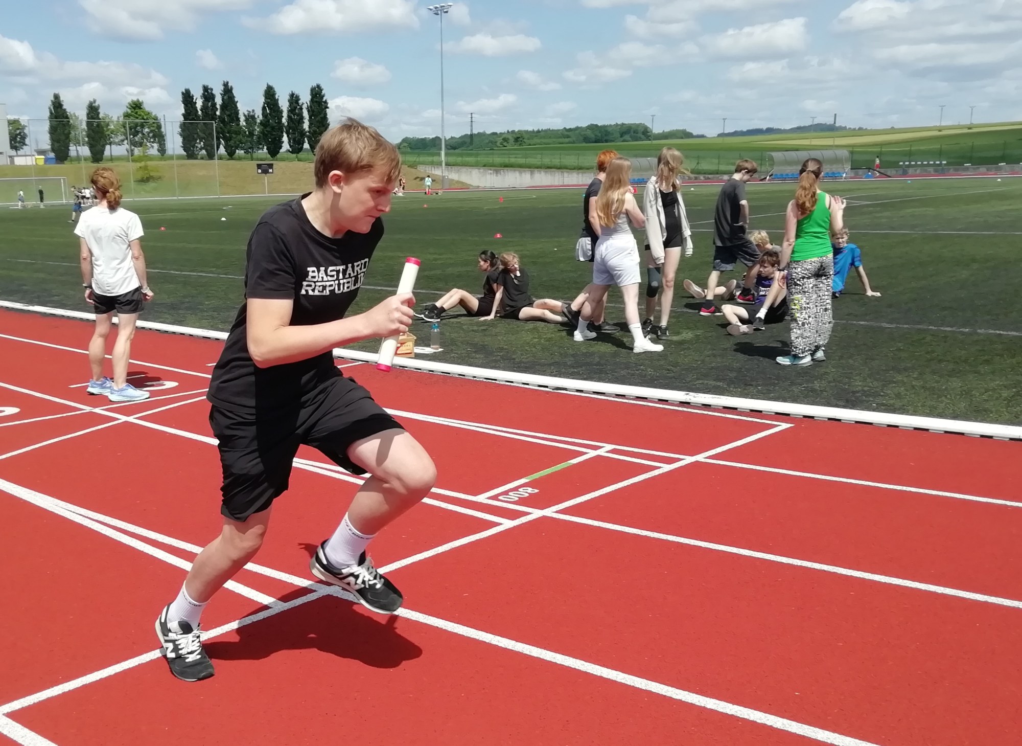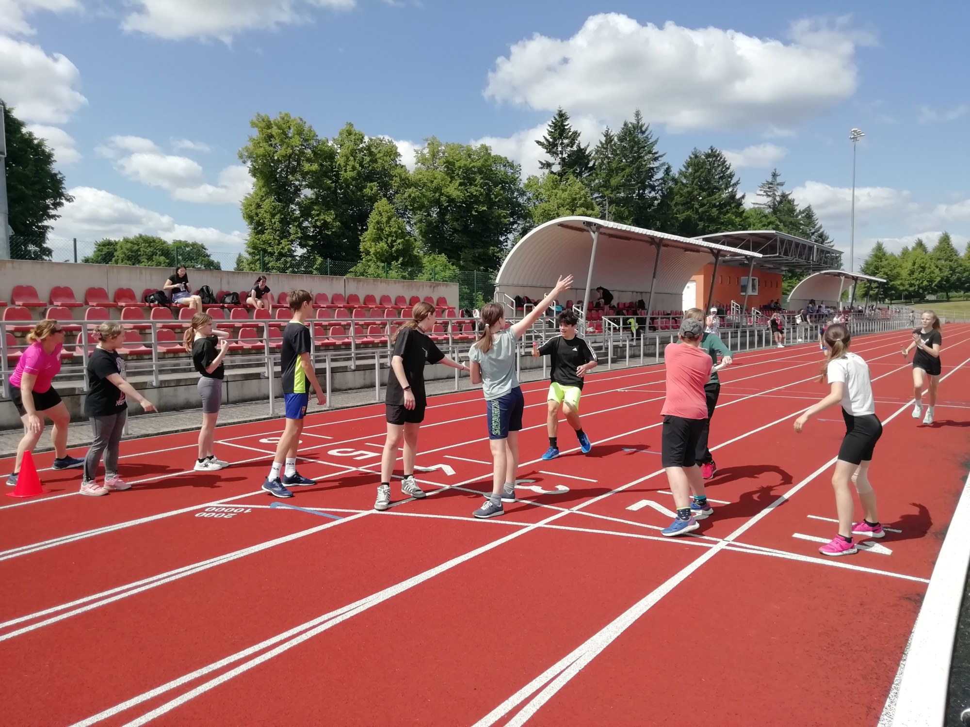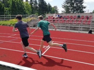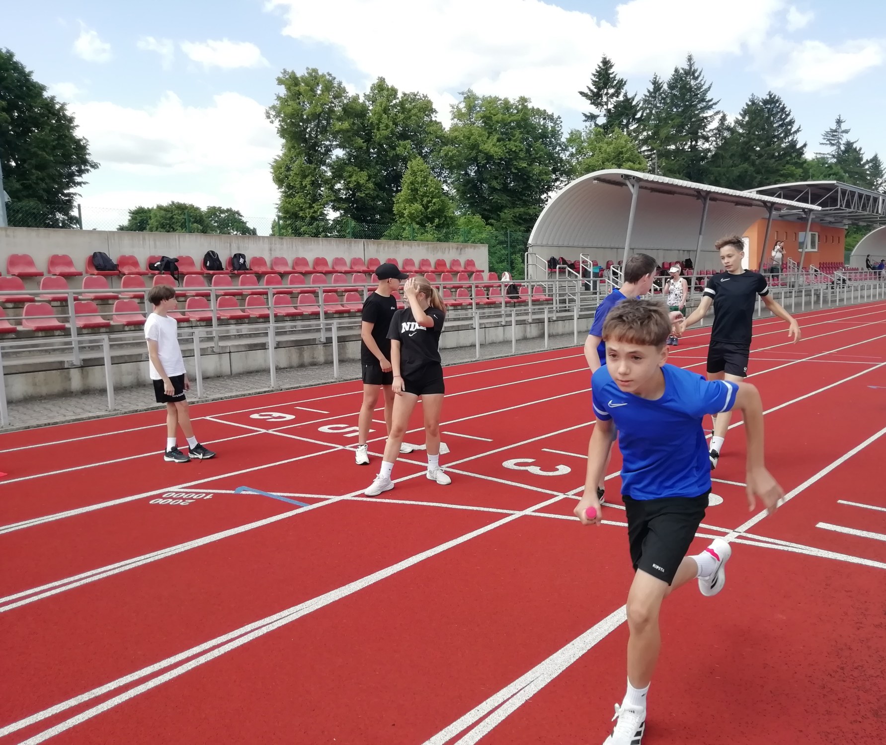 V deset hodin se jednotlivé třídy přesunuly na atletický stadion, kde v 10:30 celou akci slavnostně zahájili učitelé štafetovým během. Poté se do štafet pustili i žáci, kteří za bouřlivého fandění spolužáků předváděli obdivuhodné výkony na hranici svých možností – každý z nich uběhl 400 metrů.