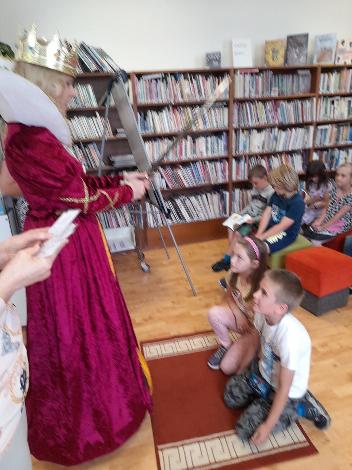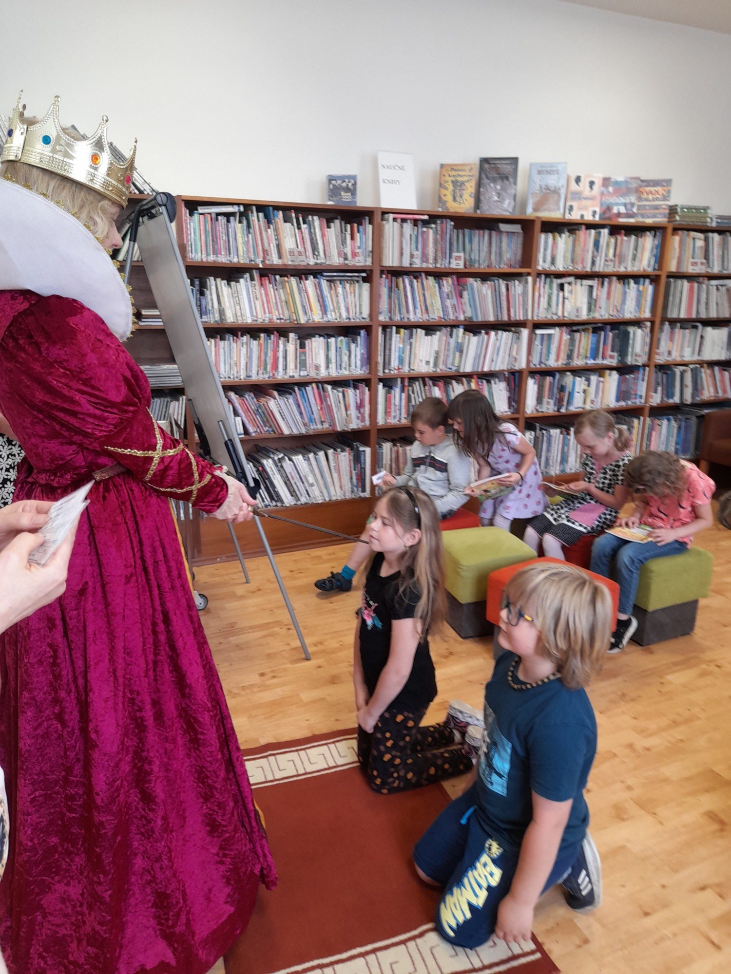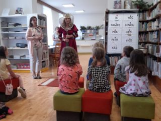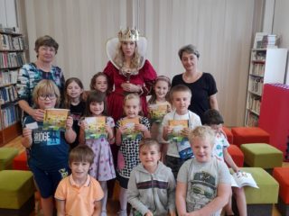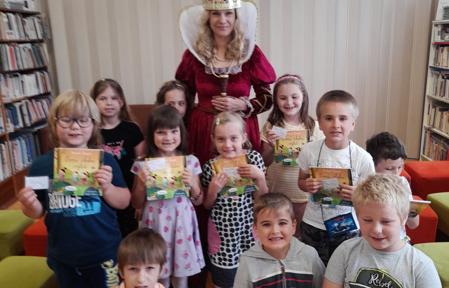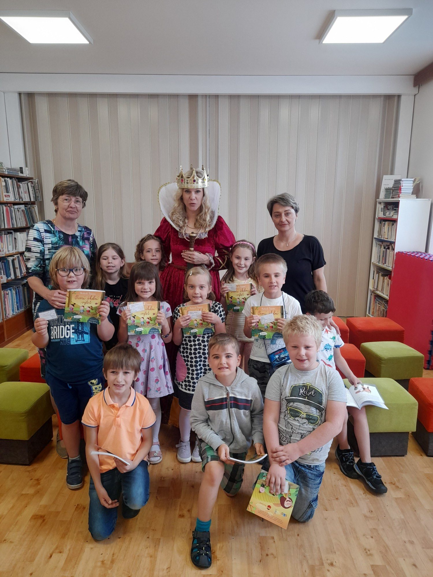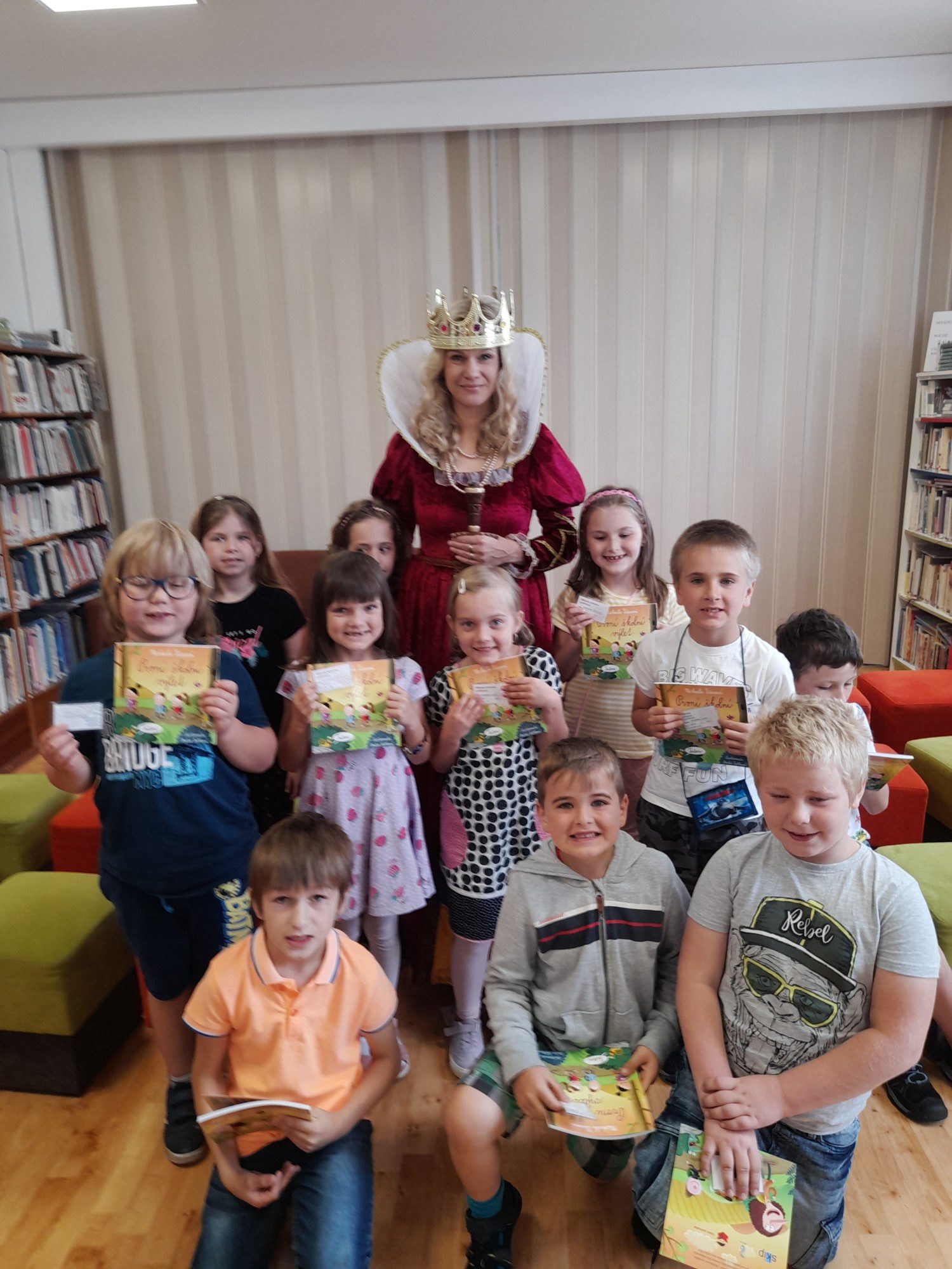 Dne 8. června třída 1.B navštívila knihovnu. Paní knihovnice dětem dávala různé úkoly a když byla s jejich plněním spokojena, naučila děti pokřik, aby si mohly zavolat královnu všech čtenářů. Ta je slavnostně při zvuku hudby pasovala na čtenáře. Děti dostaly knihu na prázdniny a také si půjčily poprvé knihu z knihovny. S královnou doufáme, že najdou ve čtení zalíbení a stanou se ze všech dobří čtenáři.