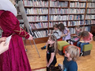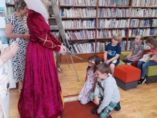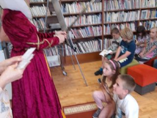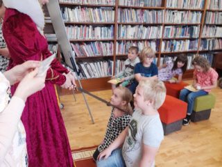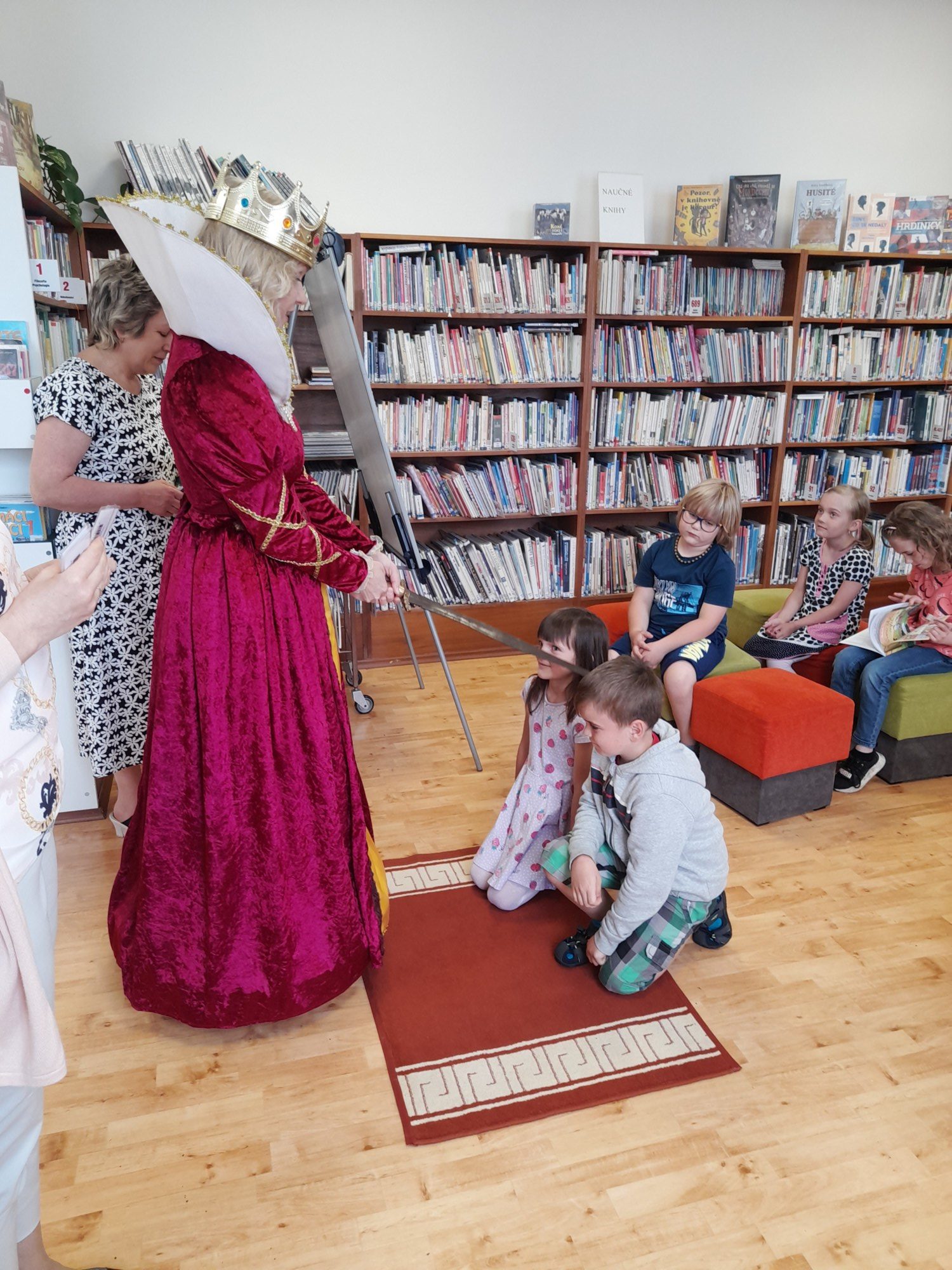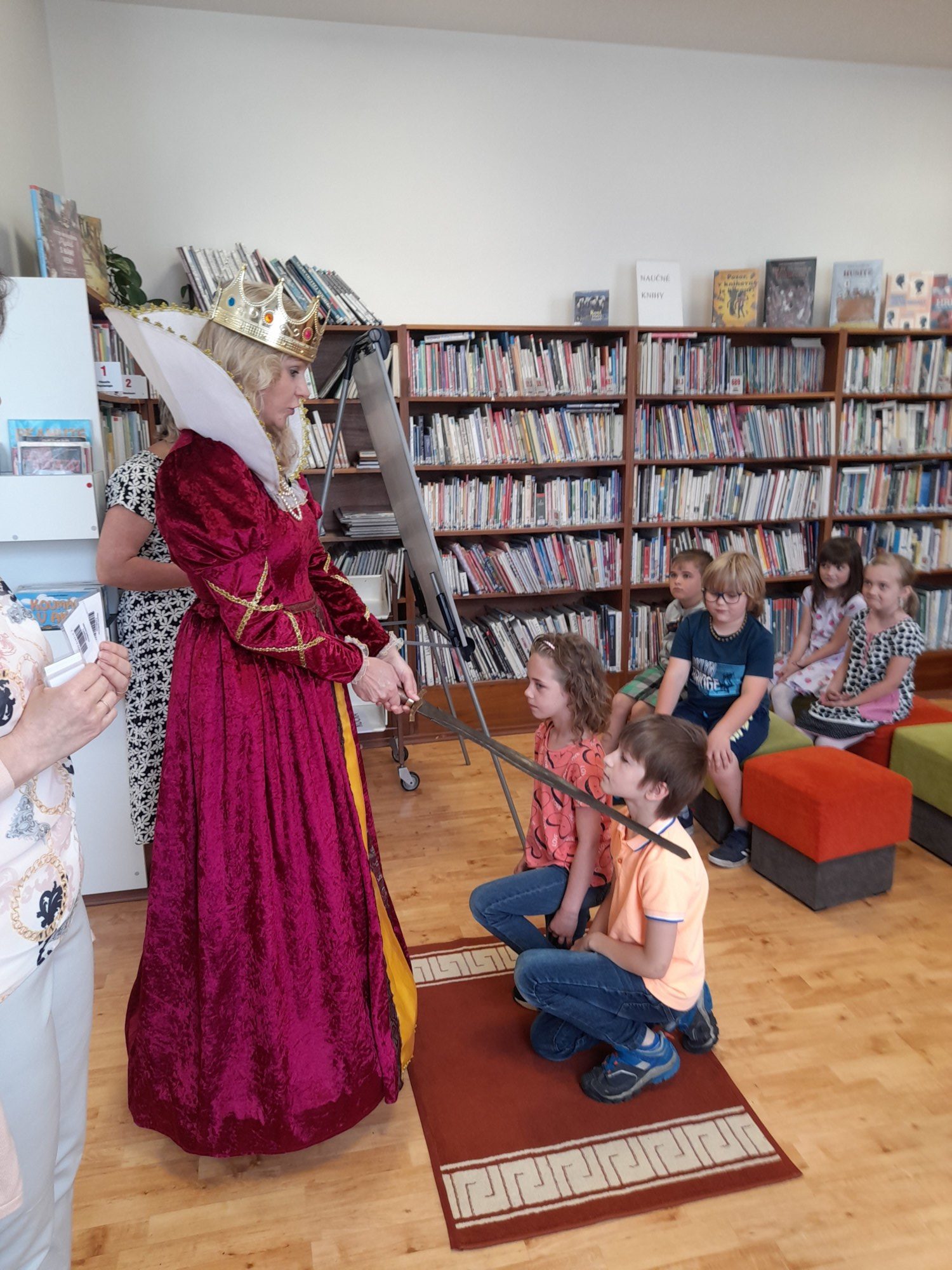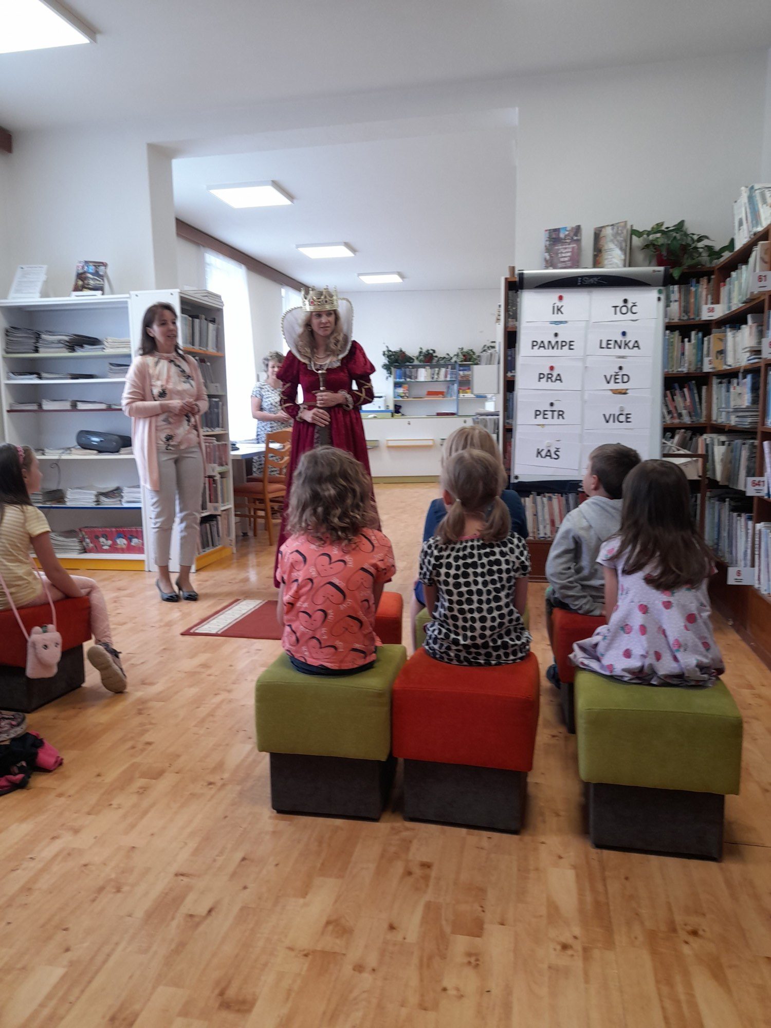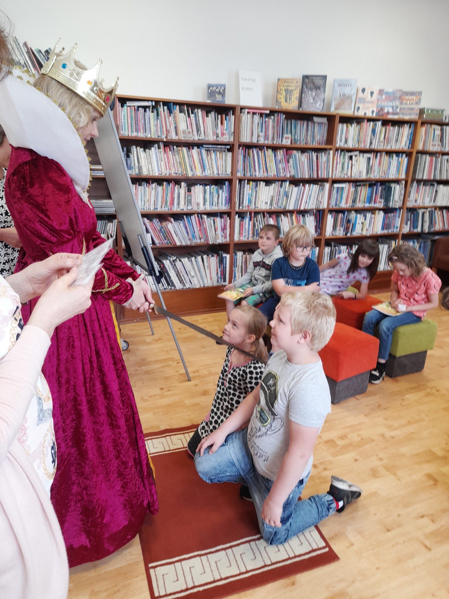Dne 8. června třída 1.B navštívila knihovnu. Paní knihovnice dětem dávala různé úkoly a když byla s jejich plněním spokojena, naučila děti pokřik, aby si mohly zavolat královnu všech čtenářů. Ta je slavnostně při zvuku hudby pasovala na čtenáře. Děti dostaly knihu na prázdniny a také si půjčily poprvé knihu z knihovny. S královnou doufáme, že najdou ve čtení zalíbení a stanou se ze všech dobří čtenáři.