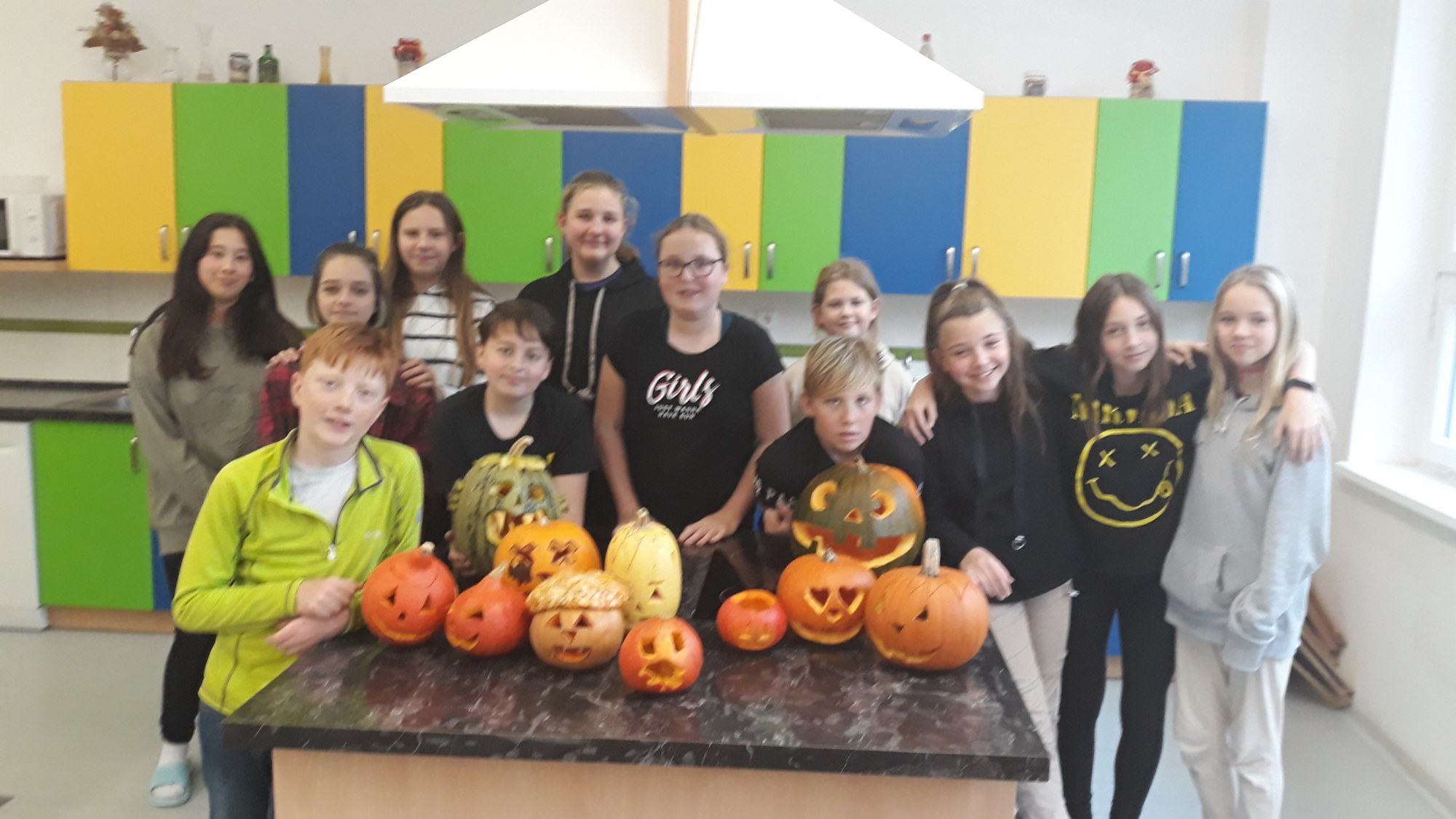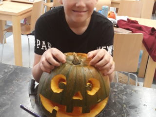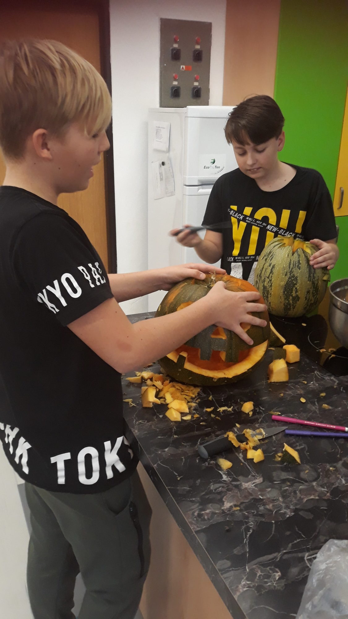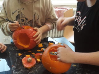 V úterý 2. listopadu jsme se se zpožděním pustili do vyřezávání halloweenských dýní. Práce nás moc bavila a výsledek byl skvělý. Dýně jsme si nakonec odnesli domů a těšili se , až si je večer doma rozsvítíme.