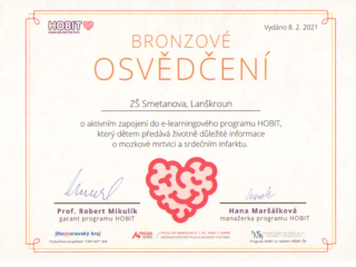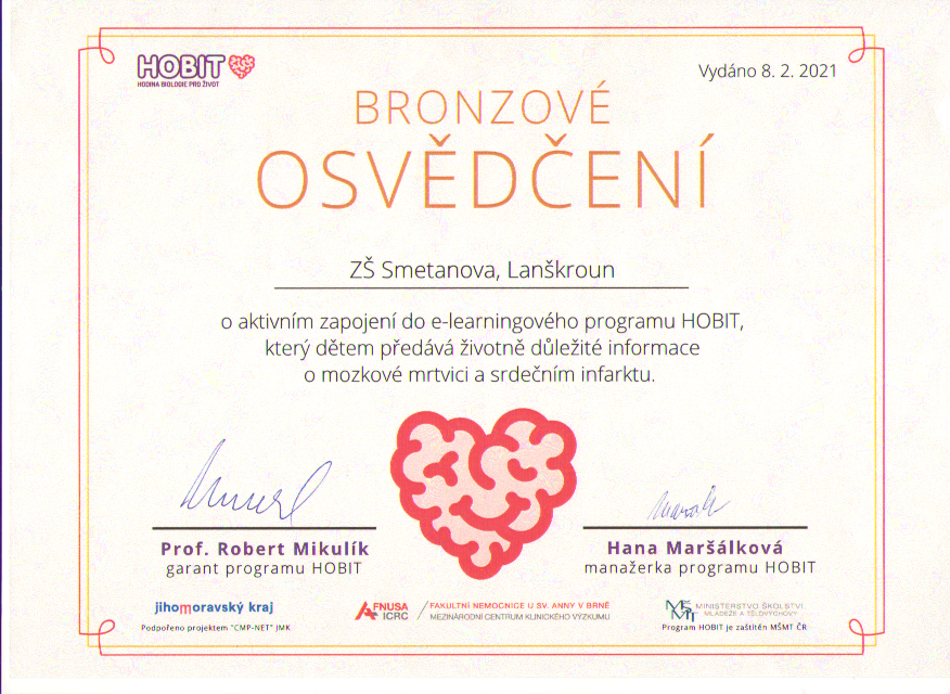 Konec ledna jsme si ve vyšších ročnících oživili projektem HOBIT, ve kterém se žáci seznamovali s příznaky mozkové mrtvice a srdečního infarktu, aby dokázali tato onemocnění včas rozpoznat a zavolat pomoc. Projekt proběhl vzhledem k situaci distančně, ale i přes drobné technické potíže si s tím žáci 8.A, 9.A i 9.B velmi dobře poradili. Koncem druhého pololetí si vše zopakujeme.
