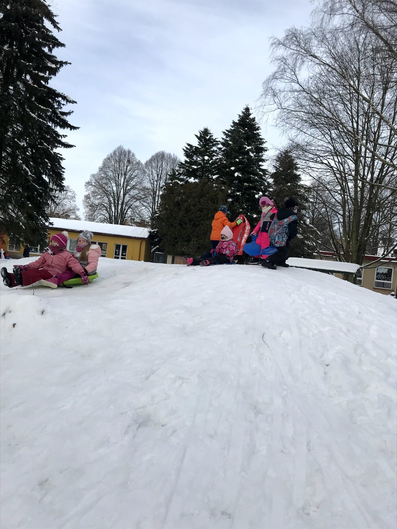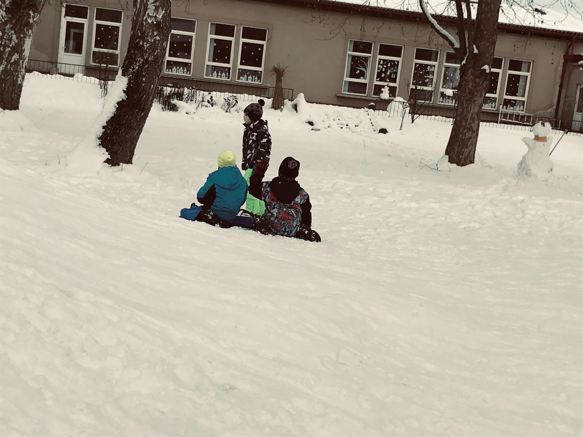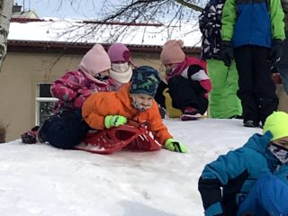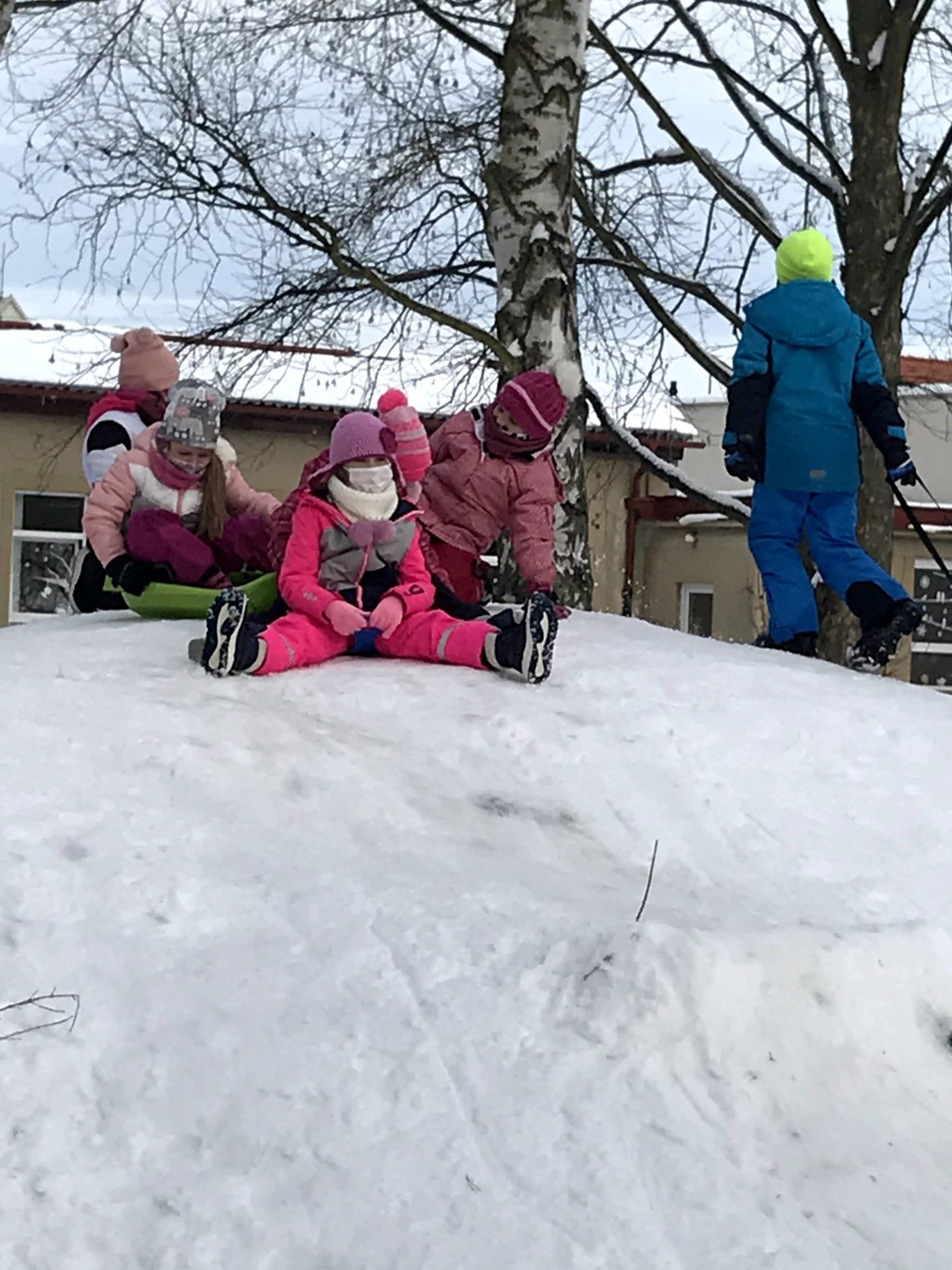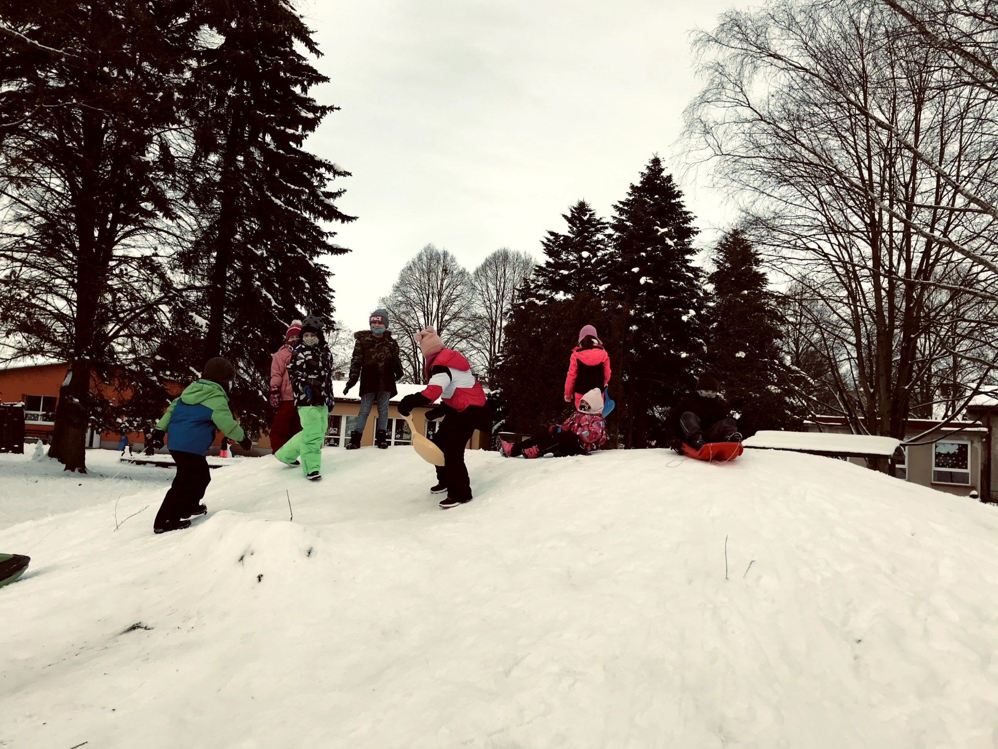Během měsíců ledna i února napadlo hodně sněhu. Děti ze školní družiny každý den po obědě trávily nejméně hodinu venku. Na zahradě sáňkovaly, bobovaly, a také stavěly sněhuláky. Bylo to moc fajn, protože po dlouhé době si užily sněhu.