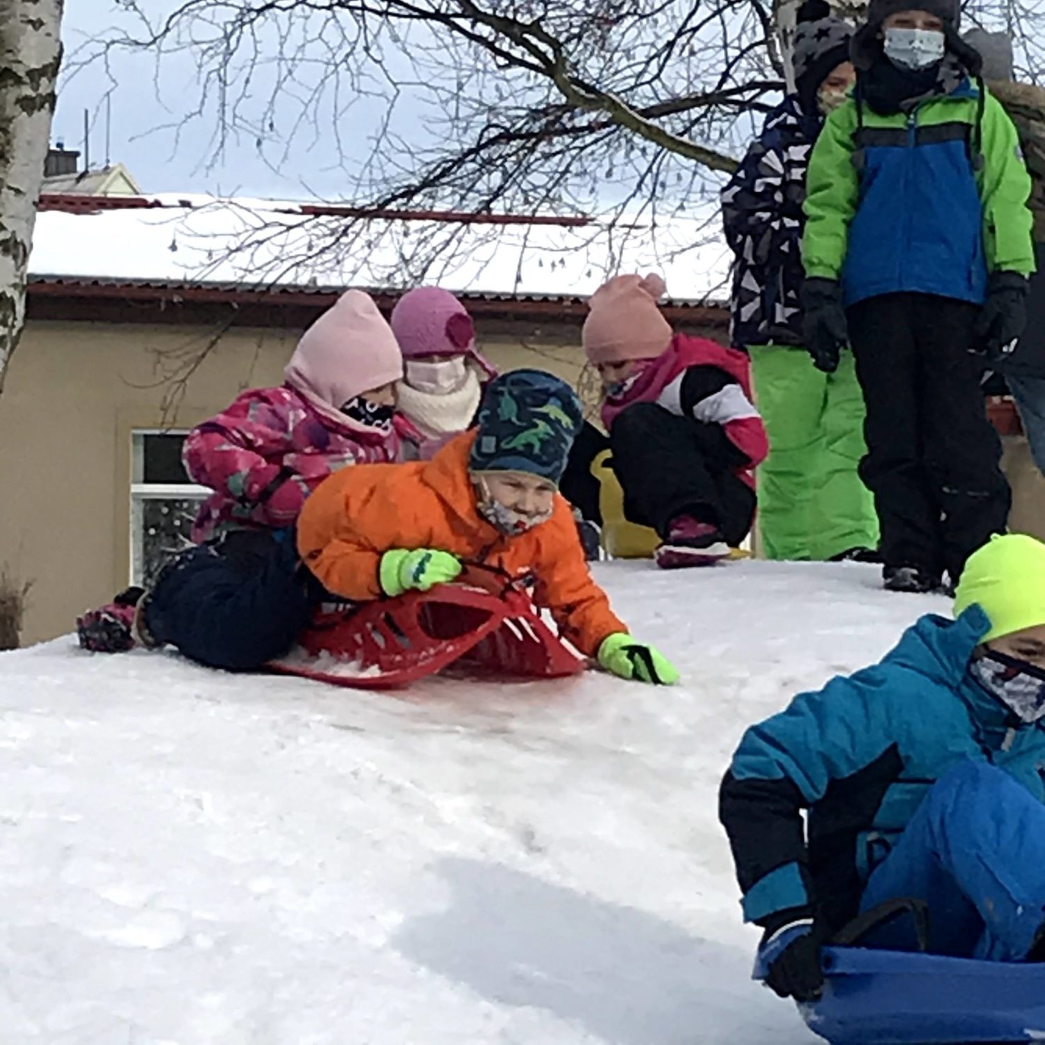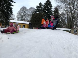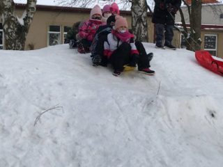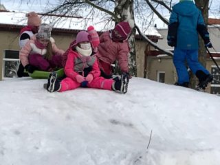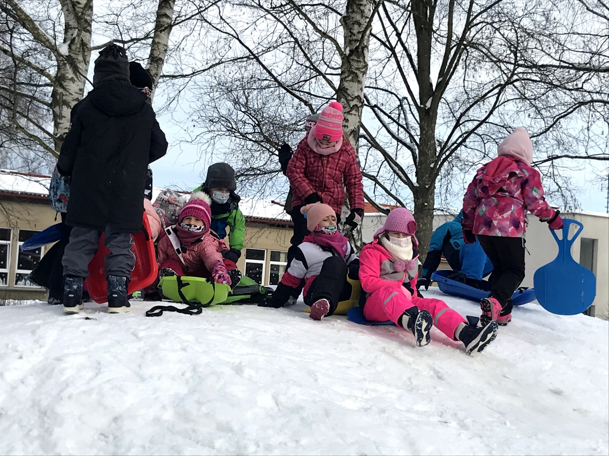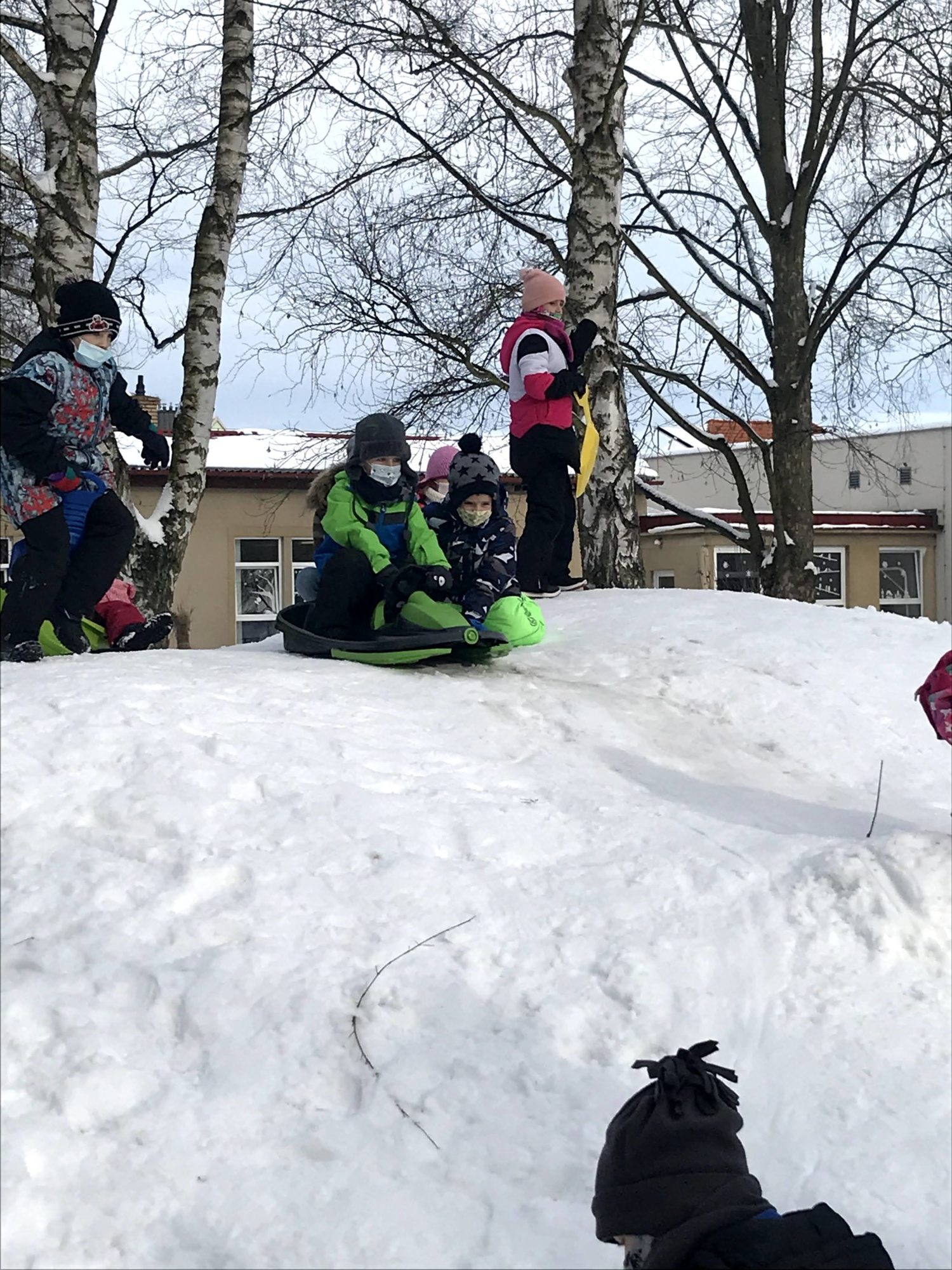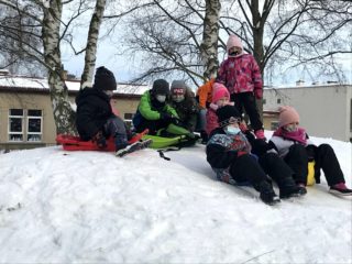Během měsíců ledna i února napadlo hodně sněhu. Děti ze školní družiny každý den po obědě trávily nejméně hodinu venku. Na zahradě sáňkovaly, bobovaly, a také stavěly sněhuláky. Bylo to moc fajn, protože po dlouhé době si užily sněhu.