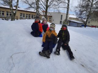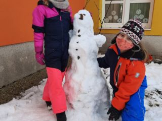 Letošní leden je opravdu zimním měsícem. Sněhové vločky zasypaly naši školní zahradu, takže jsme ji mohli krásně využít – stavění sněhuláků, bunkrů, klouzání a sáňkování…
