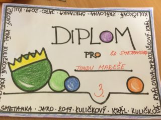 Naše školní družina letos pořádala soutěž v cvrnkání kuliček. Po základních kolech v každém oddělení prvňáčků na jednotlivých školách se finále konalo právě na naší škole. Putovní korunu pro vítěze jsme sice neobhájili, ale soutěž byla velmi napínavá až do poslední chvíle. Naší školní družinu zastupoval Toník Mareš, který vyhrál nad Matyášem Elnerem.