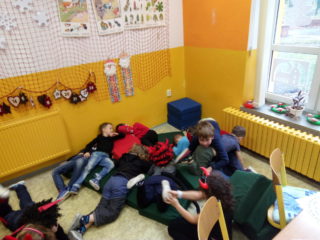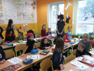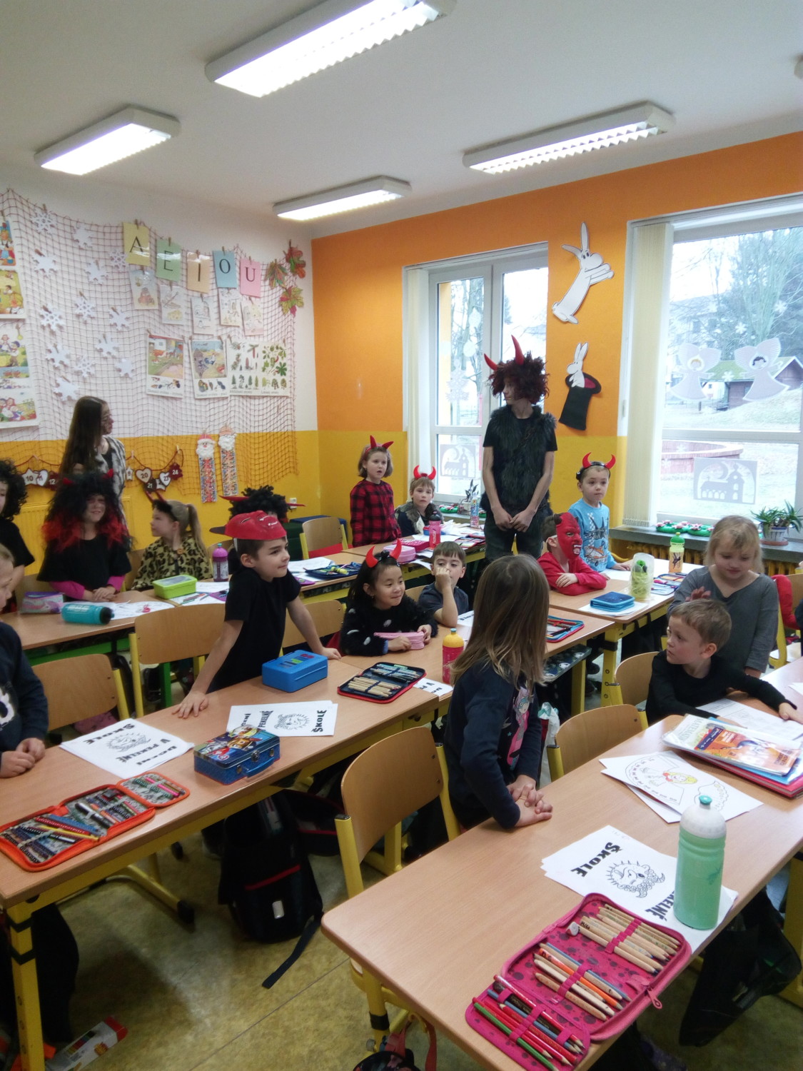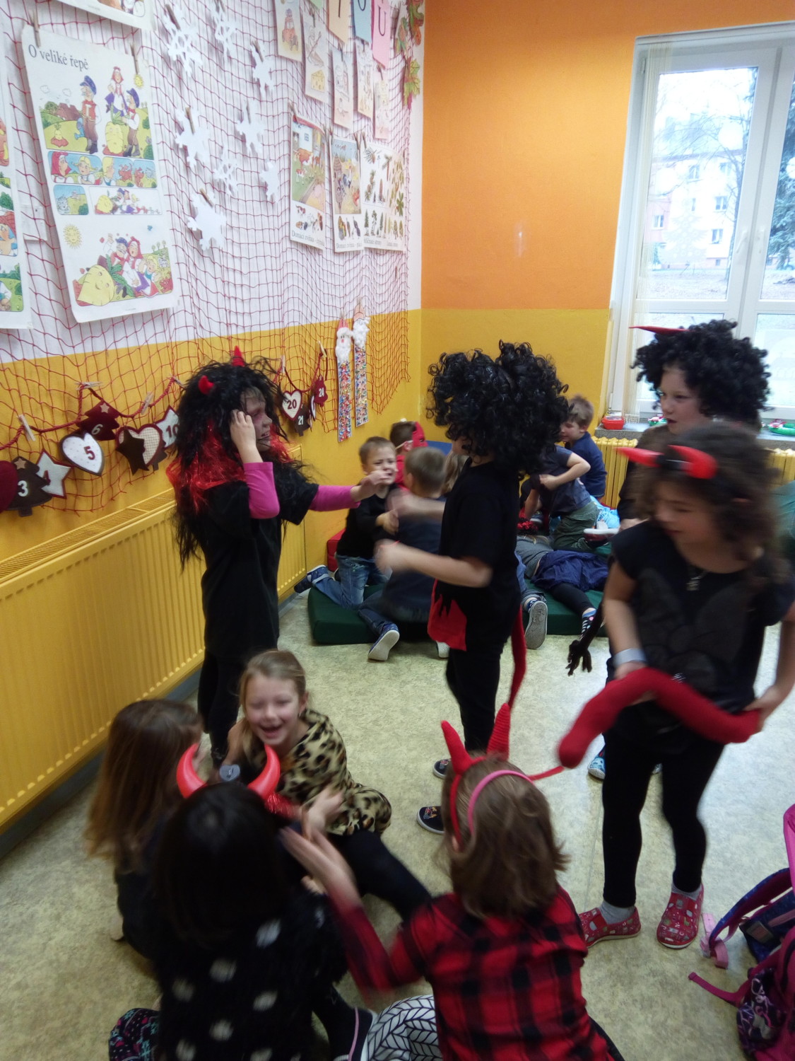 Čekání na ně jsme si zpestřili Pekelnou školičkou, kdy se i děti proměnily v čertíky a společně počítaly, psaly a četly. Vše probíhalo zábavnou formou a bylo prokládáno soutěžemi např. hod bramborou na cíl, čertovský taneček, nošení na zádech, kreslení čerta poslepu,… .