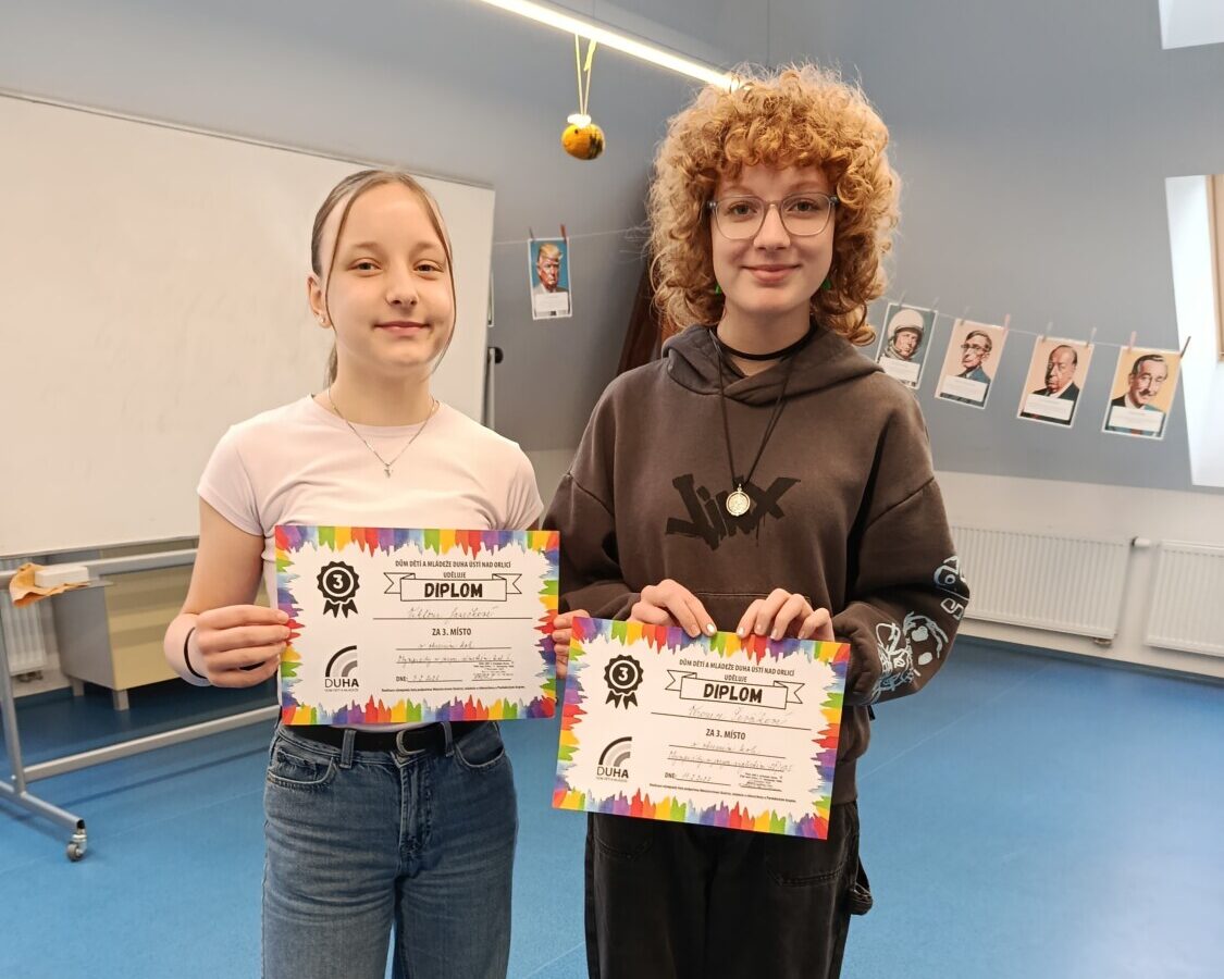 V německém jazyce, který se u nás učí jako druhý cizí jazyk, nás reprezentovaly Viktorie Janečková a Bibiana Baboráková ze 7.B v kategorii AI – tedy pro žáky do 7. ročníku ZŠ a odpovídajících ročníků víceletých gymnázií. V kategorii AII pro žáky 8. a 9. ročníků a odpovídajících ročníků víceletých gymnázií pak postoupili Vu Manh Hung z 8.B a Jan Kučera z 9.B. Všichni se měli německy představit, povídat s porotou o sobě a o rodině. Výborně se dařilo děvčatům, Viki se umístila na pomyslné bronzové pozici a Bibi o jeden bod za ní na 4. místě. Pro Viki to navíc znamenalo postup do krajského kola, které se konalo 4. března na Gymnáziu Dašická v Pardubicích. A Viki se nezalekla a umístila se v Pardubickém kraji na 5. místě.