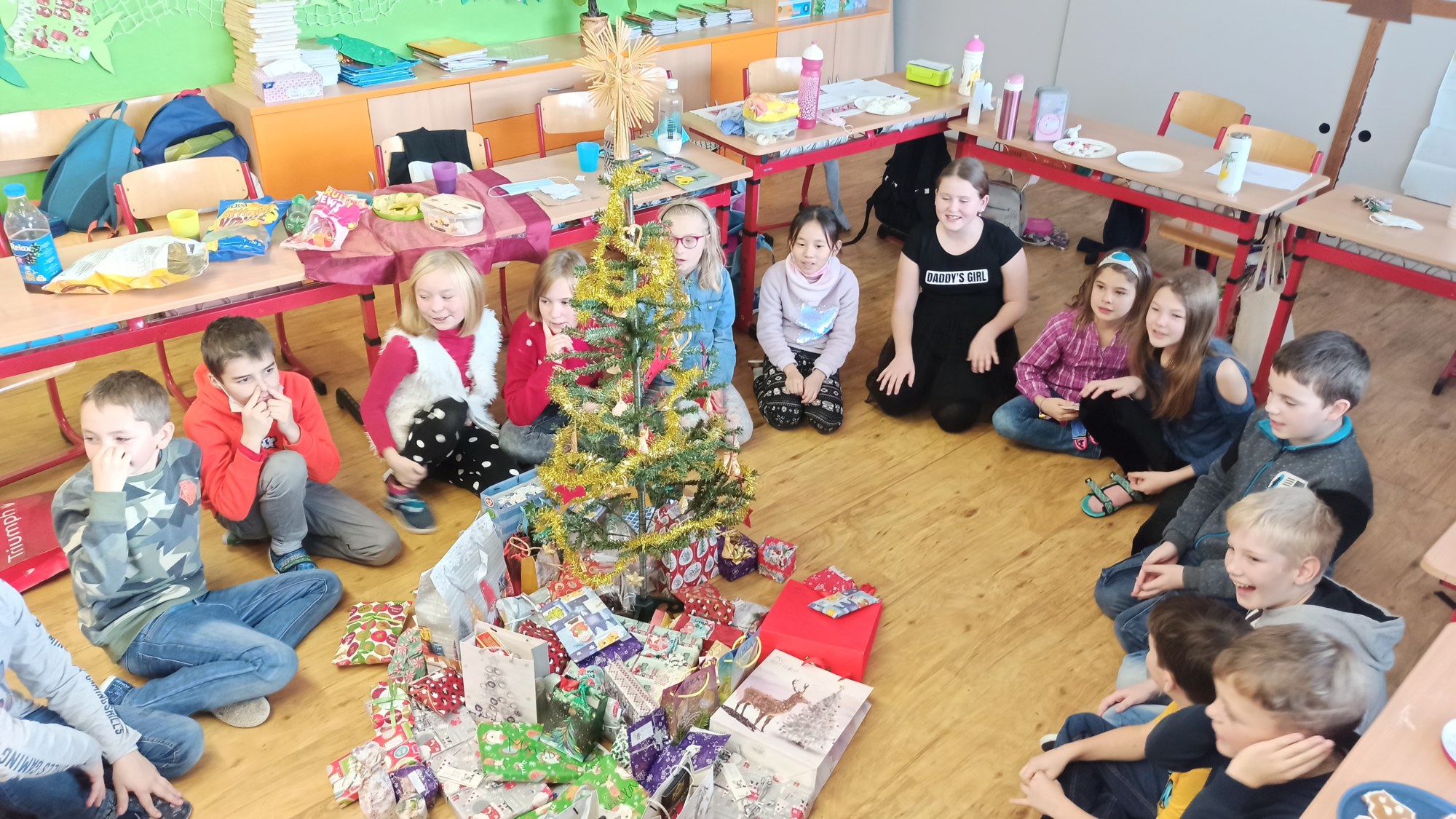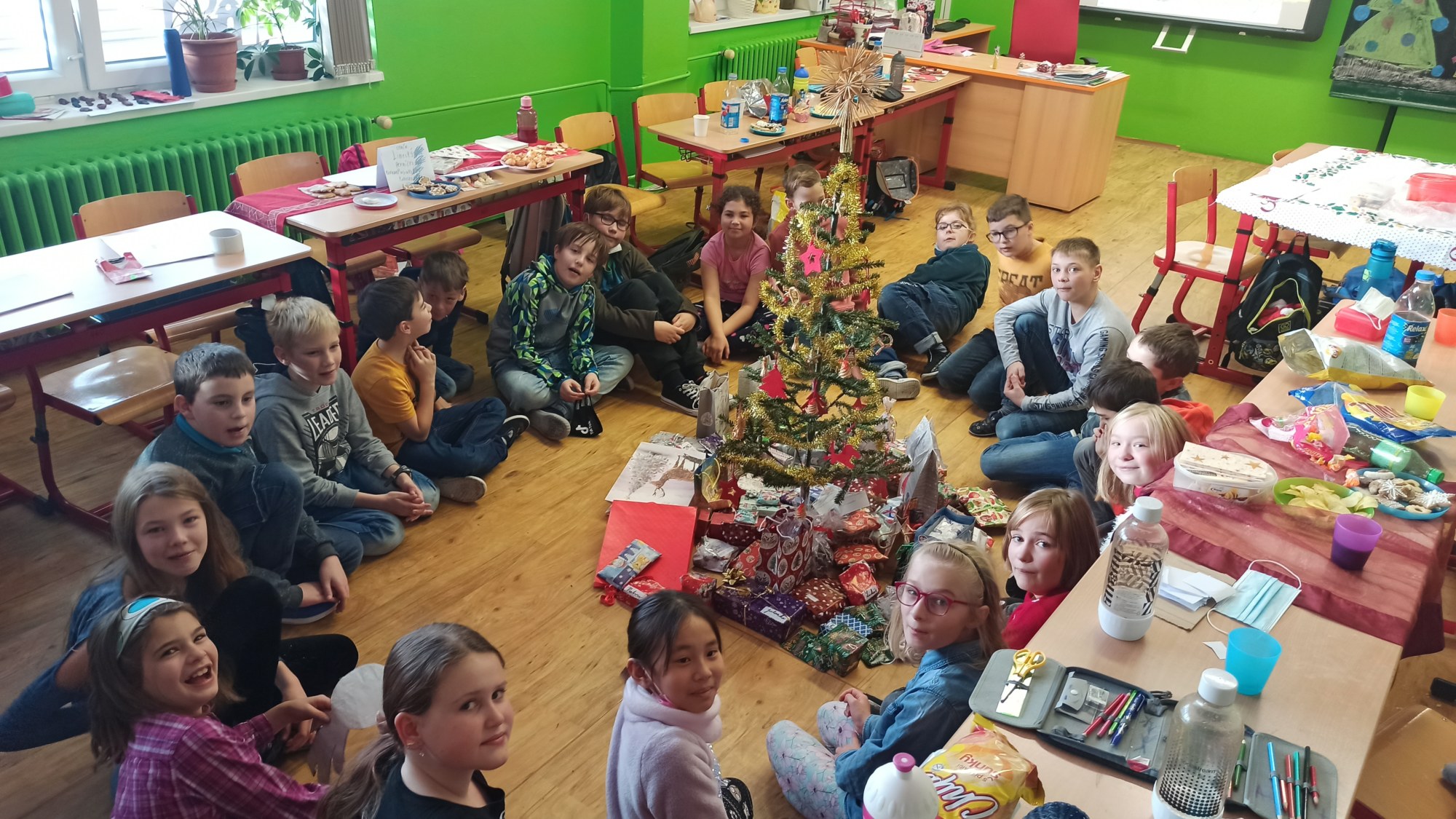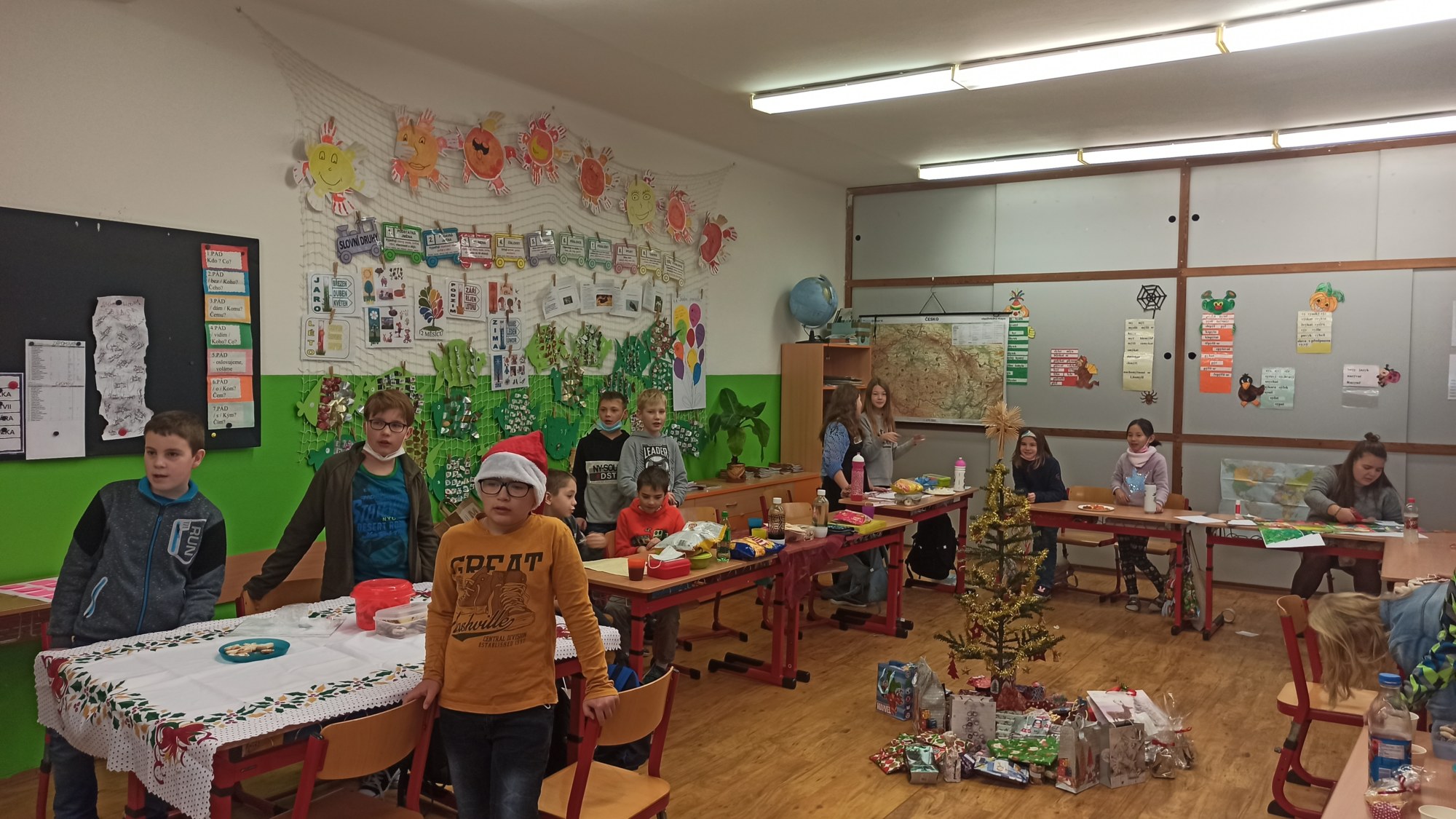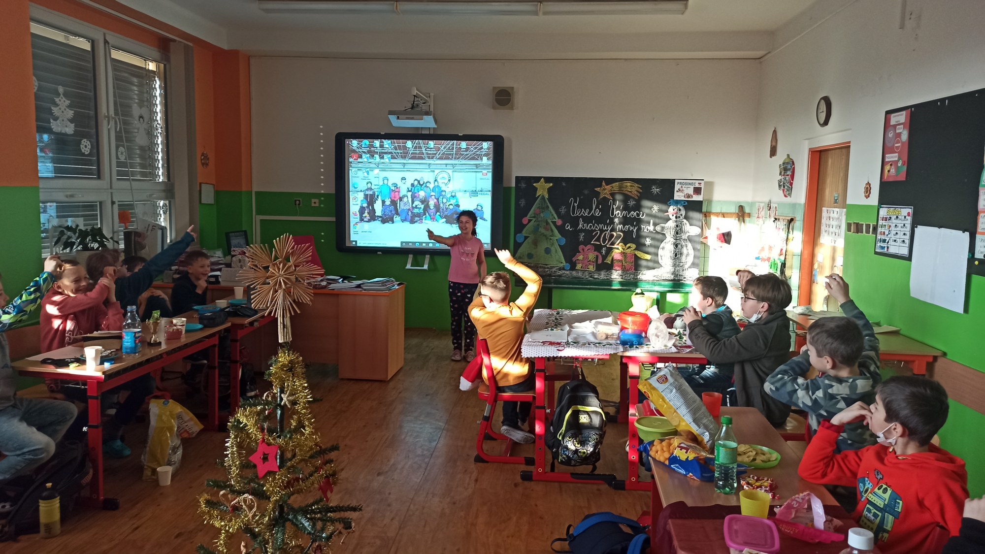 Poslední školní den v roce 2021 jsme si s dětmi náležitě užili. Proběhlo zpívání koled ( dokonce i s ukázkou ve znakové řeči, které se věnuje naše paní asistentka) i připomenutí vánočních zvyků. Děti měly ve skupinkách připravené vánoční úkoly pro zbytek třídy. Proběhl AZ kvíz, vánoční šibenice, hádání z klobouku, zhlédnutí vlastnoručně natočeného filmu i vtipy s hádankami. Na závěr každý žák pronesl novoroční přání určené třídě. Potom jsme se již „ vrhli“ na rozbalování dárečků, které si děti navzájem nadělily.