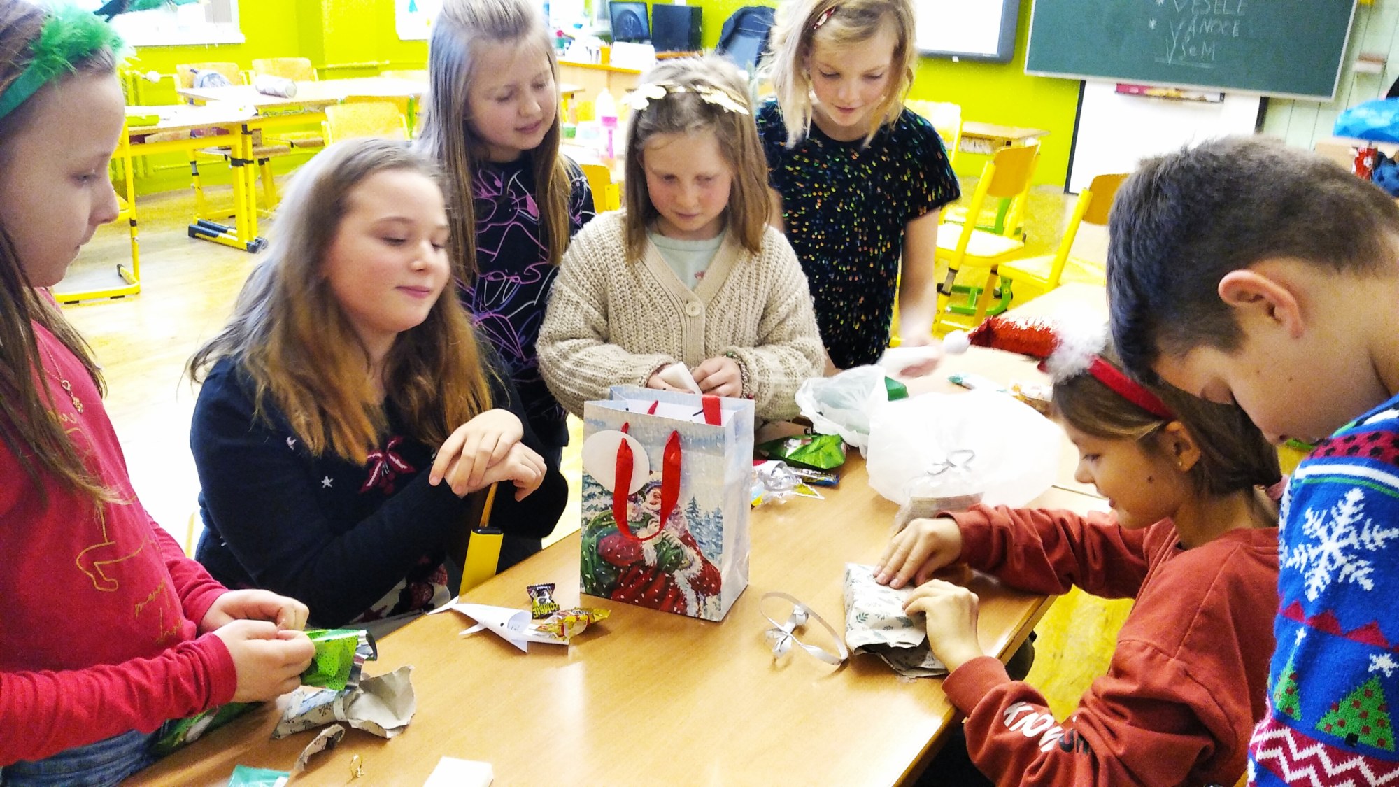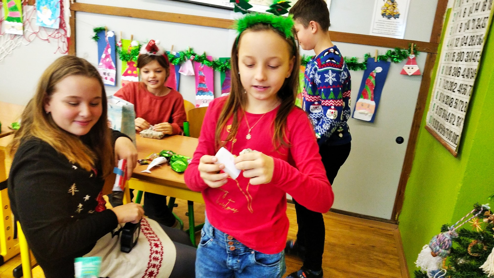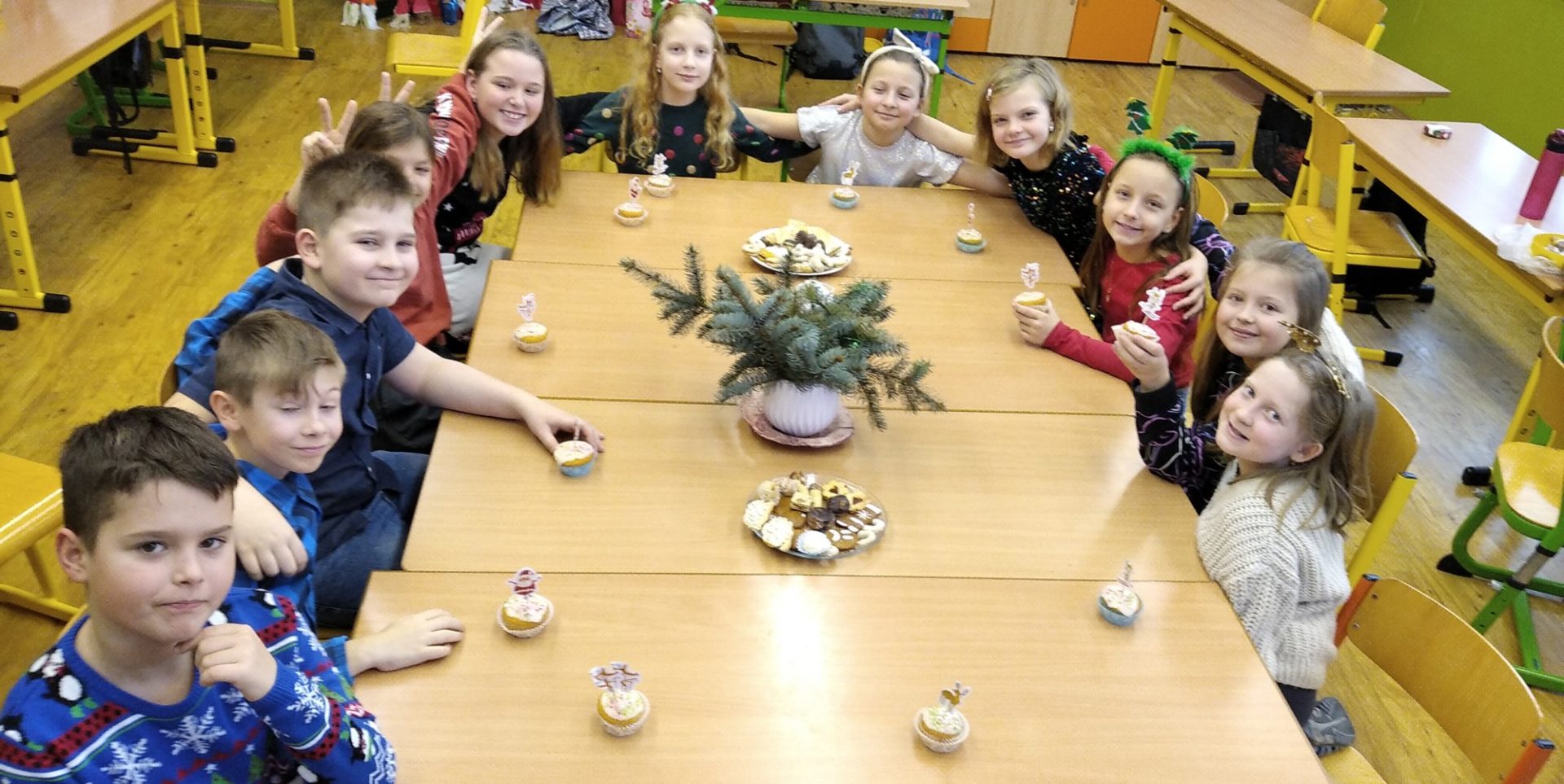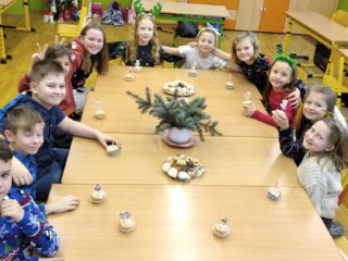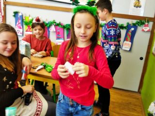 Ve čtvrtek 22.prosince se žáci 4.B těšili hlavně na rozdávání dárečků a povídání o Vánocích. Nejdříve jsme společně svačili výborné cupcakes od Matouška. Moc za ně děkujeme. Pak jsme společně určovali podle melodie názvy vánočních písniček, které jsme si také zazpívali. Rozbalování vánočních dárků všechny děti moc potěšilo. Na závěr si žáci vyrobili hezké vánoční přání a společně jsme si popřáli krásné Vánoce.