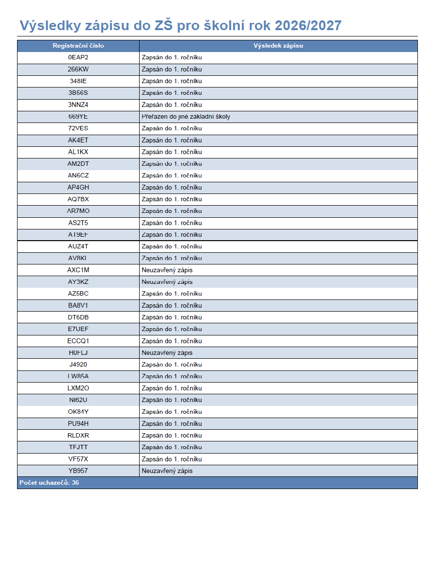 Výsledky zápisu do 1. ročníku školního roku 2026/2027
