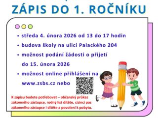 Zveme budoucí prvňáky na zápis do prvního ročníku naší školy. Zápis se uskuteční ve středu 4. února 2026 v budově 1. a 2. tříd na ulici Palackého od 13 do 17 hodin. Více informací se dozvíte z přiloženého plakátu nebo na stránkách školy v záložce pro rodiče.