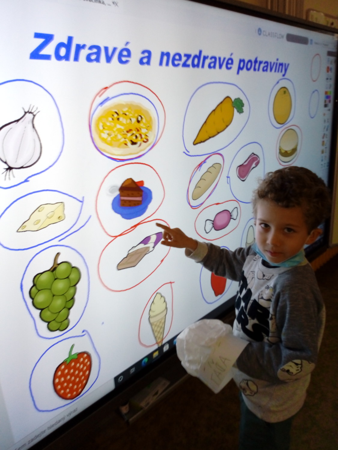 Nejdříve se žáci seznámili s problematikou zdravé výživy. Společně na interaktivní tabuli pracovali s obrázkovými programy, třídili potraviny na zdravé a nezdravé. Navrhovali také, co je správné jíst v průběhu dne.