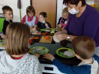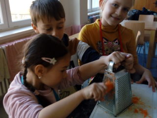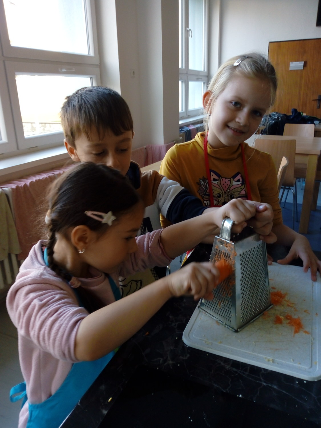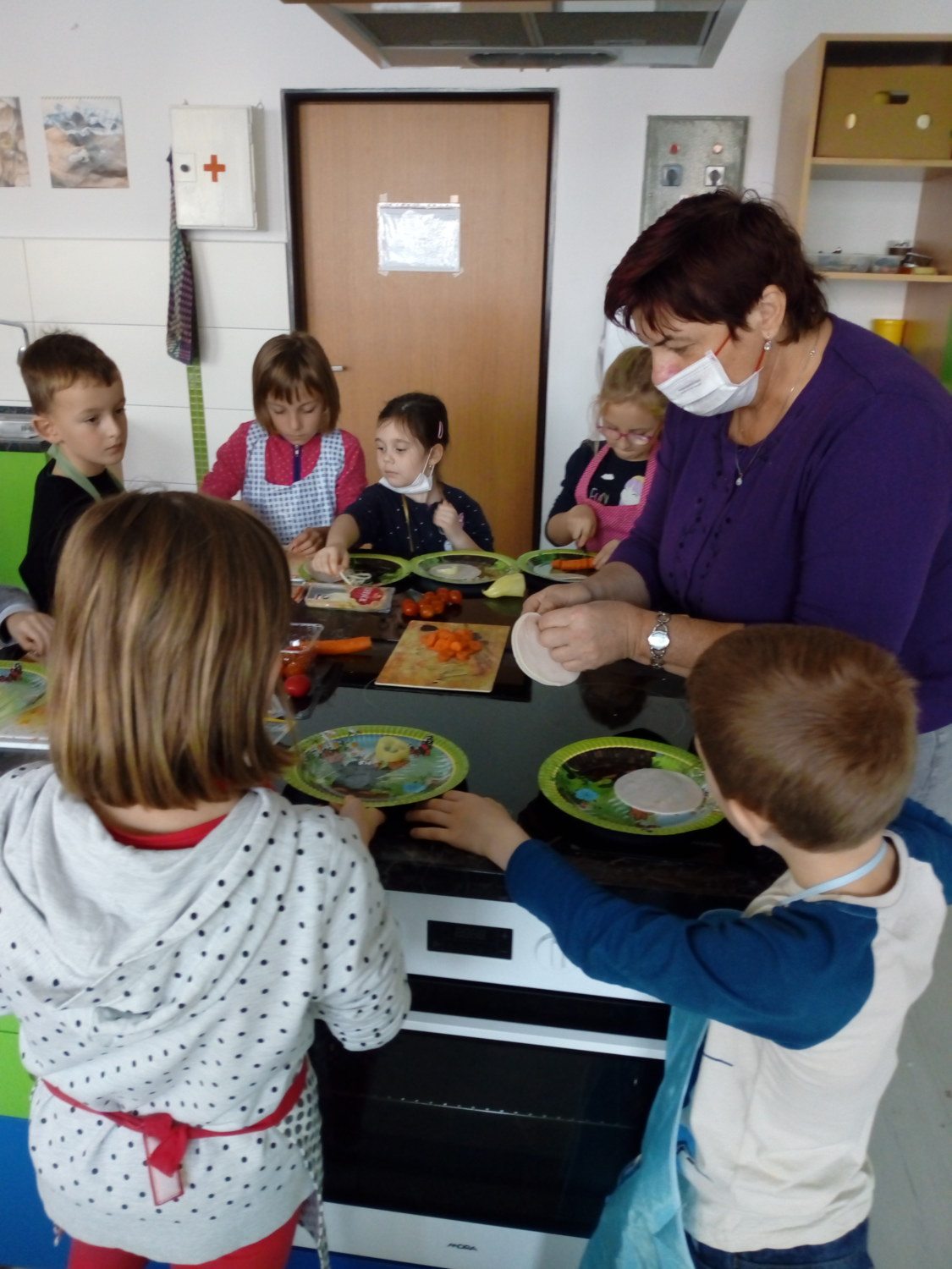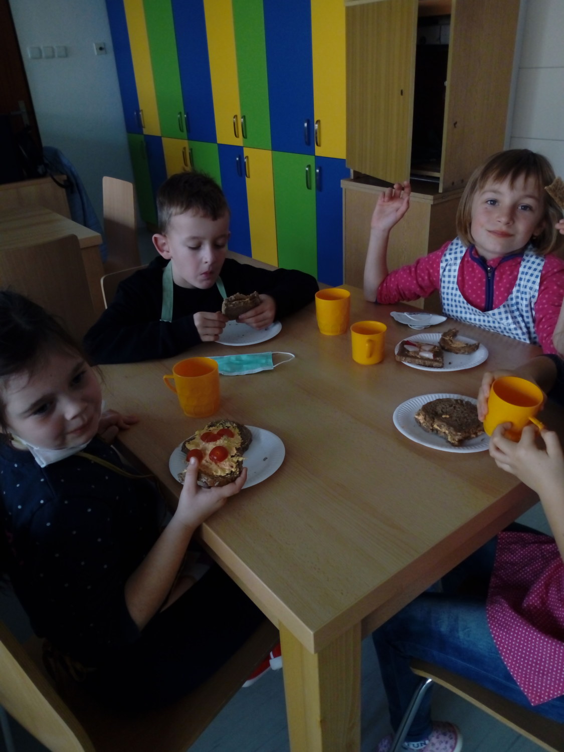 Potom se děti přesunuly do školní kuchyňky. Společně s paní Kunertovou připravovaly zdravou svačinku. Dělaly tvarohovo-mrkvovou pomazánku, samy si ji namazaly na chleba, ozdobily zeleninou a poté snědly. Na ozdobný talíř vytvářely legrační obličej.