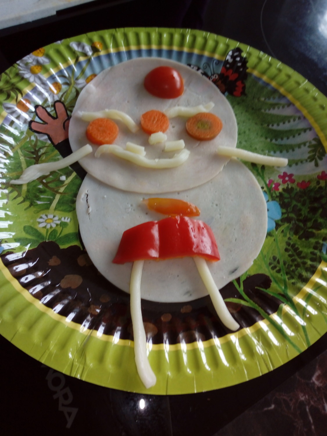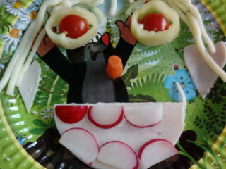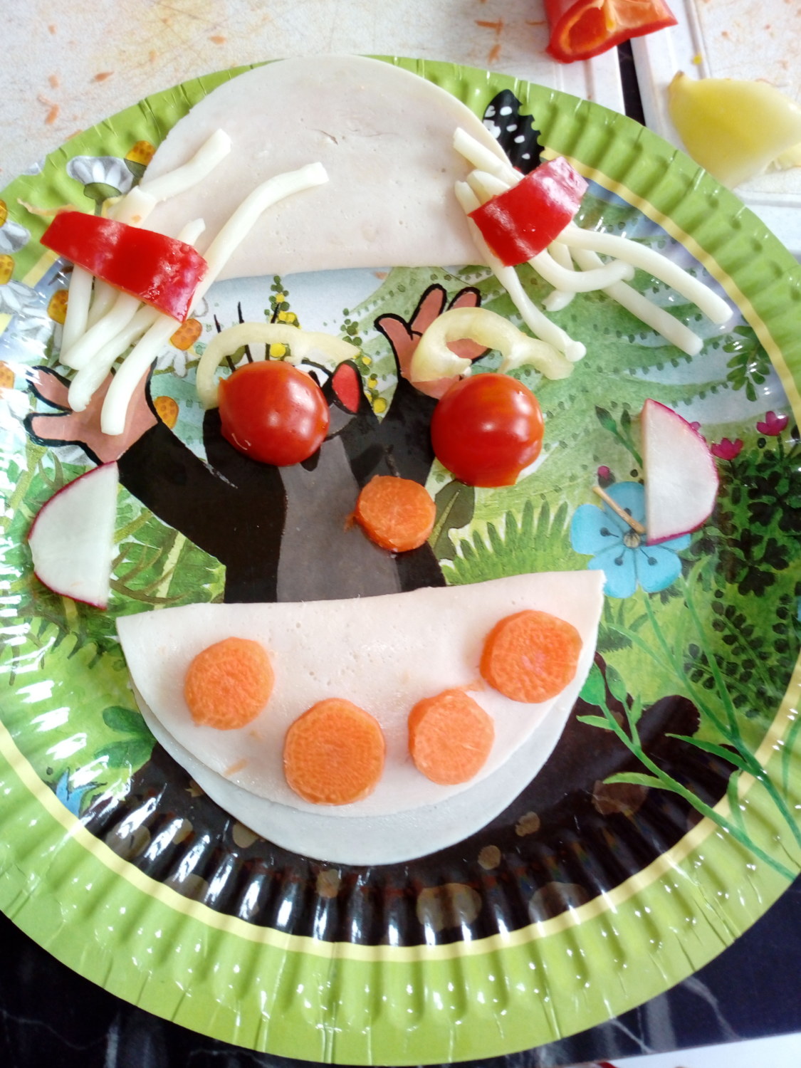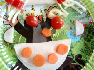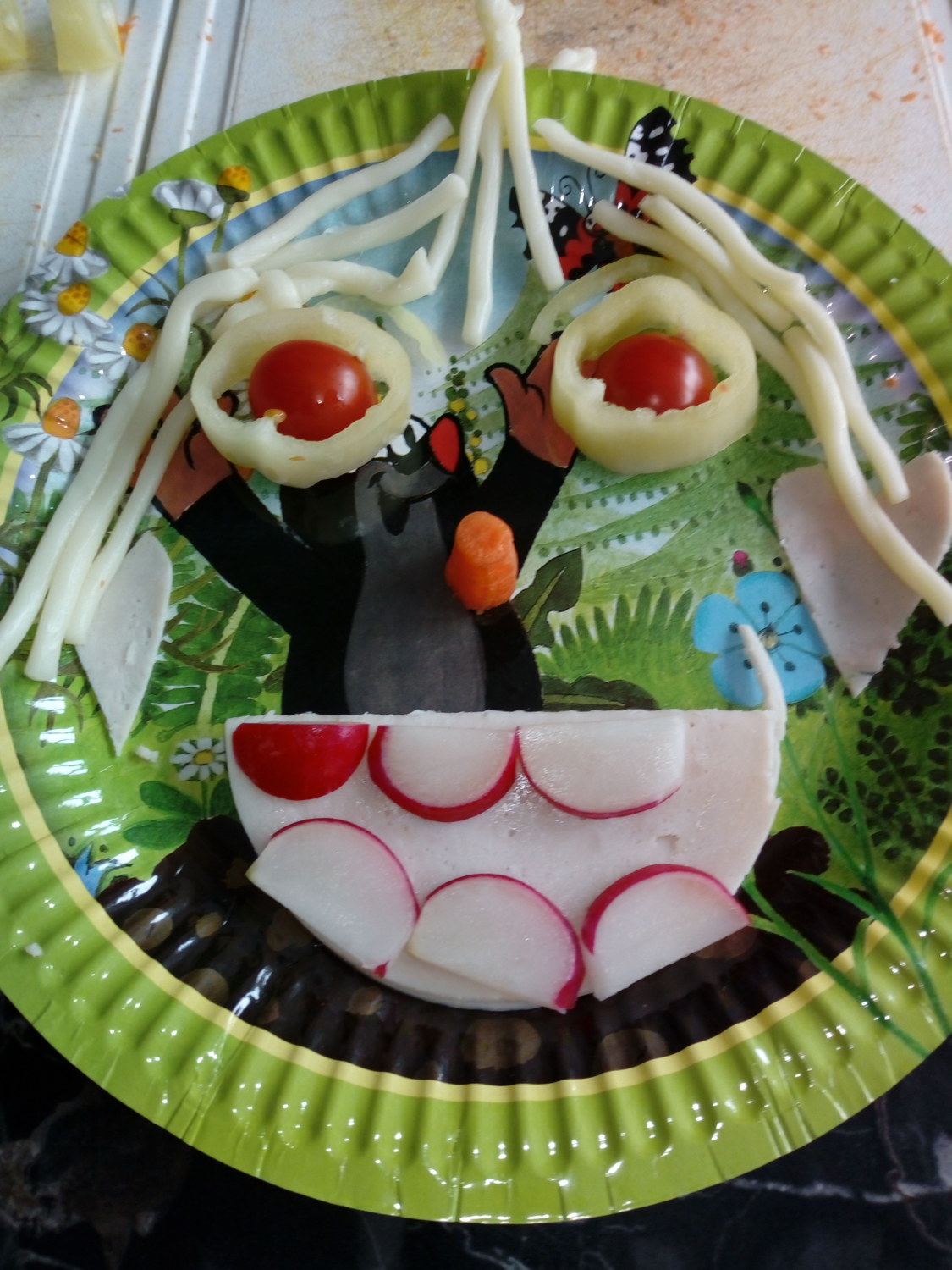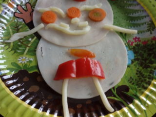 Potom se děti přesunuly do školní kuchyňky. Společně s paní Kunertovou připravovaly zdravou svačinku. Dělaly tvarohovo-mrkvovou pomazánku, samy si ji namazaly na chleba, ozdobily zeleninou a poté snědly. Na ozdobný talíř vytvářely legrační obličej.