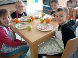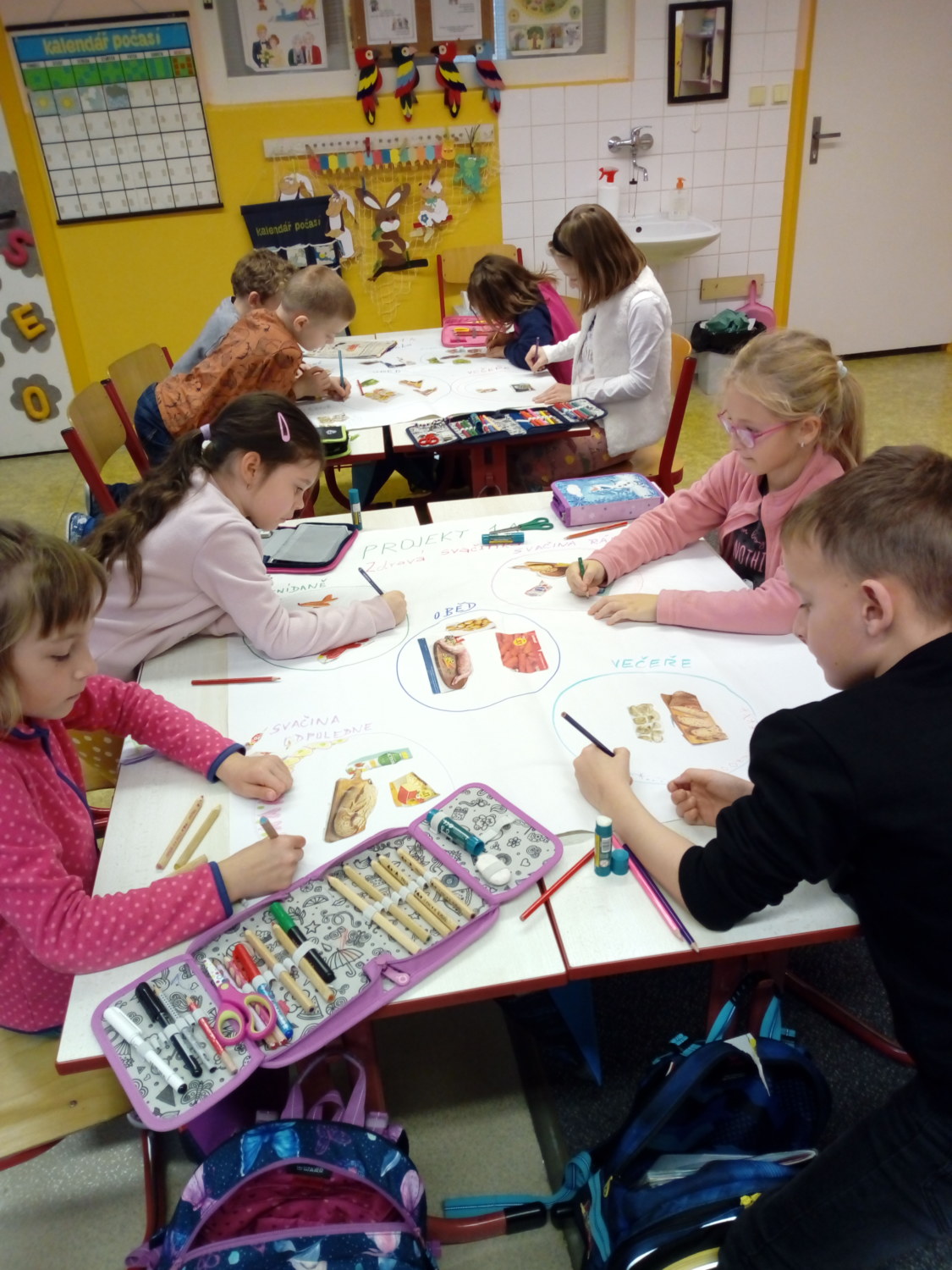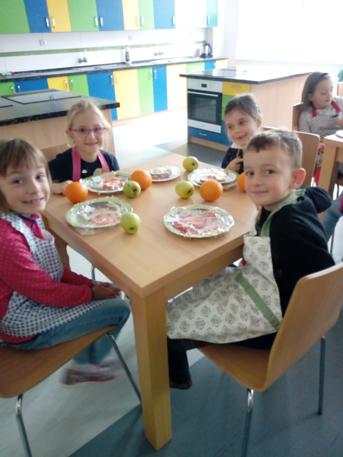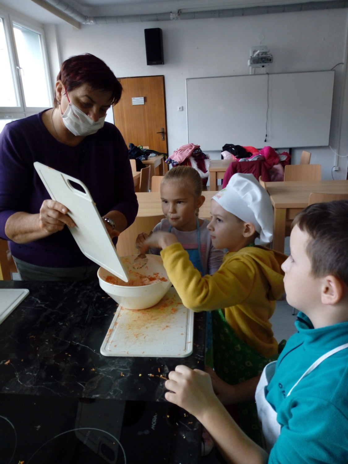 Začátkem listopadu čekal prvňáky první projektový den, který se věnoval zdravé výživě. Navštívila nás kuchařka, paní Kunertová, která se jim po celý den věnovala. Předávala jim své zkušenosti s přípravou pokrmů.