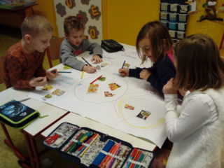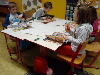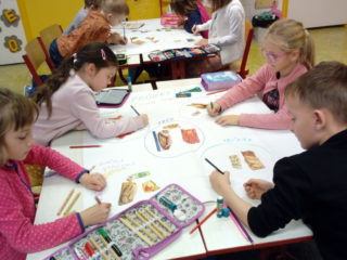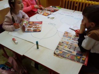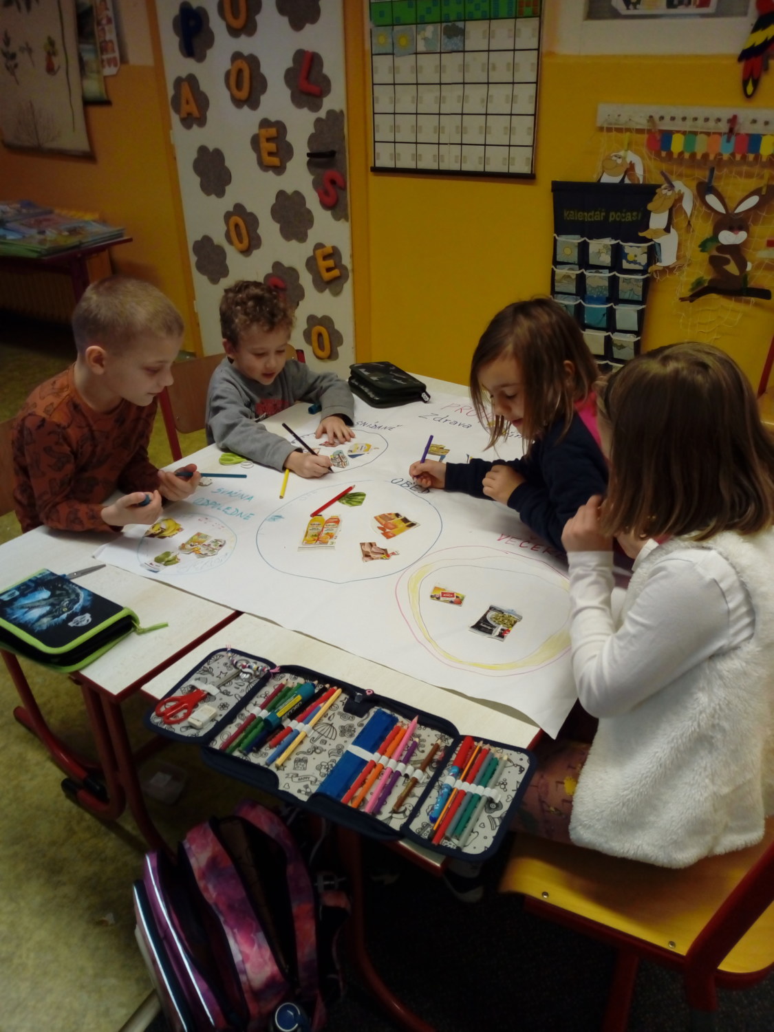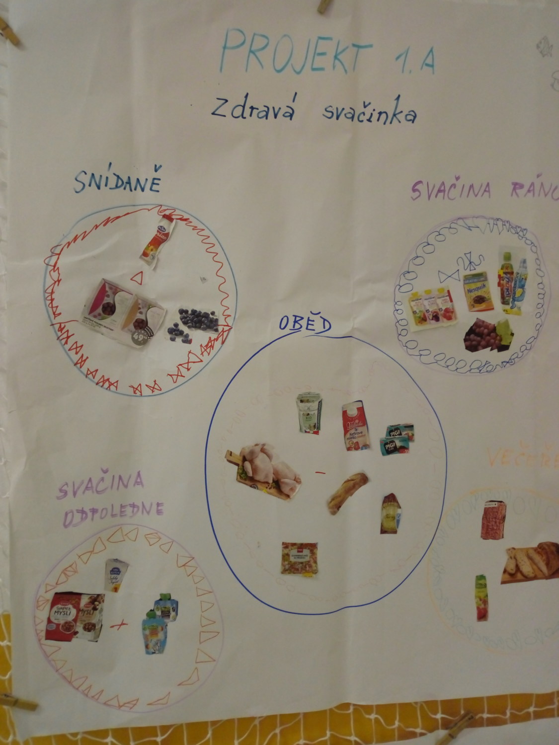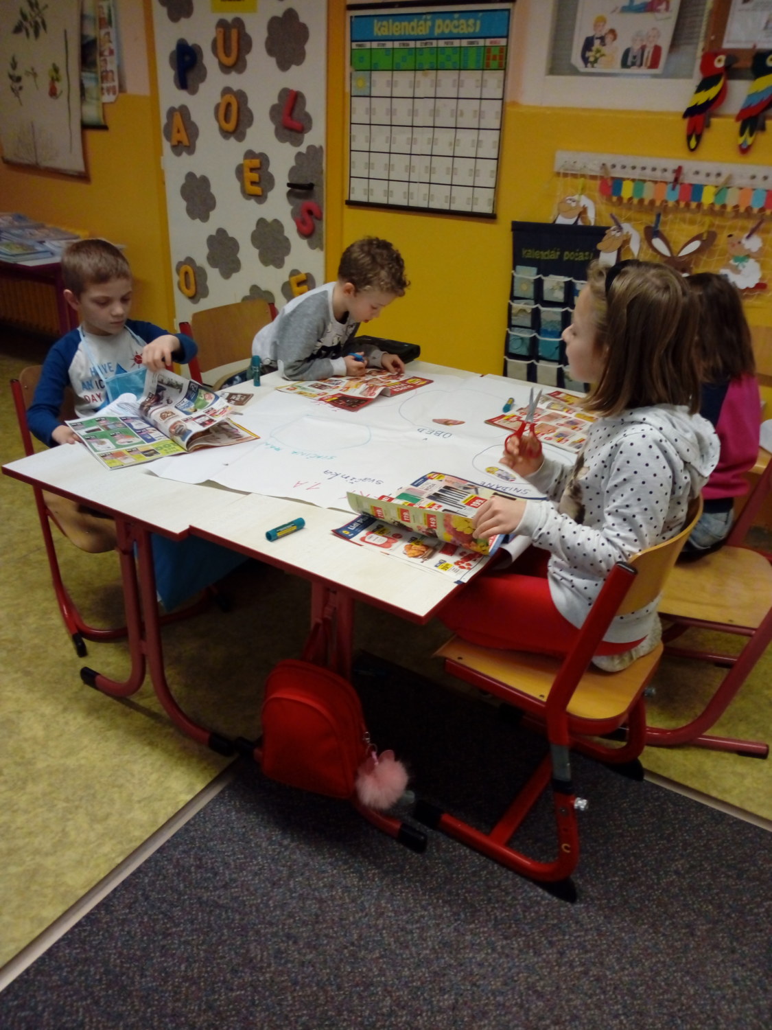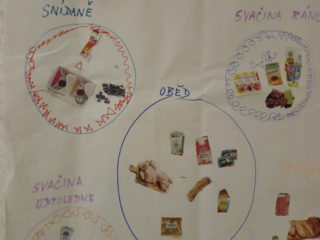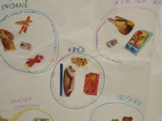 Ve třídě nakonec ve skupinách dělaly plakát. Z letáků vystřihovaly potraviny a sestavovaly z nich jídelníček na celý den.